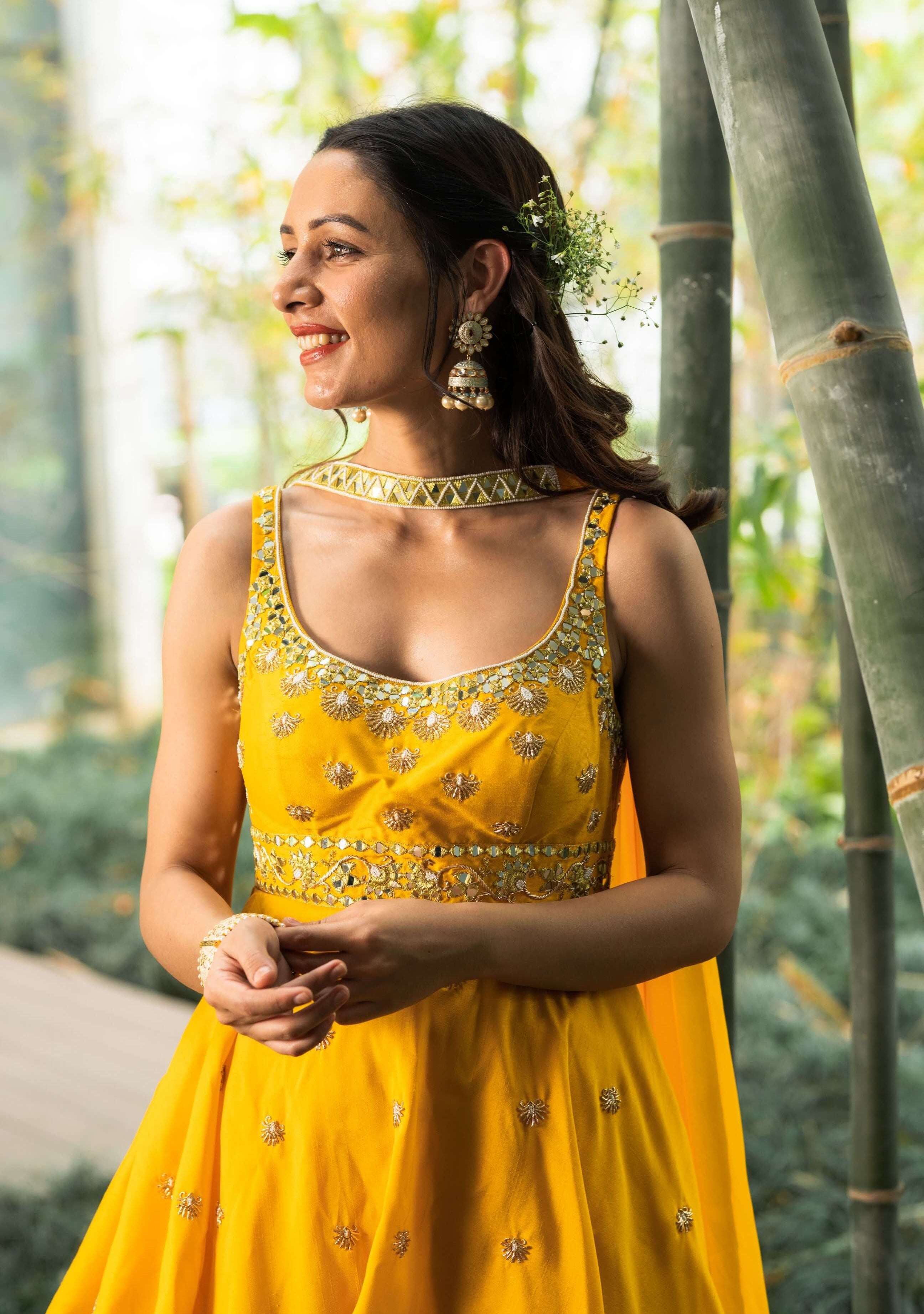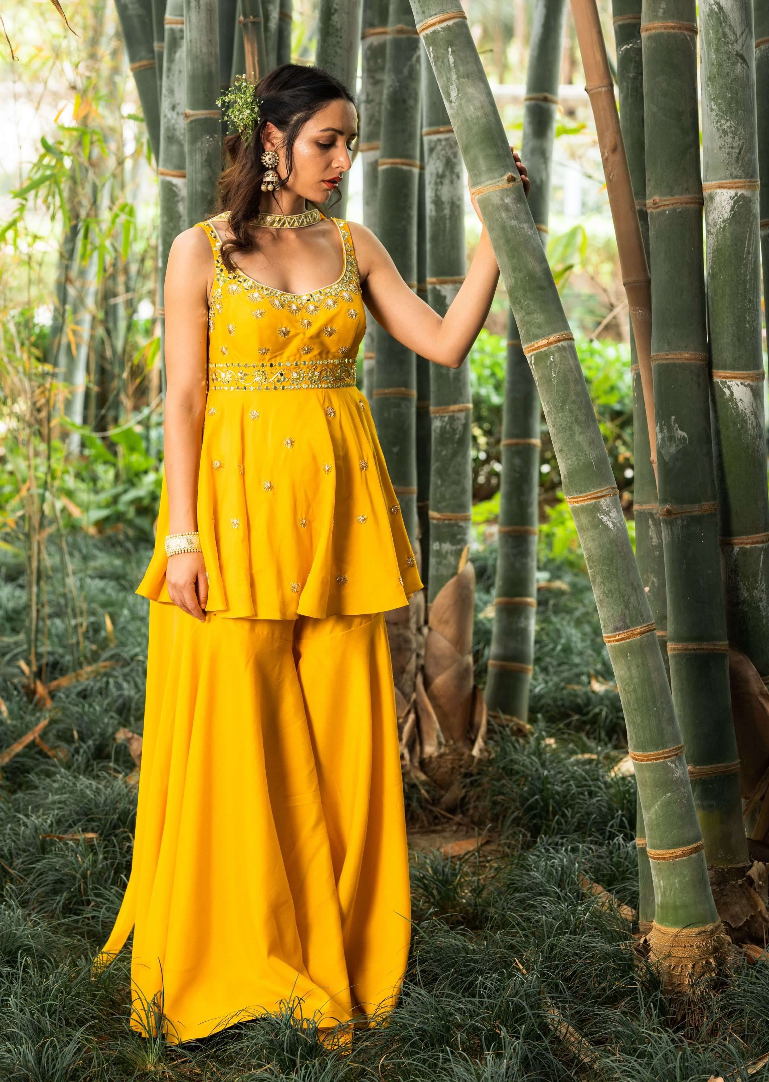 Elevate your attire with the yellow silk peplum kurta paired elegantly with silk sharara pants and a georgette choker dupatta. The peplum kurta, crafted from luxurious silk, exudes elegance with its structured silhouette and intricate detailing. Complementing this ensemble are the silk sharara pants, offering comfort and a graceful drape. Complete your look with the georgette choker dupatta, adding a touch of sophistication and enhancing the outfit's overall appeal. Ideal for festive occasions and celebrations, this ensemble combines traditional charm with modern style, ensuring you stand out with refined grace and timeless allure.
