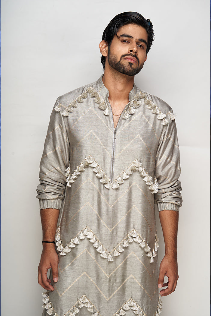 Step into elegance with our gray zigzag banarasi silk bomber kurta, featuring a unique zigzag pattern that adds a modern twist to traditional craftsmanship. The luxurious silk fabric drapes beautifully, providing both comfort and style.