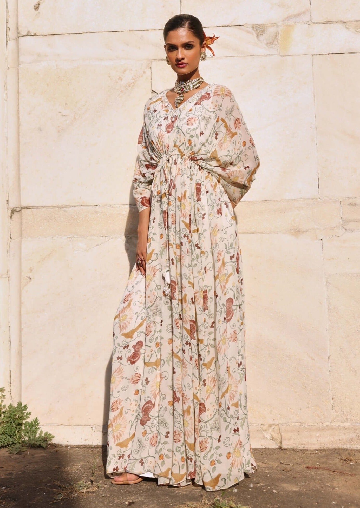 Enhance your style with the Aarvi ivory printed full-length draped kaftan, featuring a stunningly embellished neckline. This exquisite piece drapes elegantly, providing a chic and refined silhouette that is perfect for formal events and celebrations. Embrace sophistication and grace with this timeless ensemble, designed to make a lasting impression.