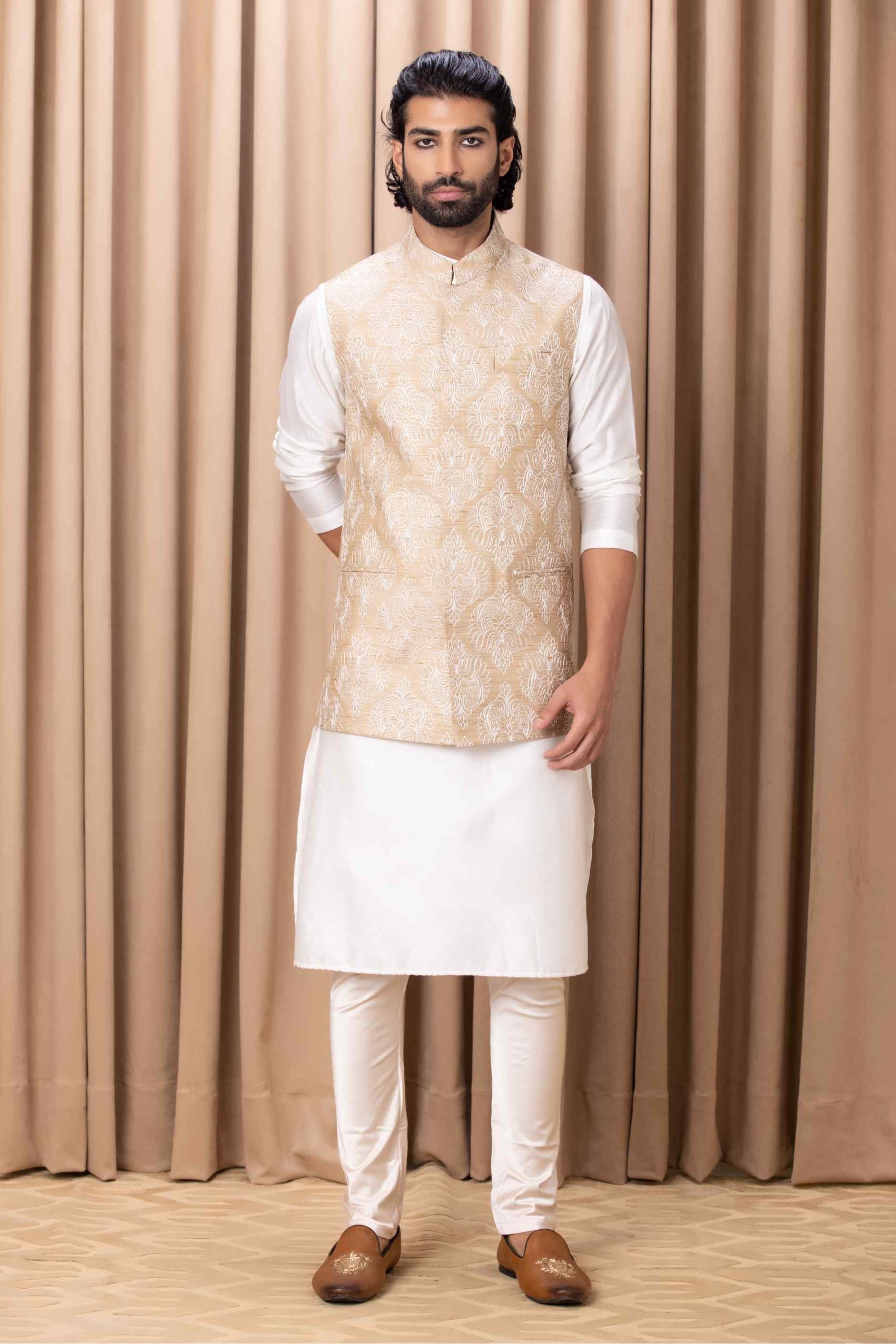 Embrace timeless sophistication with our bespoke beige nehru jacket, featuring intricate embroidery and refined minimal details. This versatile piece is perfect for both indoor and outdoor occasions, offering a touch of elegance to any ensemble. Paired with an ivory white kurta and ivory churidaar, it creates a seamless and distinguished look. Ideal for the modern groom or groomsmen who appreciate classic style with contemporary charm, this outfit ensures a polished and memorable appearance at any special event.