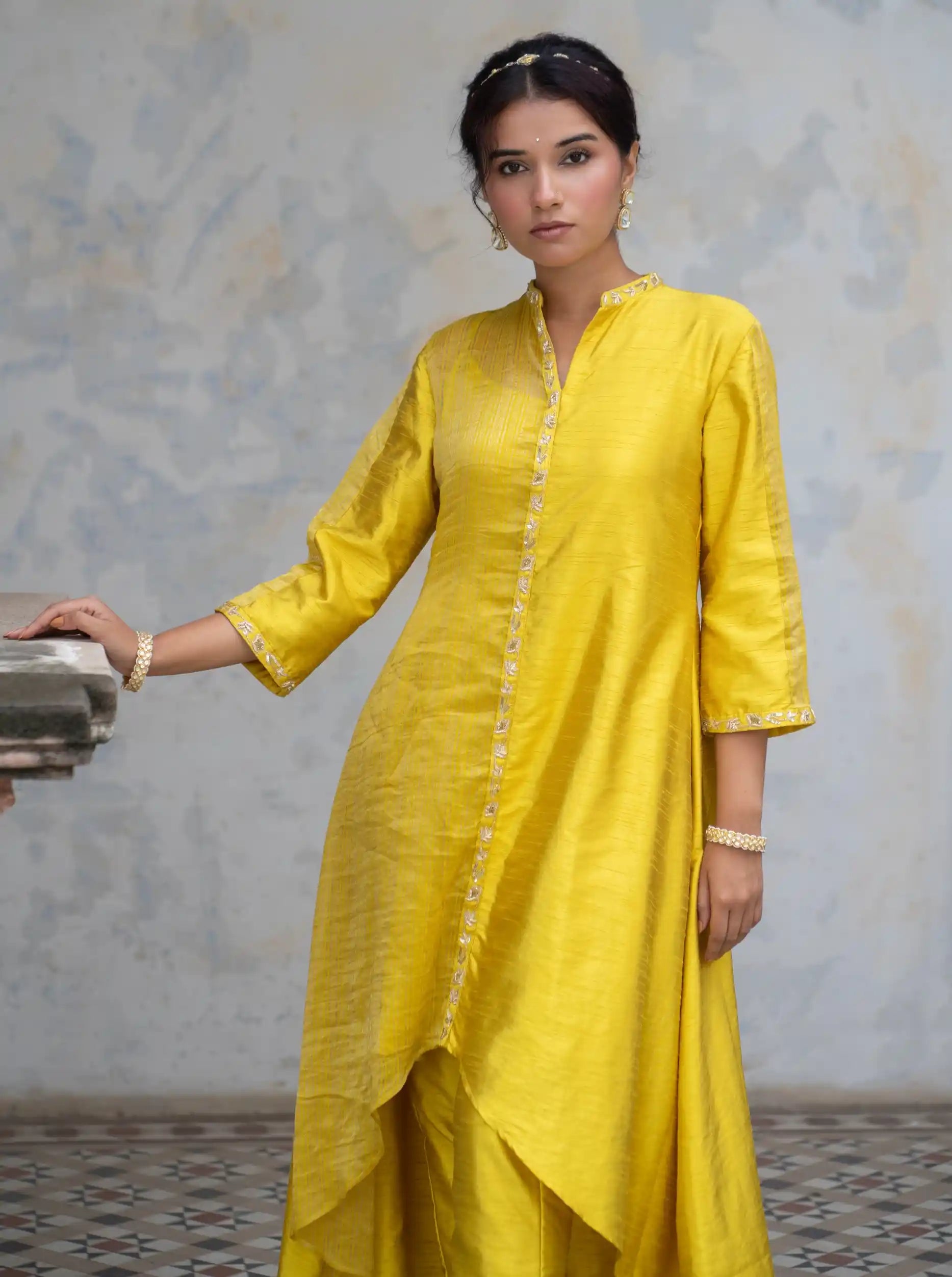 Elevate your style with the Acacia Green Asymmetric Embroidered Kurta Set. This striking ensemble features a rich acacia green kurta with a contemporary asymmetric cut, adorned with intricate embroidery that adds a touch of sophistication. The set includes a complementary slip and matching pants, creating a harmonious and chic look. Ideal for both formal events and festive occasions, this kurta set seamlessly blends modern design with classic elegance.