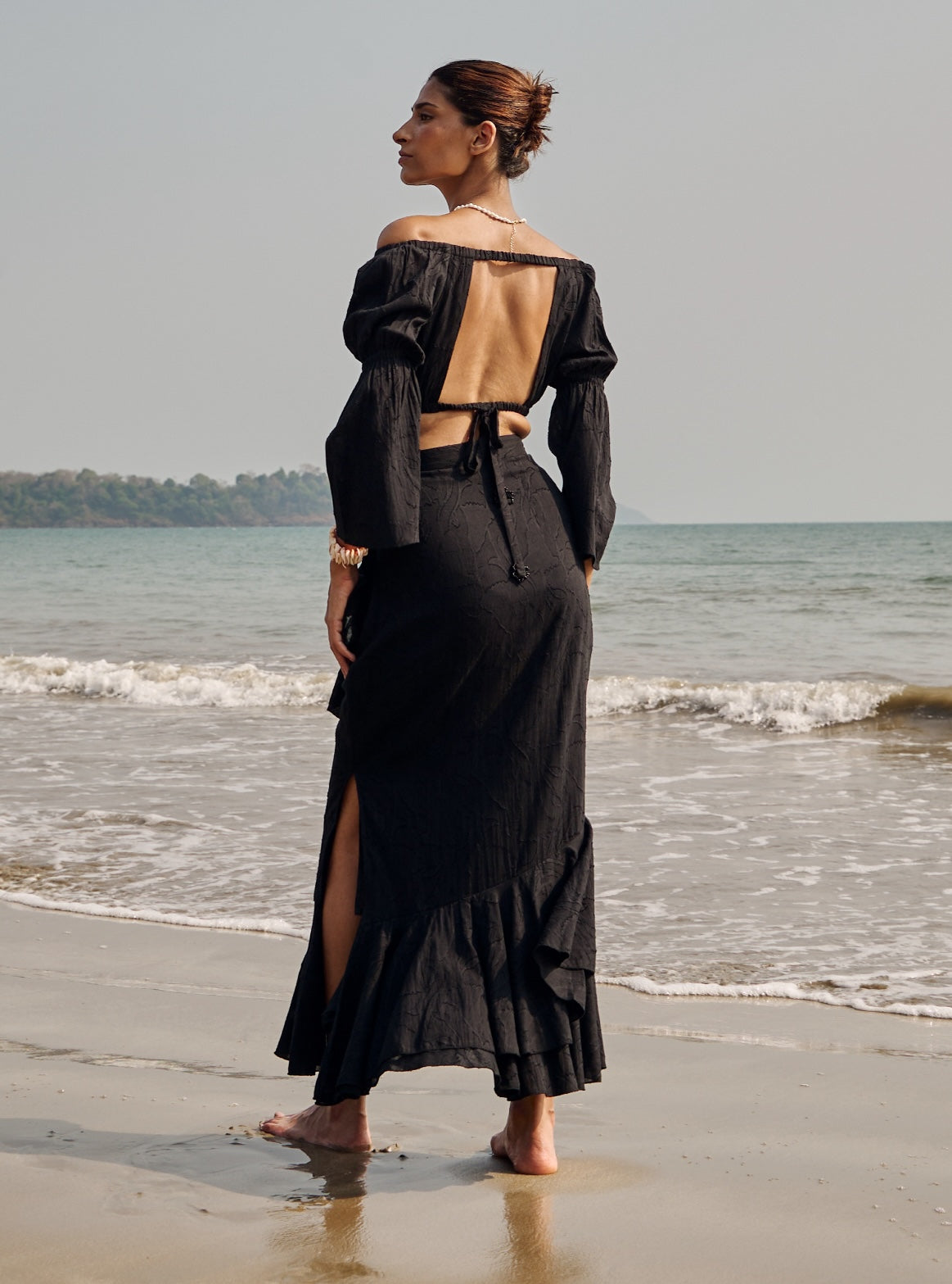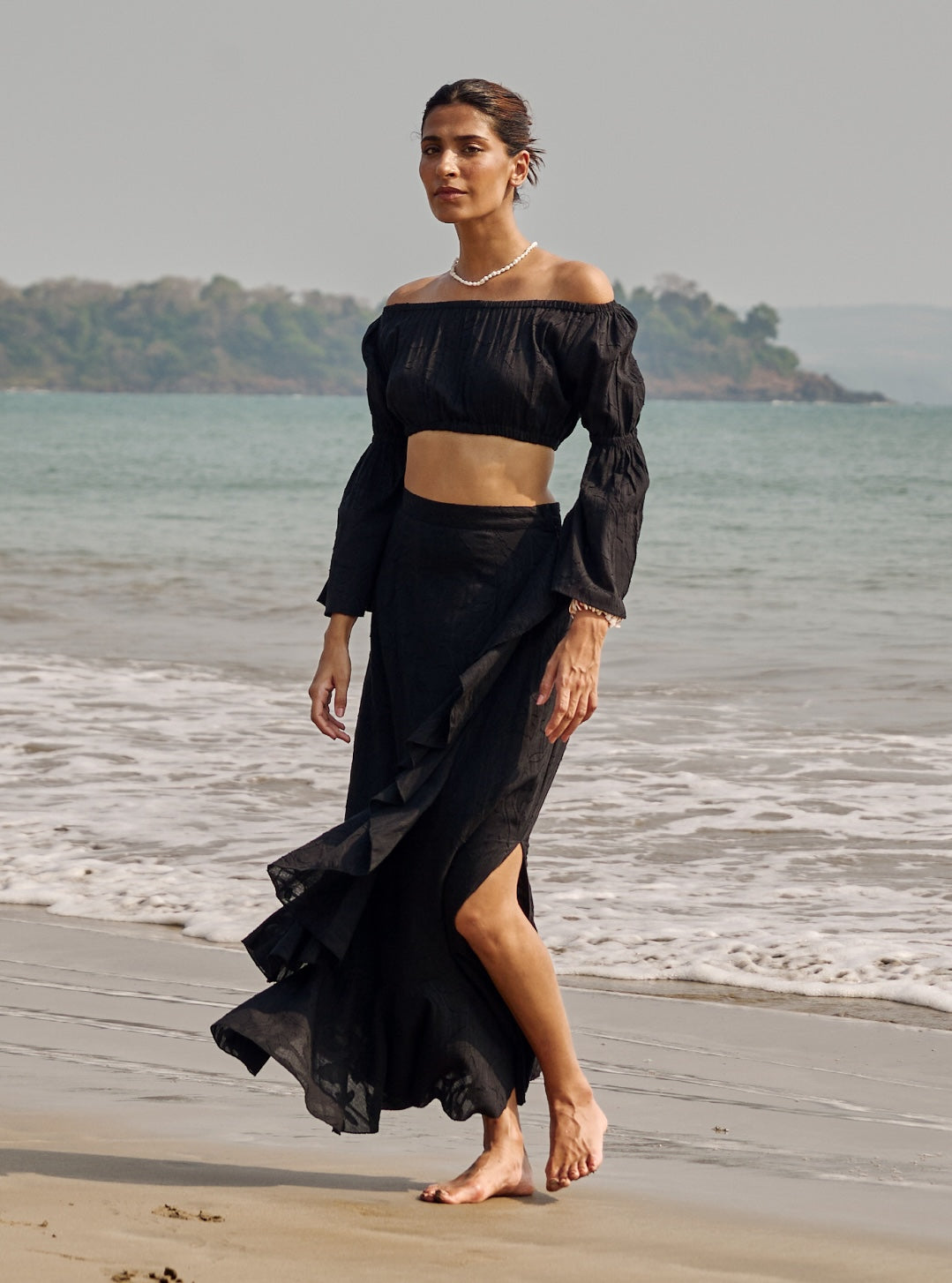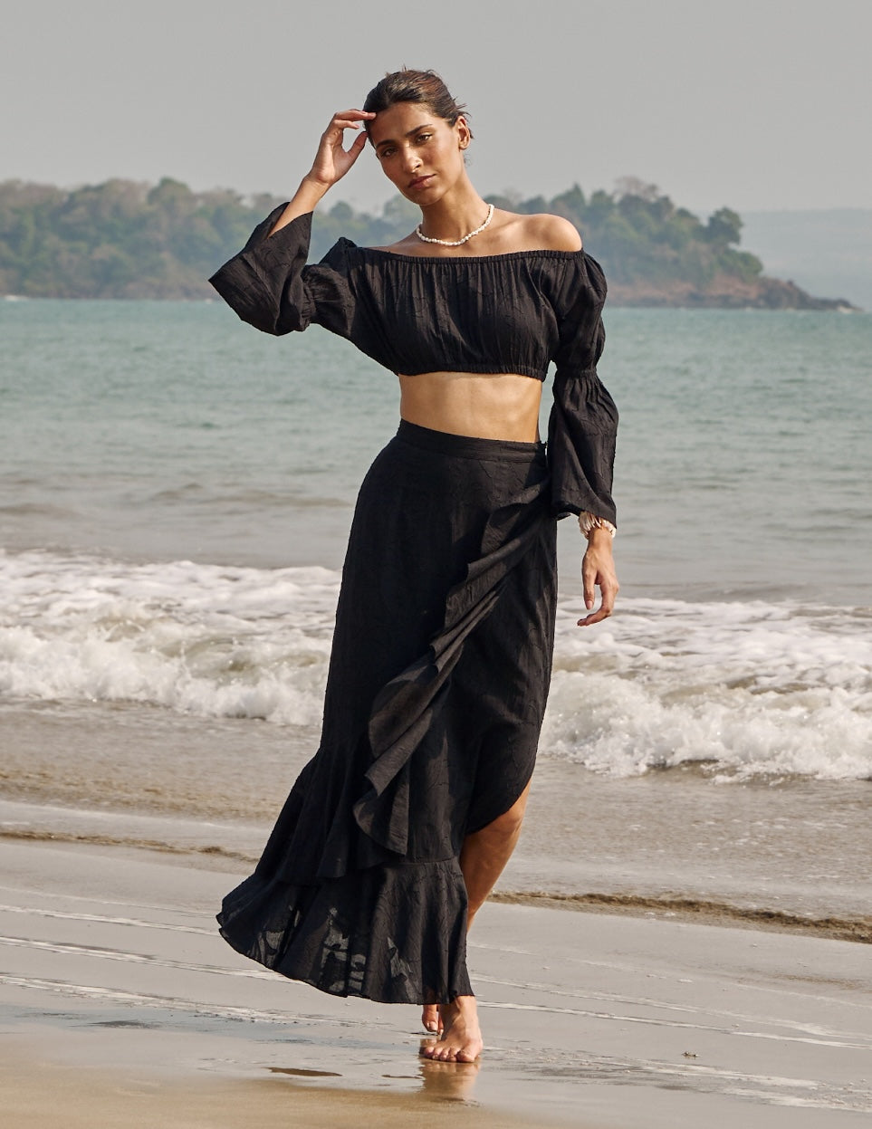 Elevate your summer style with the ultimate duo—the Adey crop top and ruffle skirt. The Adey crop top features a cropped, elasticated design with a backless cut and voluminous sleeves that create a dramatic flair while accentuating your waist. Pair it with the Adey ruffle skirt, designed with exaggerated ruffles, feather-light fabric, and a timeless black hue. The high-waisted silhouette and side slit of the skirt reveal just the right amount of skin, offering a striking and coordinated look that's perfect for any occasion. Together, these pieces deliver a chic and unforgettable ensemble, ideal for making a statement at summer events and beyond.