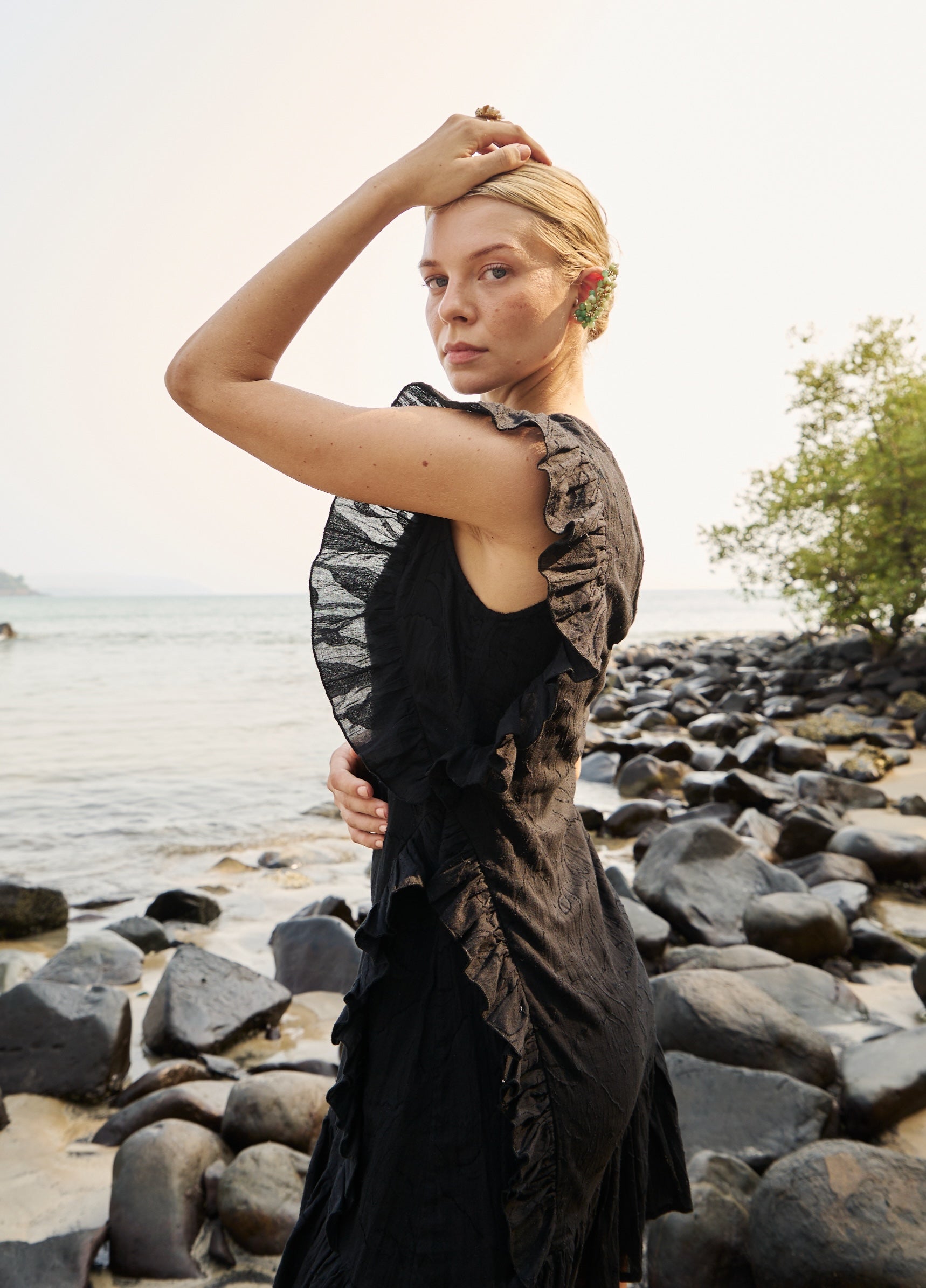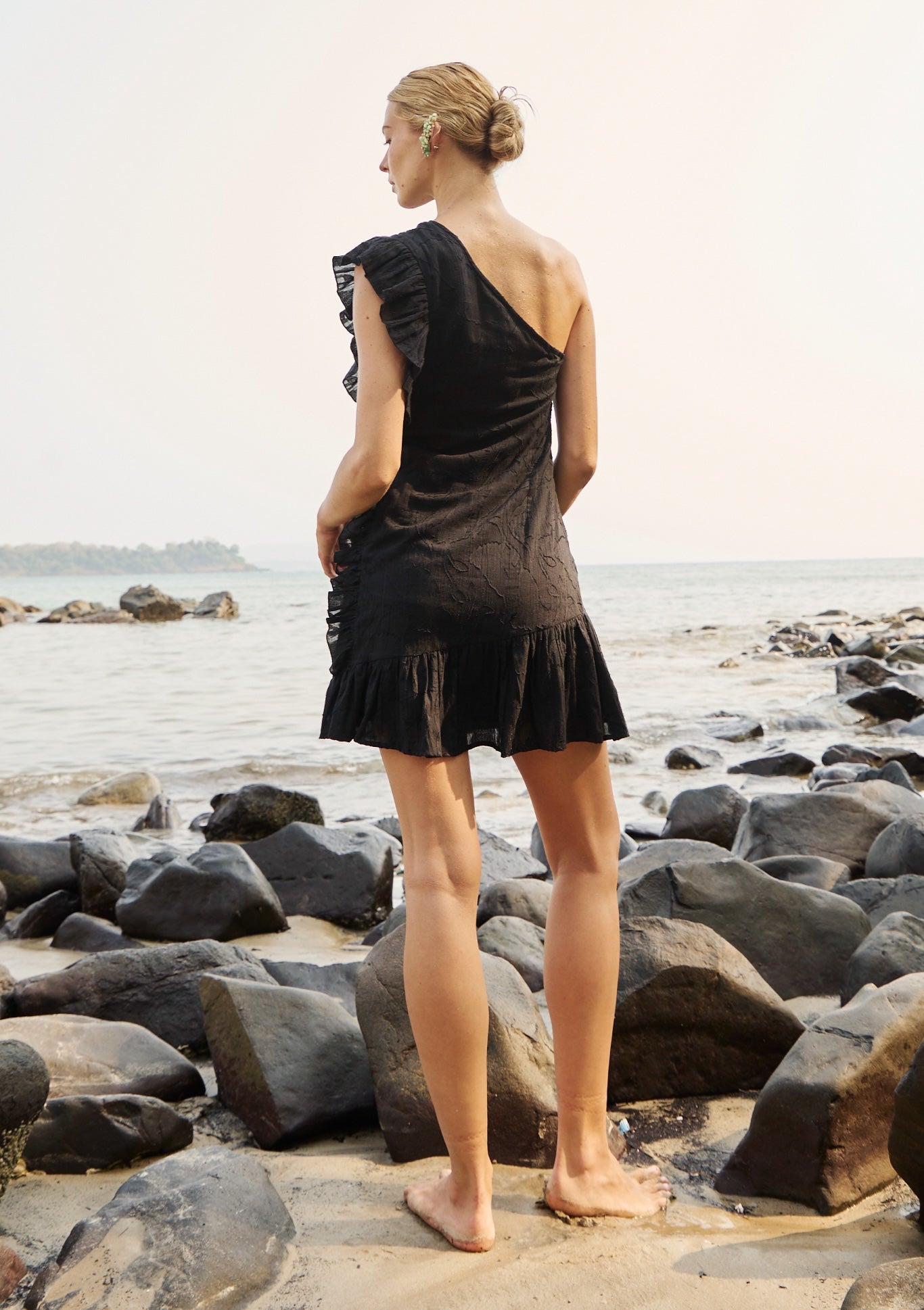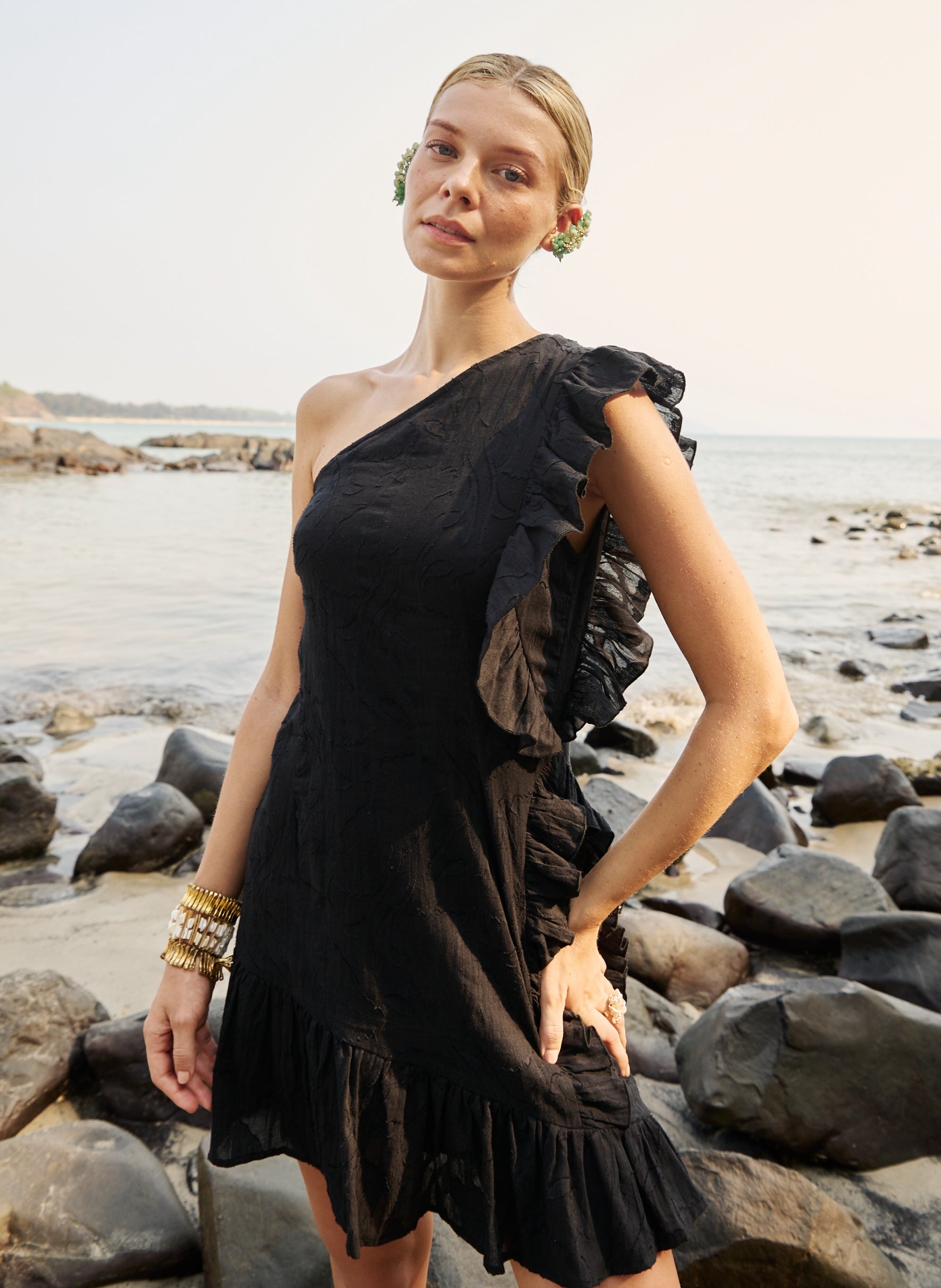 Asymmetry at its best, the Adey dress is a stunning mini with ruffled details, elegantly dipped in all-black. Crafted from self-patterned jacquard cotton, this dress exudes sophistication and versatility. Ideal for transitioning effortlessly from AM to PM, it combines style and functionality without a hitch. True to size and designed for a flattering fit, the Adey dress is your go-to choice for a chic and adaptable look.