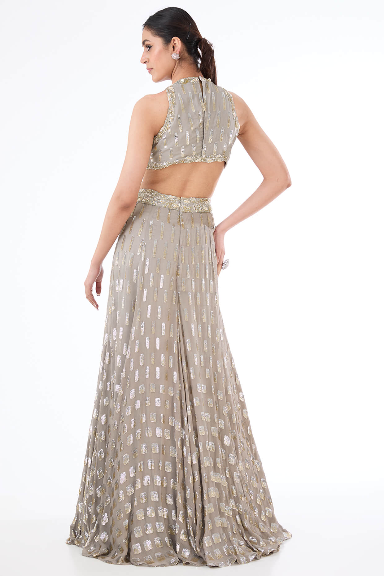 Perfect for special occasions, the gown's subtle gray hue and detailed embellishments create a refined and eye-catching look. The combination of delicate sequins and a classic silhouette makes the adha gown an ideal choice for those looking to make a memorable statement.