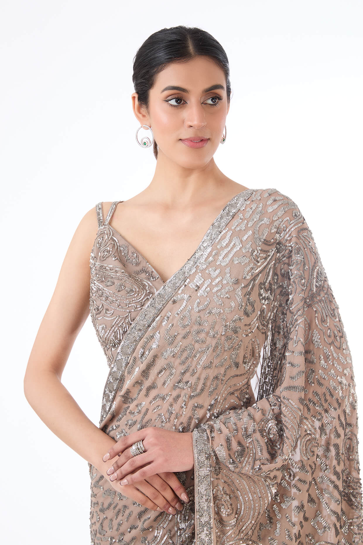 The adha lehenga saree set in gray is an embodiment of grace and intricate craftsmanship. This elegant ensemble features a lehenga and saree set, both adorned with fully hand-embroidered details that add a touch of refined luxury. The subtle gray fabric serves as a sophisticated canvas for the elaborate embroidery, creating a soft yet striking appearance.