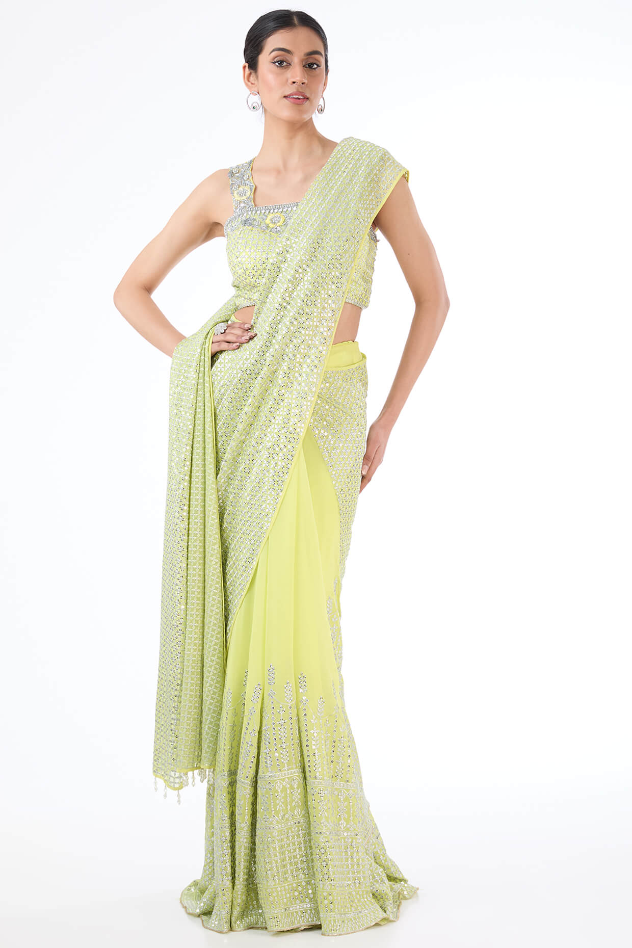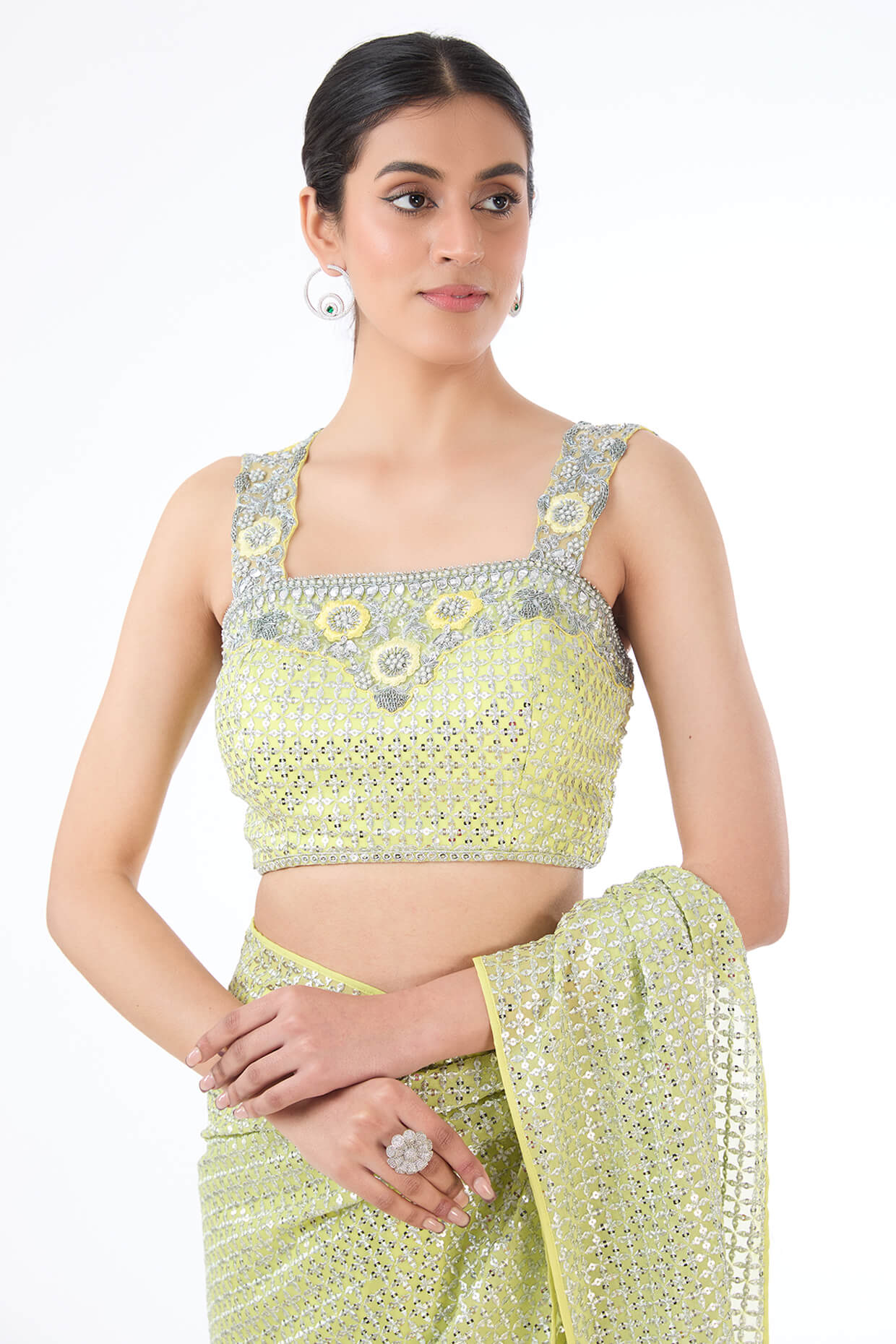 The adha lehenga saree set in neon yellow is a vibrant and eye-catching ensemble that makes a bold statement. Crafted from luxurious georgette, this set features fully hand-embroidered details that enhance its dynamic neon yellow hue. The intricate embroidery adds a touch of sophistication and intricate craftsmanship to the lively color.