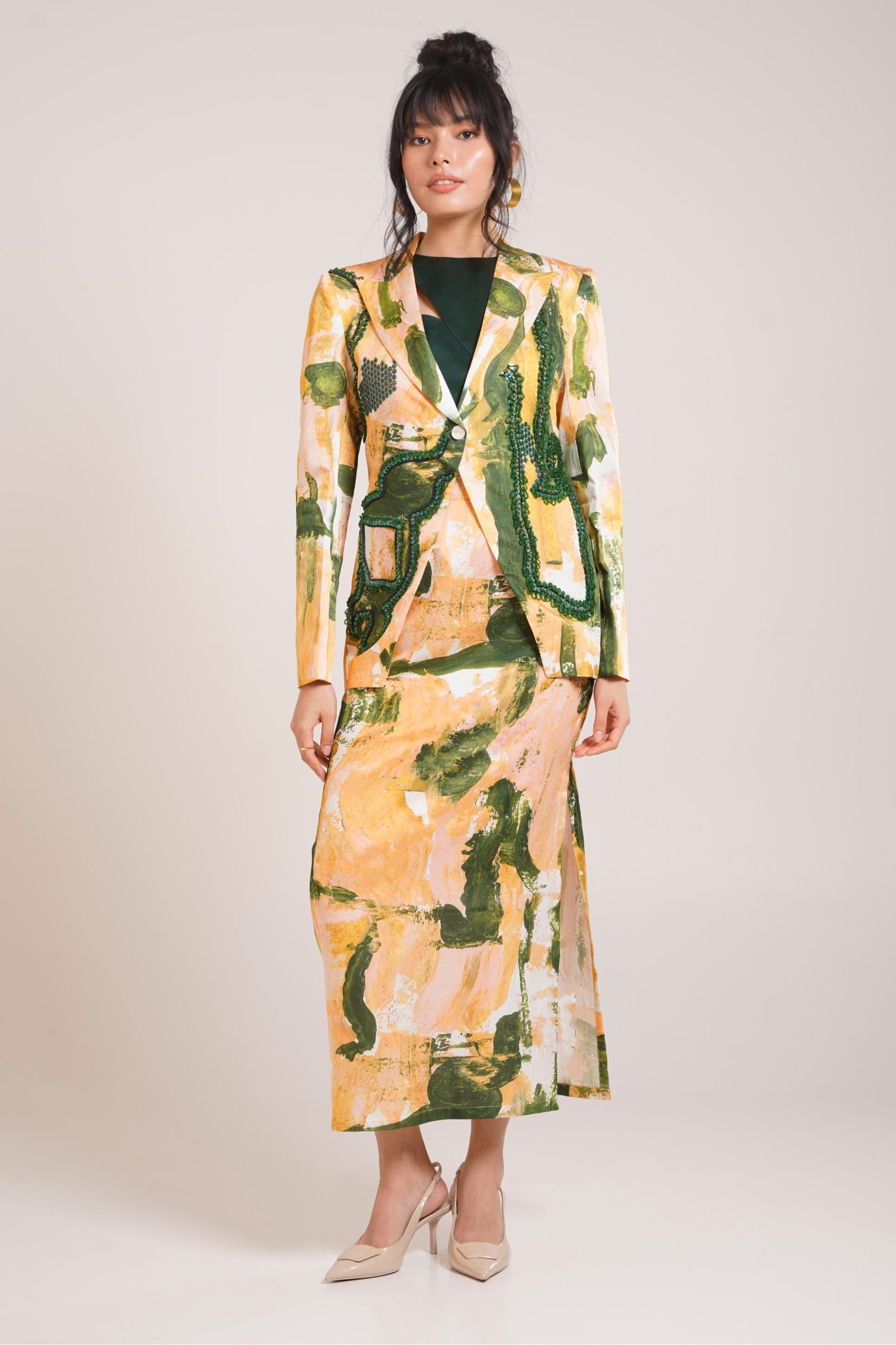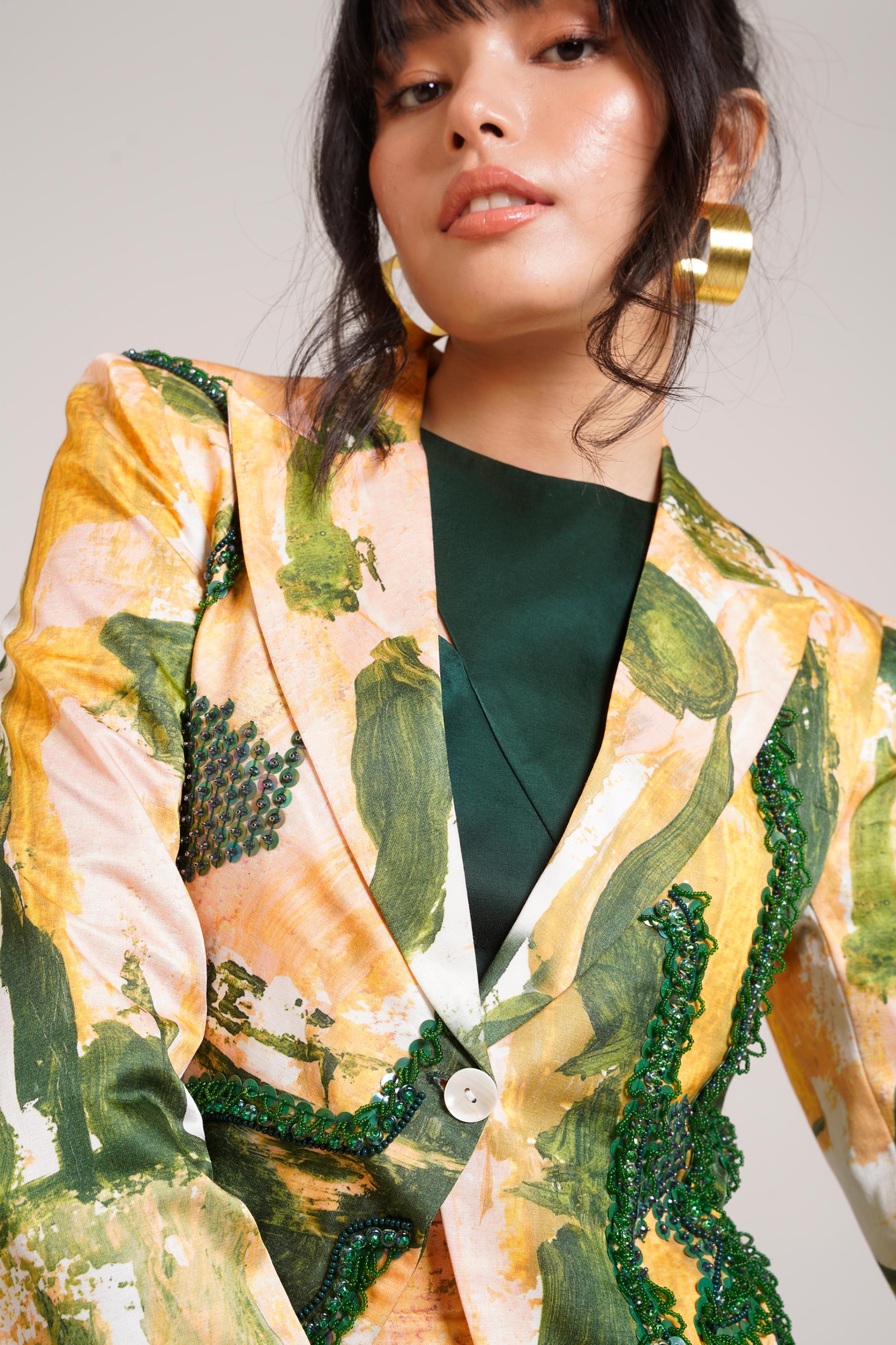 The Multicolor Chaya Ceri Blazer Set by Advait is a powerful blend of structure, color, and contemporary elegance, making it a must-have for any daytime affair. Designed with the modern woman in mind, this blazer set offers a unique take on classic tailoring, reimagined with vibrant multicolor patterns that make it stand out as a statement look. A blazer set has always been symbolic of sophistication and authority, and this creation elevates that symbolism with a bold, fashion-forward twist. Whether you’re attending a professional brunch, a daytime event, or a social gathering, the blazer set delivers confidence and style with ease. Its tailored blazer sharpens your silhouette, while the coordinating bottoms provide balance and comfort for all-day wear. The versatility of the blazer set allows for endless styling opportunities. Pair the blazer and trousers together for a cohesive, standout look, or separate them to create multiple outfits. The blazer can be worn over a sleek dress or styled with denim for a casual-chic approach, while the bottoms can pair beautifully with solid-toned tops for a relaxed yet refined ensemble. This adaptability ensures the blazer set becomes a long-lasting staple in your wardrobe. Made with premium-quality fabrics, the blazer set is structured yet breathable, offering comfort without compromising elegance. Advait’s attention to detail is visible in the impeccable tailoring and thoughtful design choices that elevate the outfit into something truly remarkable. For styling, wear the Multicolor Chaya Ceri Blazer Set with heels and minimal jewelry for a polished daytime look, or add statement accessories to highlight its vibrant palette. Sophisticated yet expressive, this blazer set embodies Advait’s vision of empowering fashion that seamlessly fits into every woman’s lifestyle.