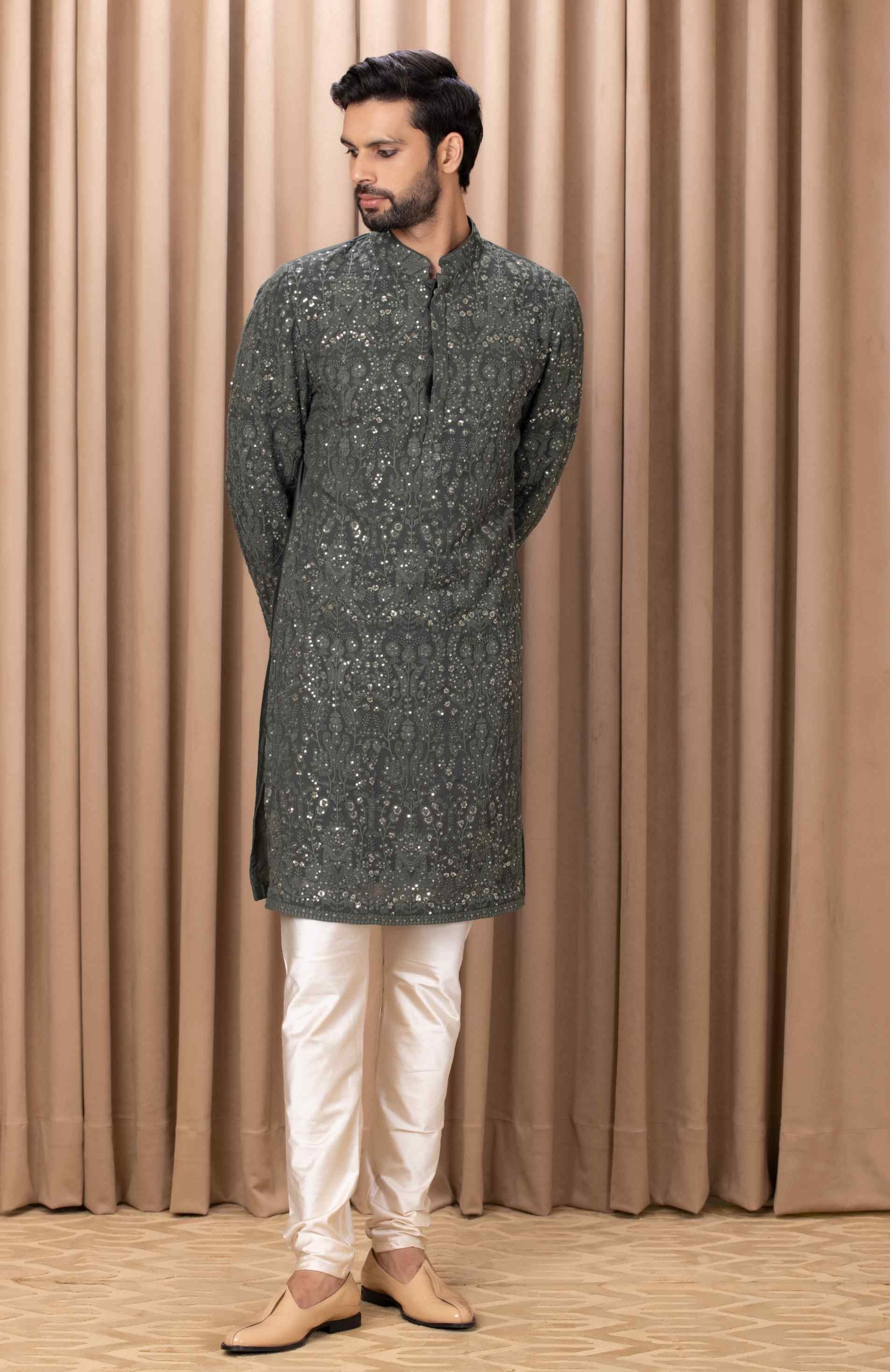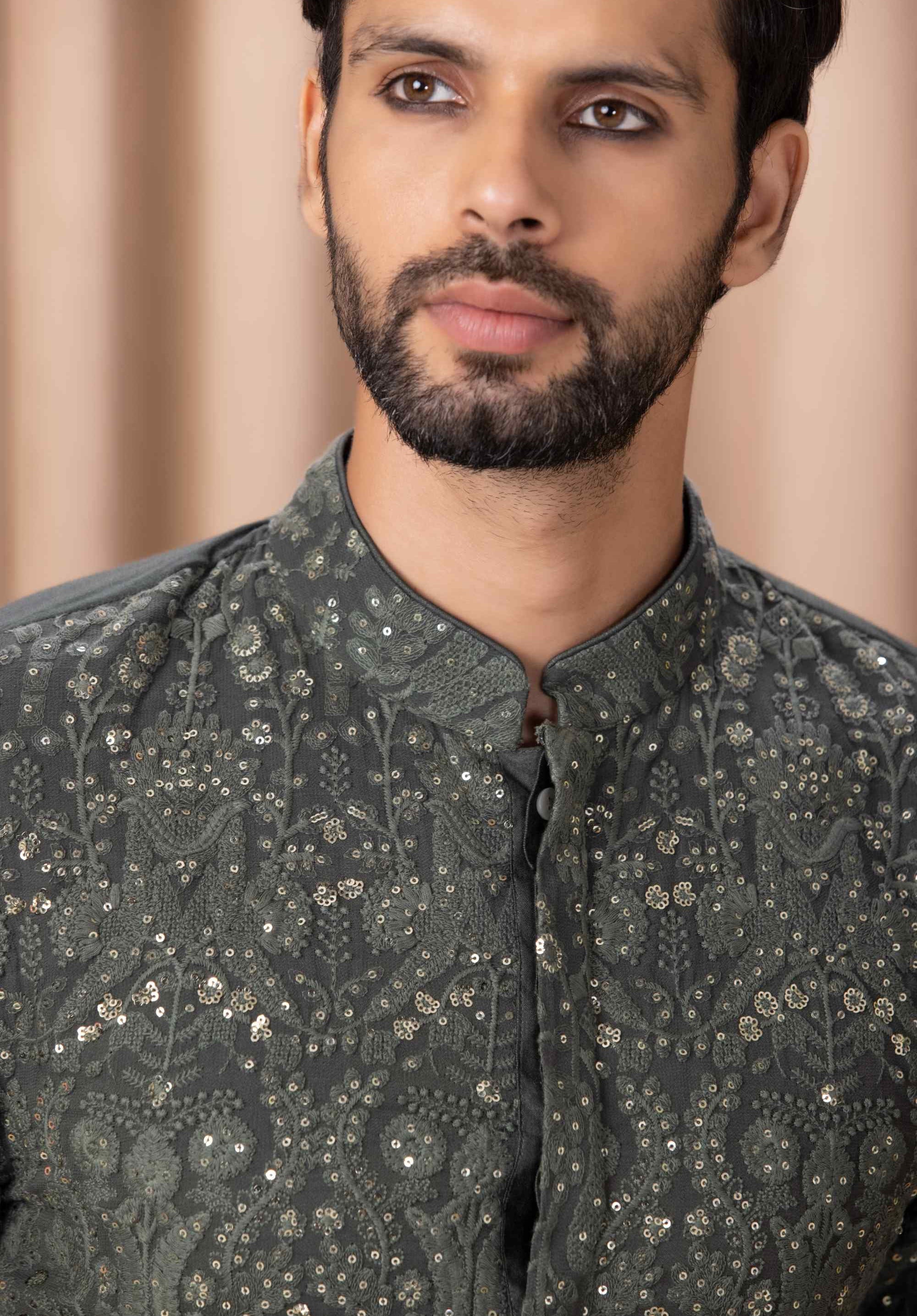 Experience understated elegance with our bespoke cotton silk and georgette kurta set in a rich olive green. This refined ensemble features intricate thread machine embroidery on the front and sleeves, providing a sophisticated touch to its modern design. Ideal for outdoor occasions, this kurta set is designed for the contemporary groom or groomsmen who value both style and comfort. Complemented by an ivory classic churidaar, the outfit ensures a harmonious and polished look. Elevate your special day with this beautifully crafted kurta set, seamlessly blending contemporary aesthetics with timeless grace.