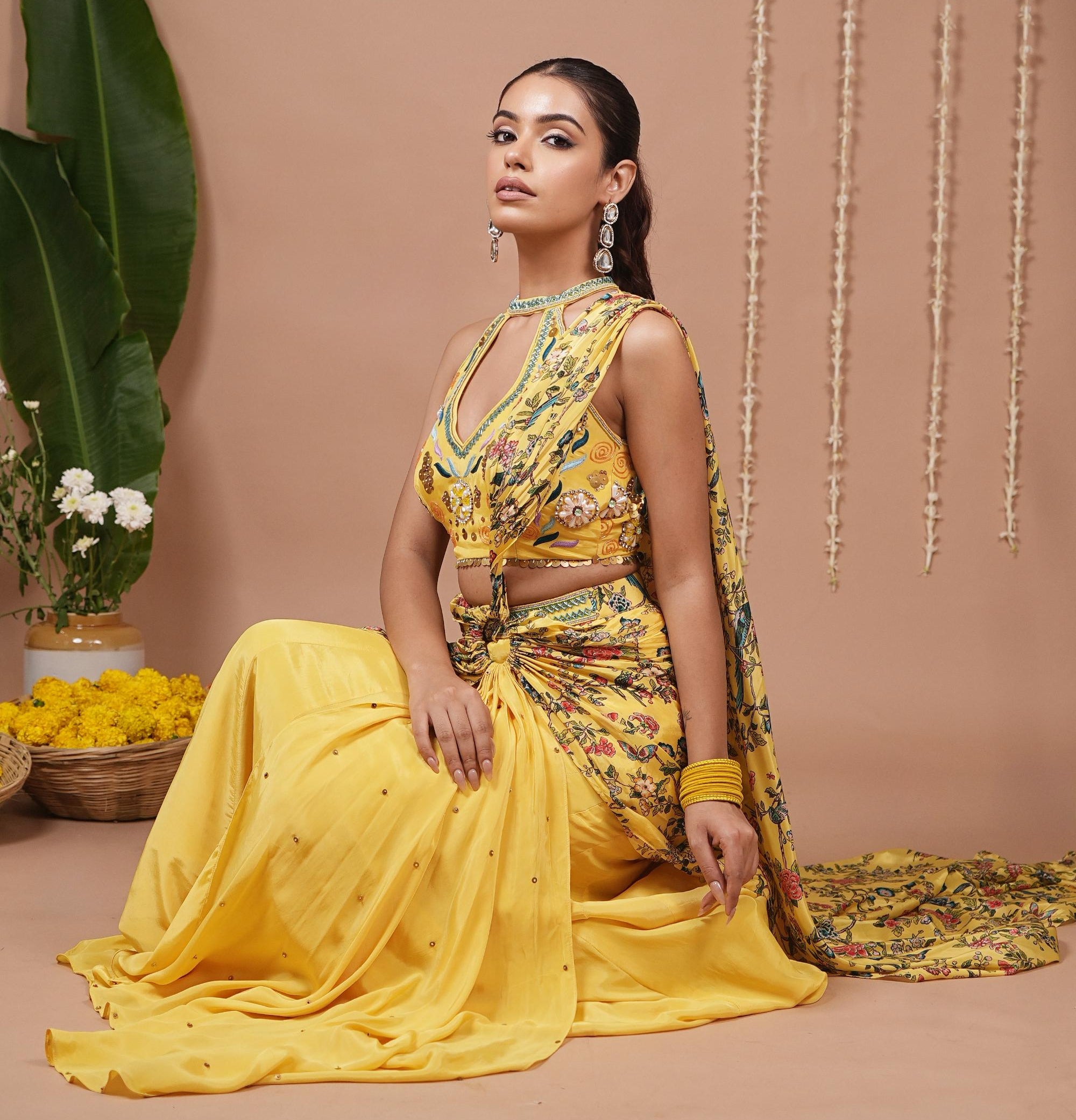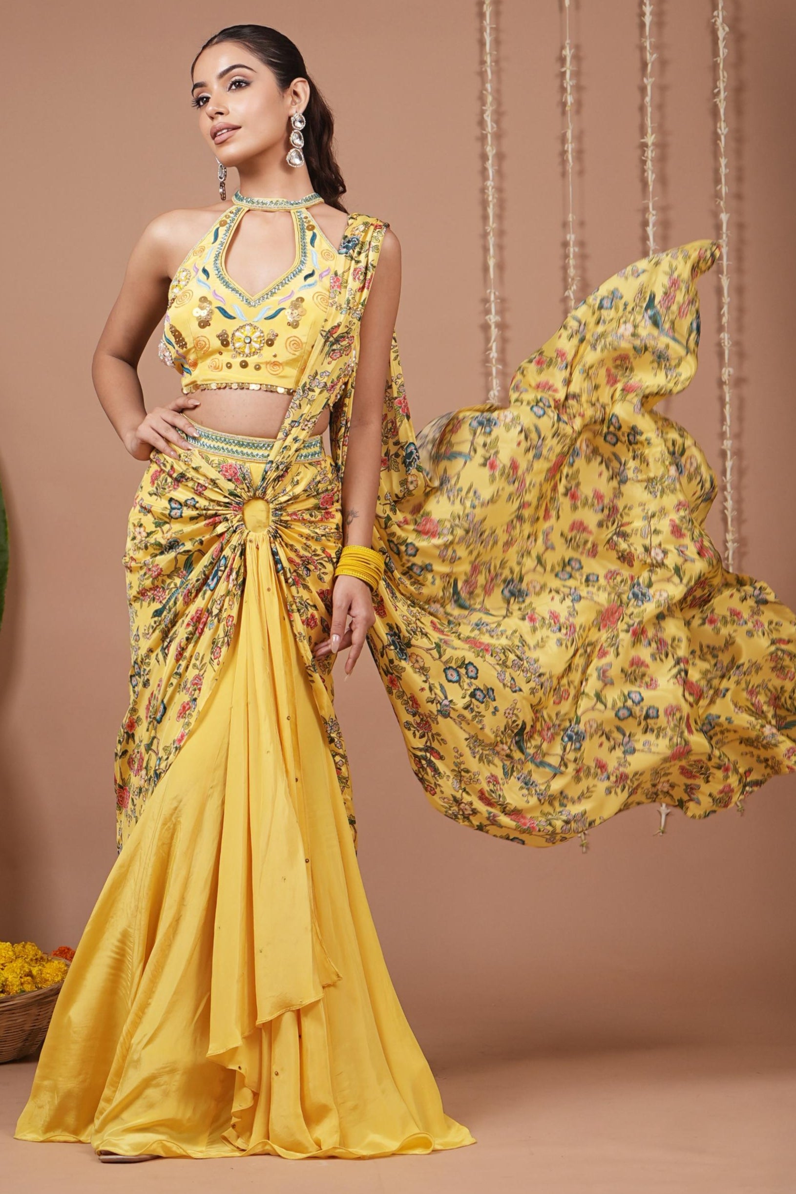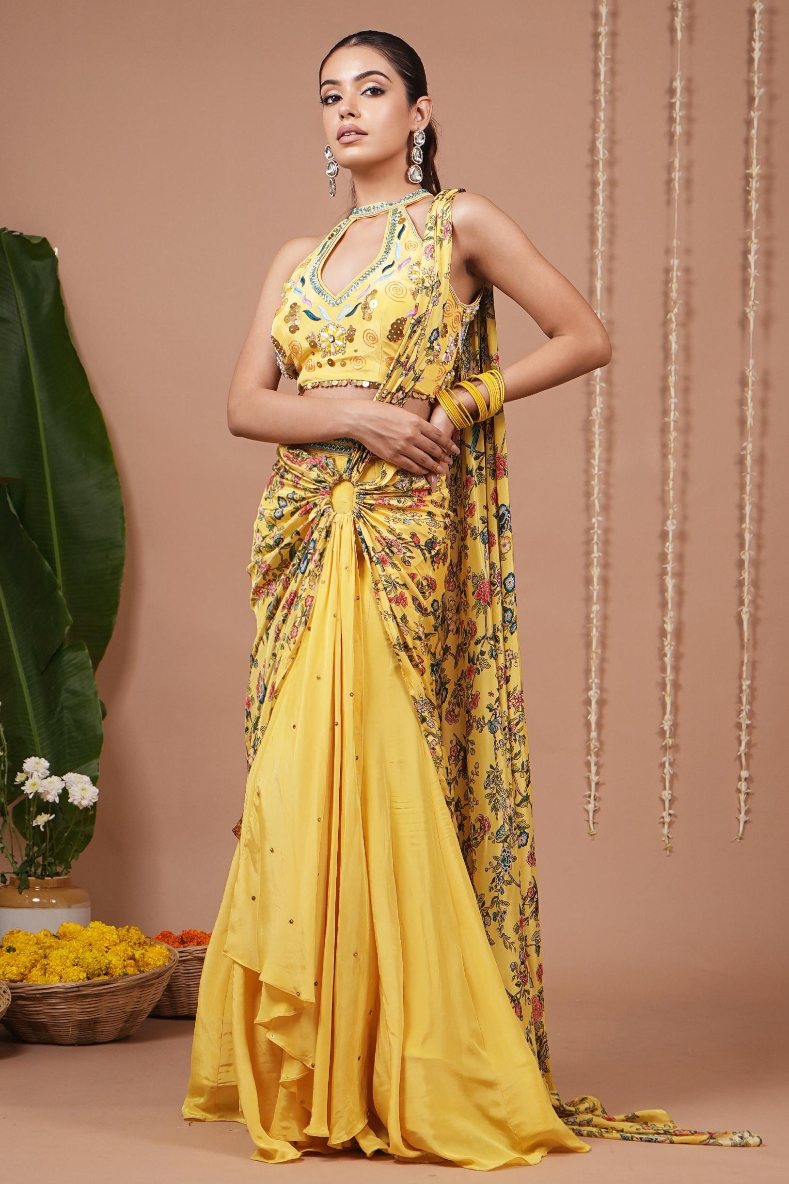 The bright yellow halter neck drape saree is playful and chic. Perfect for haldi ceremonies, festive brunches, or destination weddings, this pre-draped style ensures ease while delivering modern flair. The halter neckline adds a trendy touch.