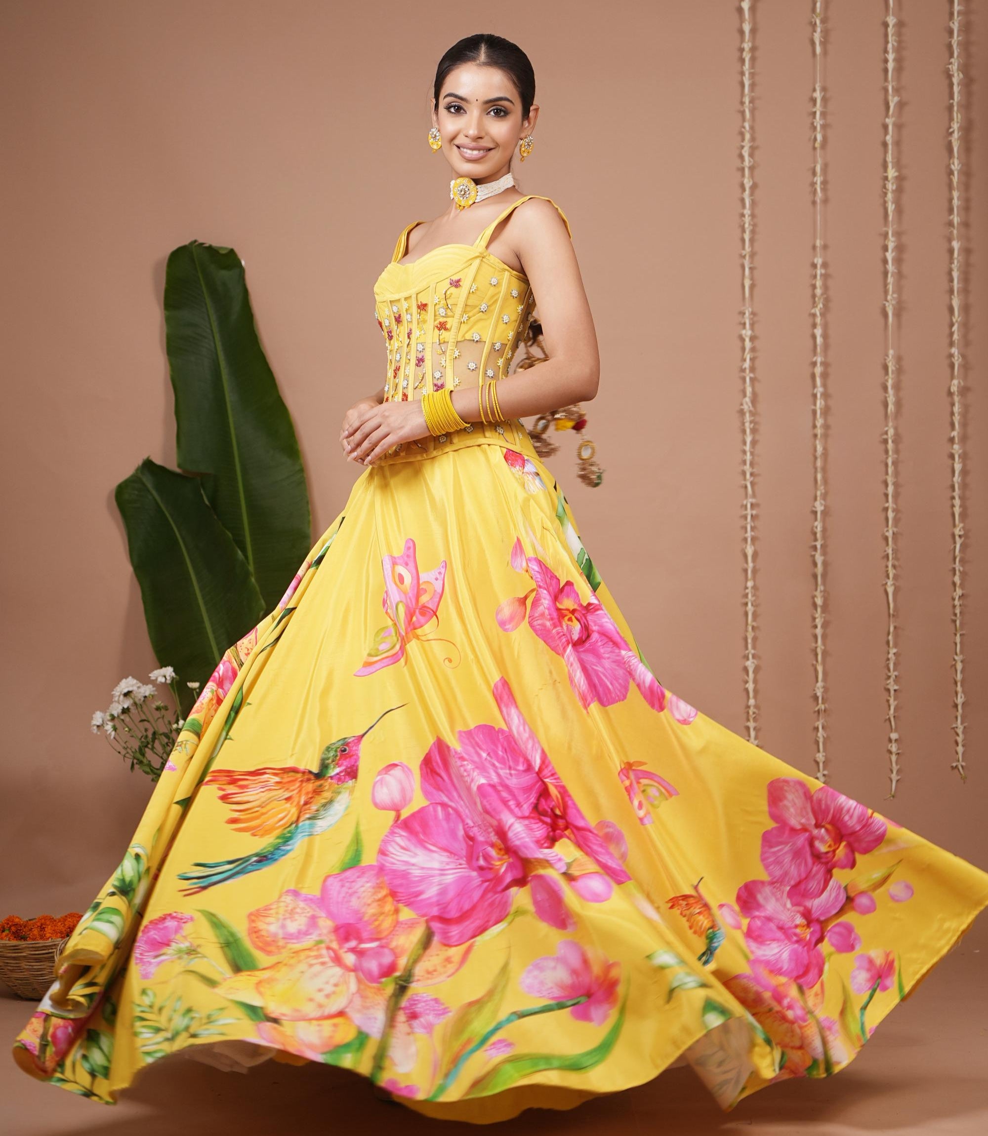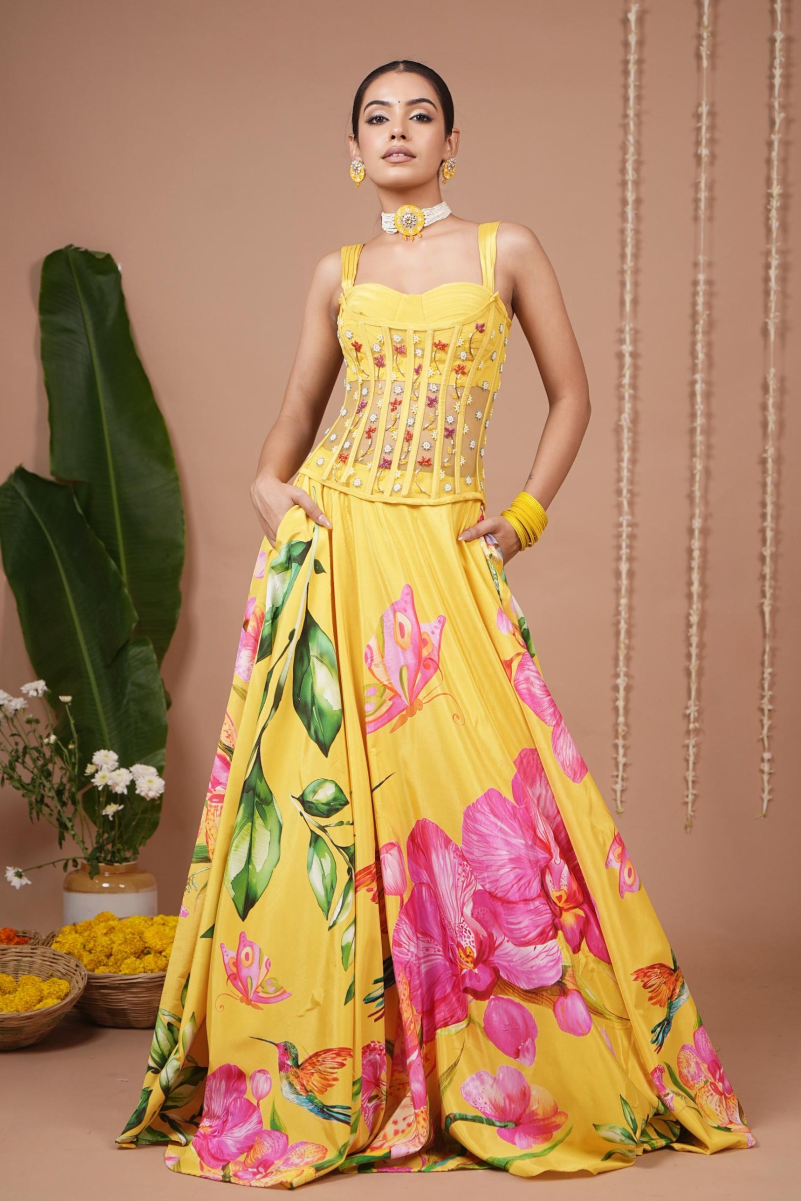 The mustard floral corset heavy lehenga set is curated for bridesmaids and wedding guests who want bold fashion. The corset design enhances the figure, while the flared skirt ensures movement and flair. This lehenga set is striking for weddings and festive occasions.