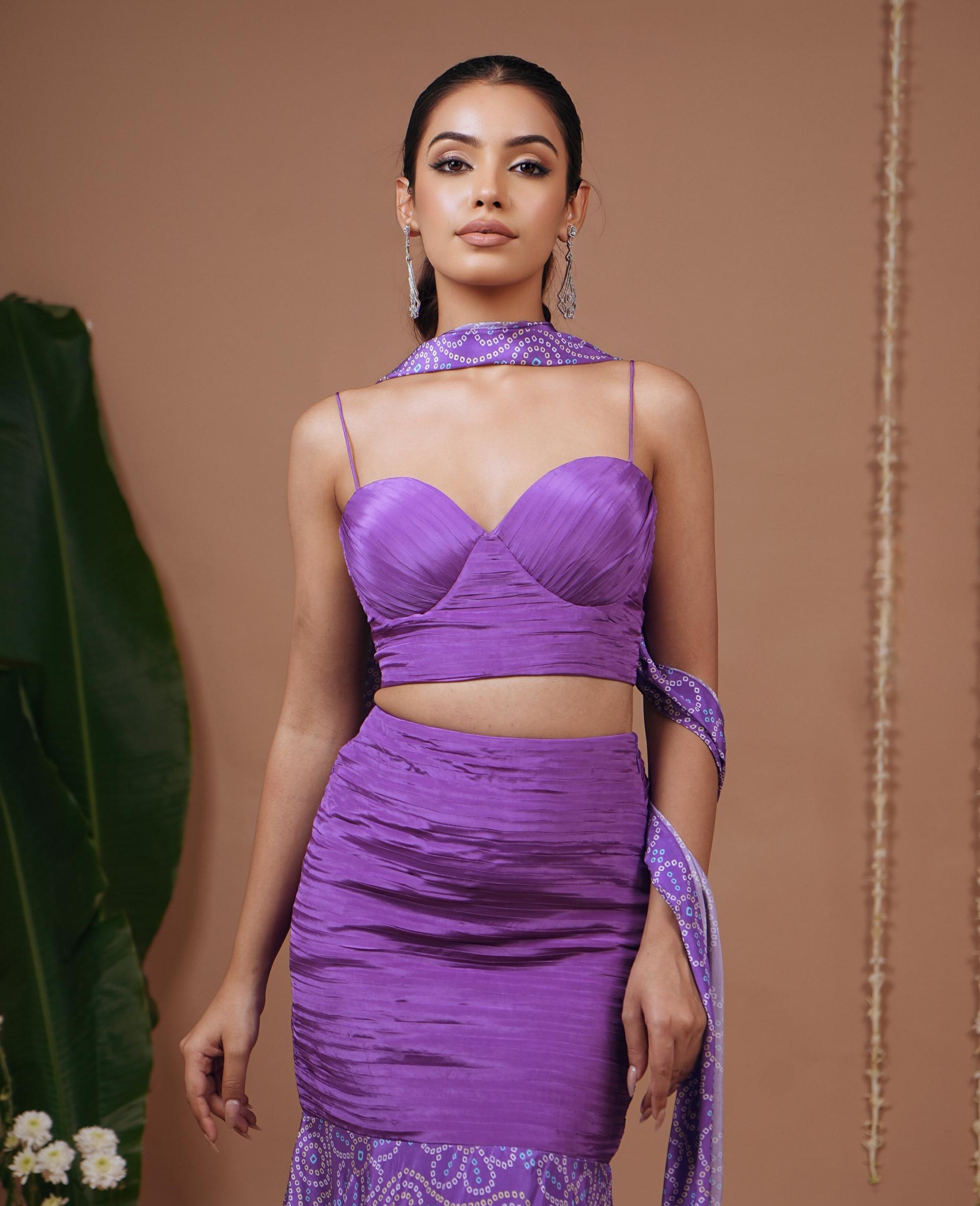 The purple bandhani corset skirt set is striking and unique, perfect for festive occasions and cultural weddings. The corset blouse adds structure, while the skirt ensures flow and elegance.