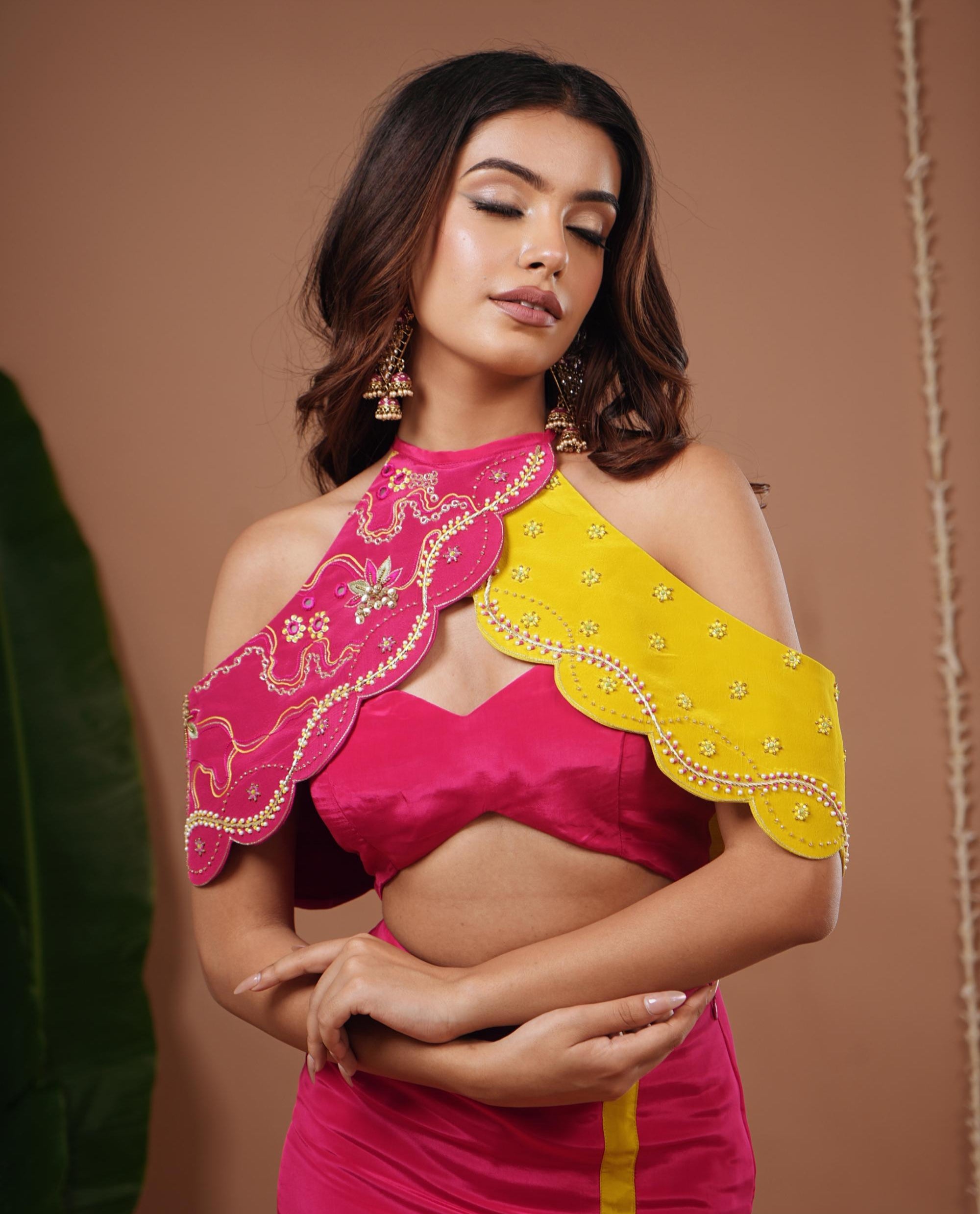 Celebrate color with this rani yellow halter neck skirt set, curated for haldi and mehendi events. The halter blouse adds a chic neckline, while the flowing skirt gives playful movement. This skirt set radiates joy and elegance, making it perfect for summer weddings and daytime festivities.