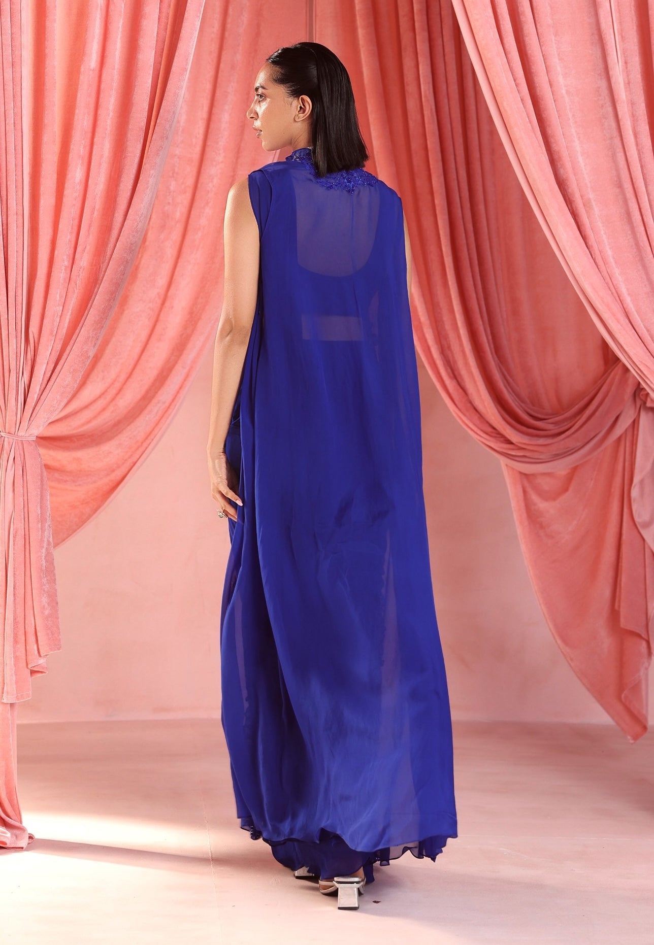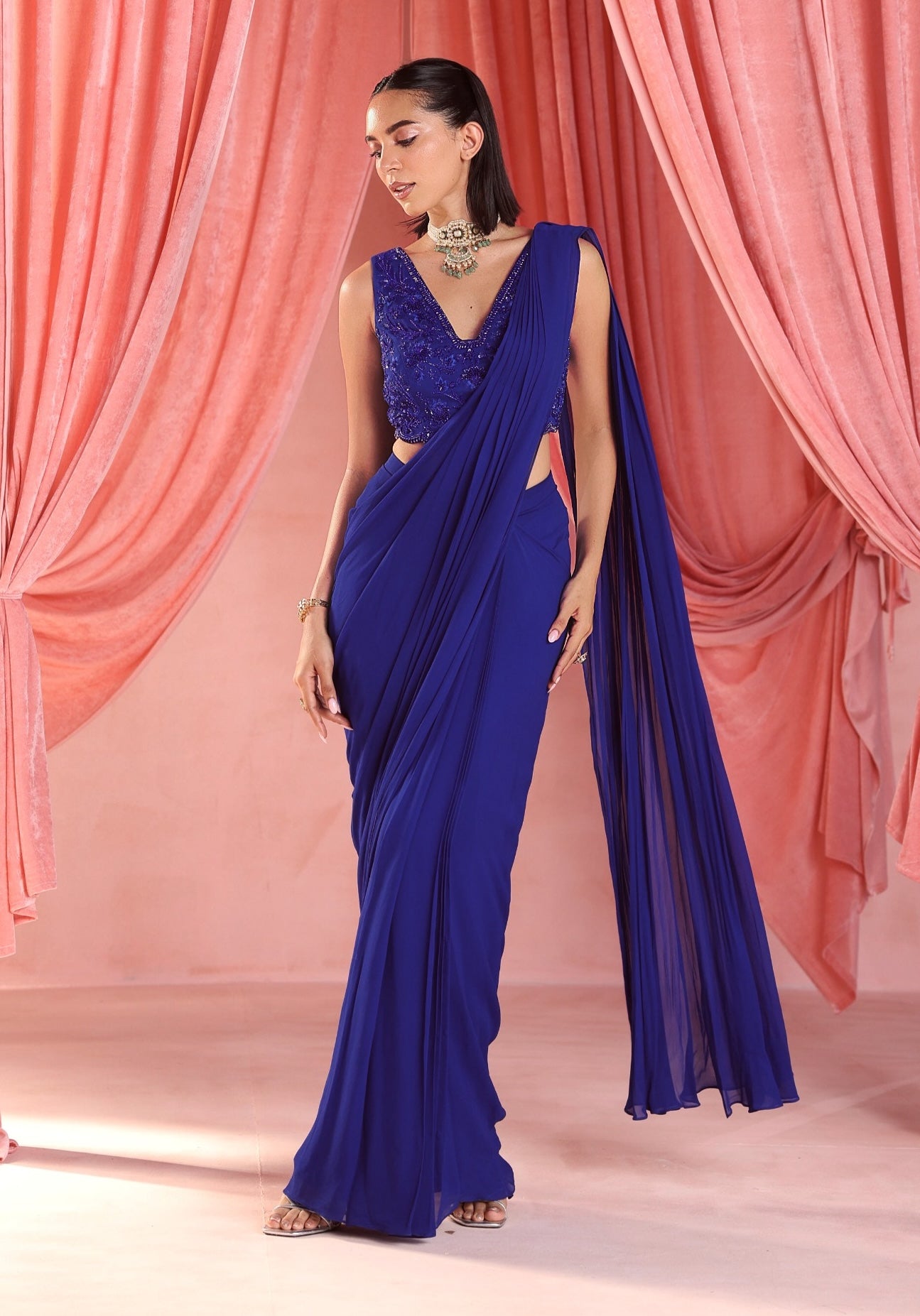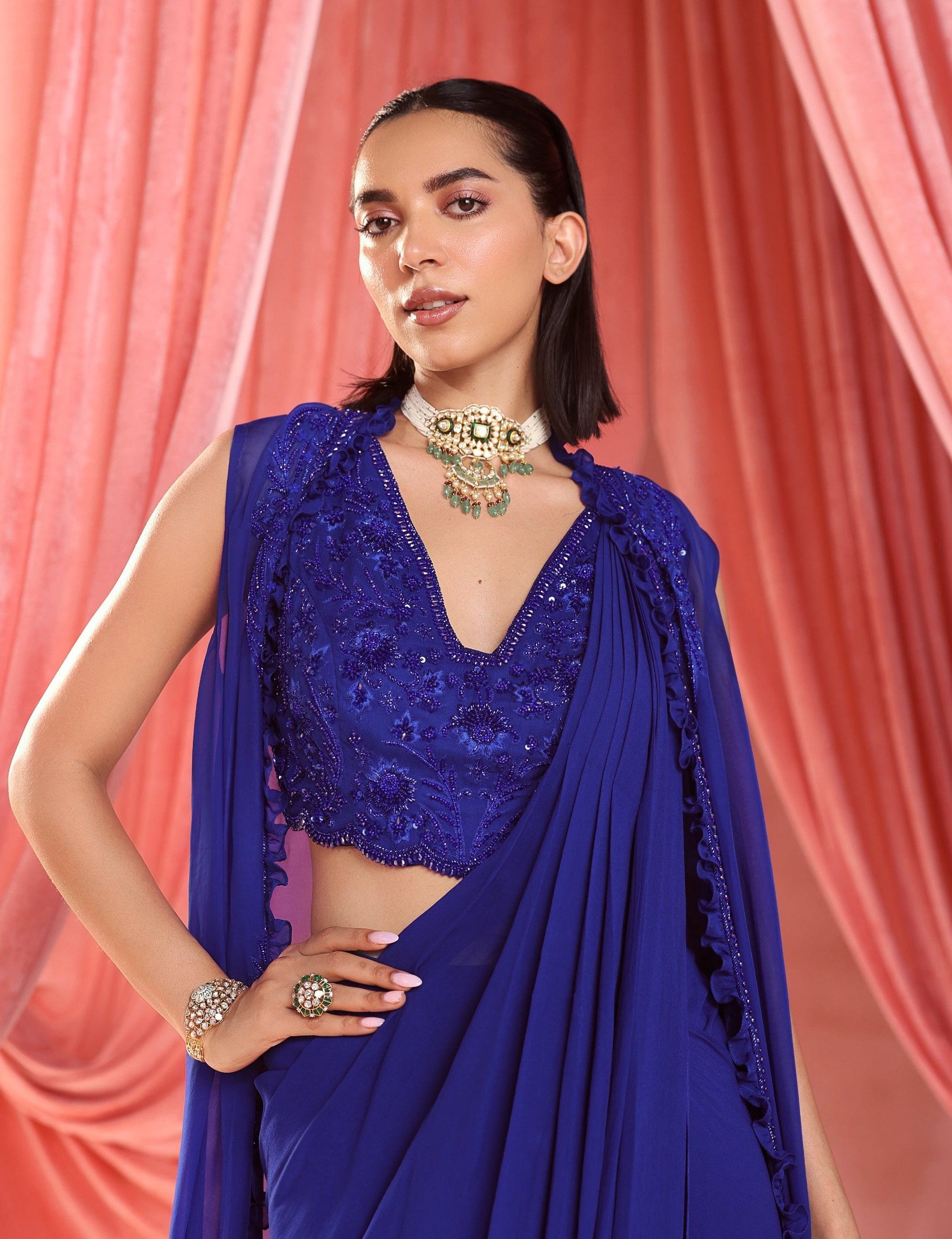 Elevate your style with our embellished choli, paired with a luxurious embellished jacket adorned with sophisticated ruffles and a pre-draped saree. This stunning ensemble seamlessly blends intricate embellishments and ruffle details with the ease of a pre-draped saree, offering a perfect fusion of classic elegance and modern design. Ideal for special events and high-profile occasions, it promises a striking and memorable look with effortless sophistication. Enhance your wardrobe with this exquisite combination of timeless grace and contemporary allure.