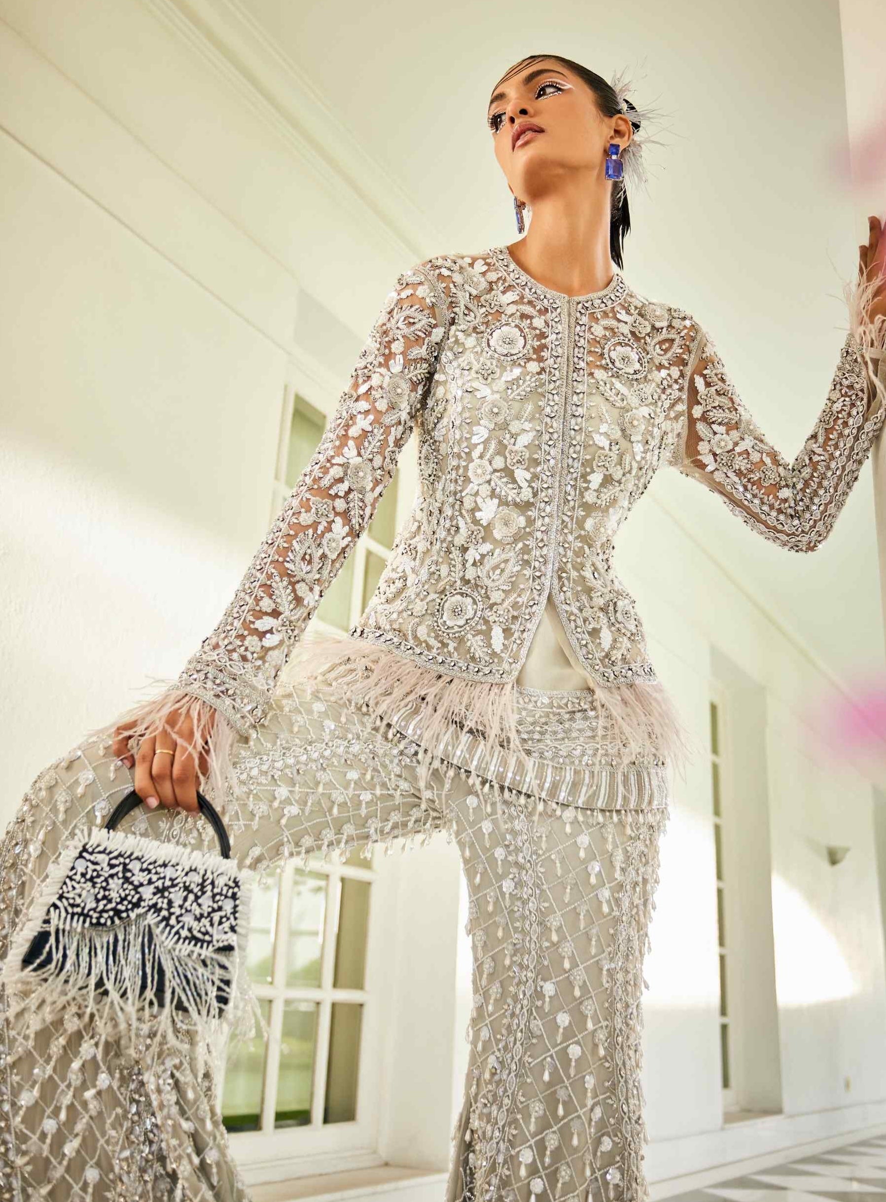 The kurta set is beautifully embellished with intricate embroidery, featuring delicate threadwork and bead detailing that create a stunning visual effect. The jacket adds an element of sophistication with its sheer design, while the sharara pants flow gracefully, offering both comfort and style. This ensemble exudes modern elegance with its contemporary silhouette and exquisite craftsmanship, making it a perfect choice for any chic celebration.