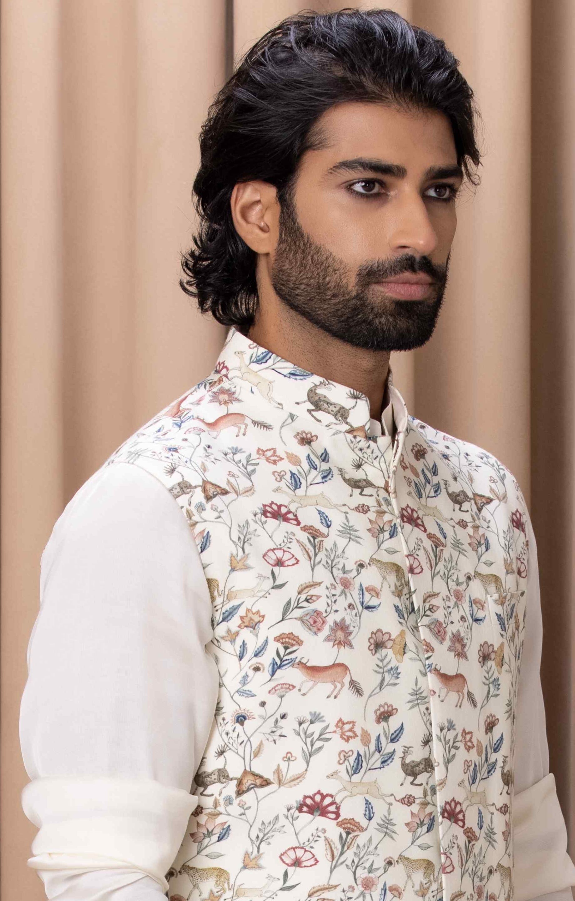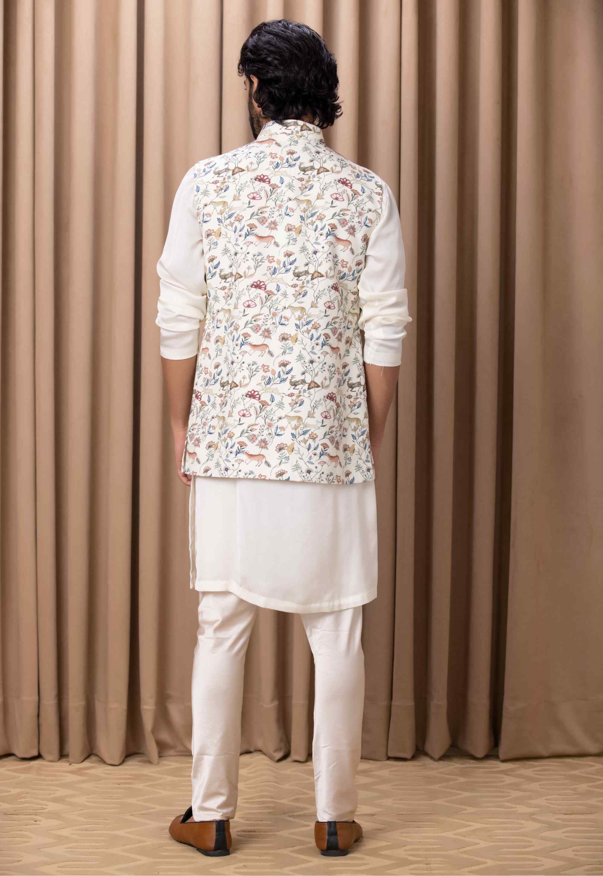 Discover refined sophistication with our contemporary printed ivory nehru jacket, adorned with delicate hand-painted motifs that add a touch of artistry and modern elegance. Perfectly suited for both indoor and outdoor occasions, this jacket is paired with Ankit V Kapoor's coordinating ivory kurta set, creating a seamless and stylish ensemble. Ideal for the modern groom or groomsmen who appreciate unique design elements and classic sophistication, this outfit ensures a standout look for any special event.