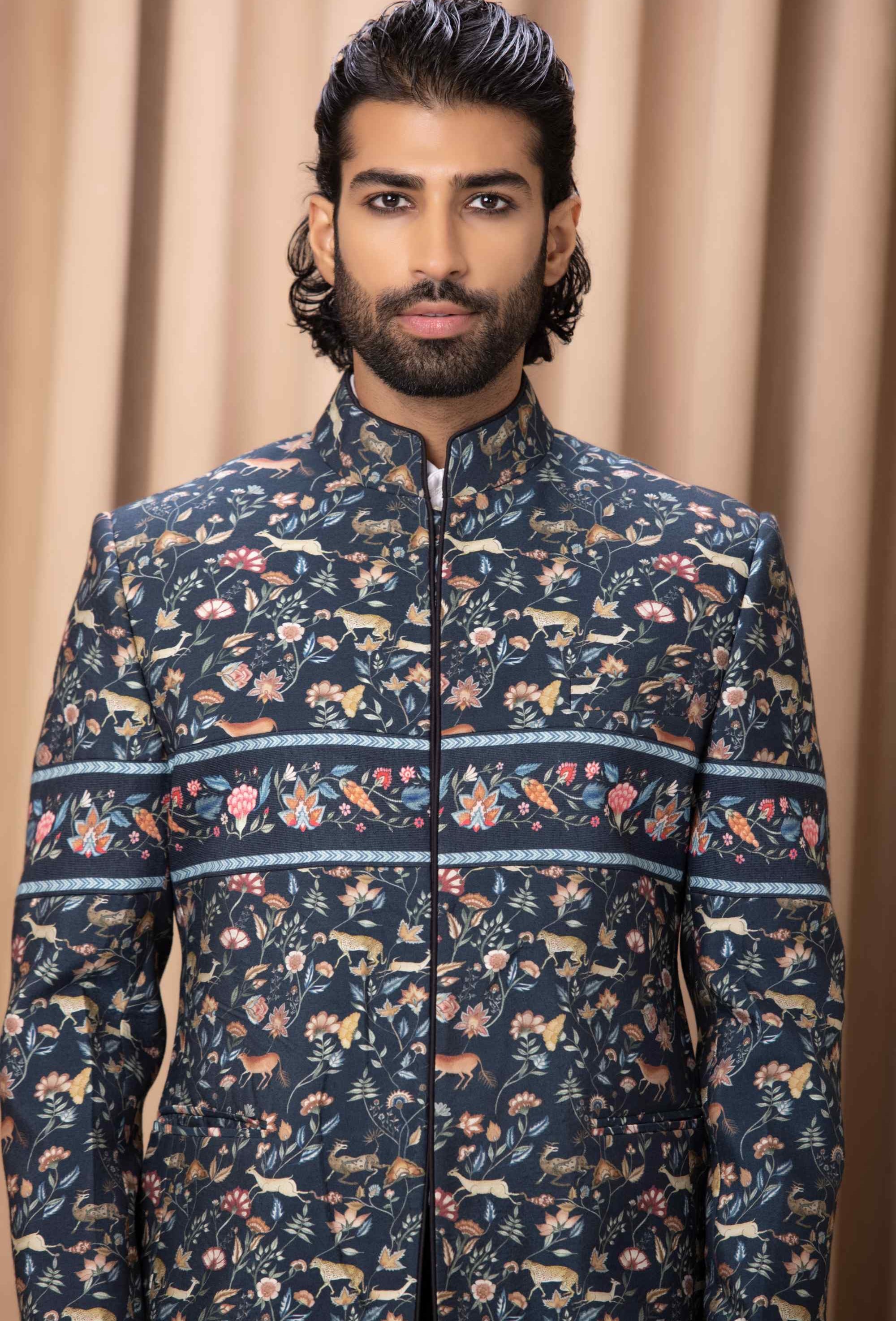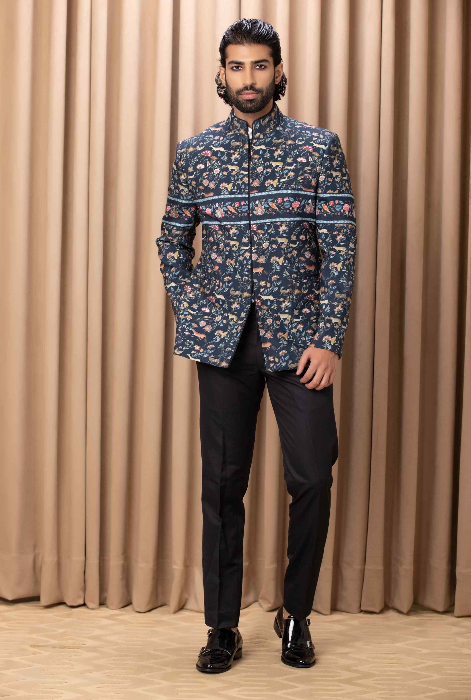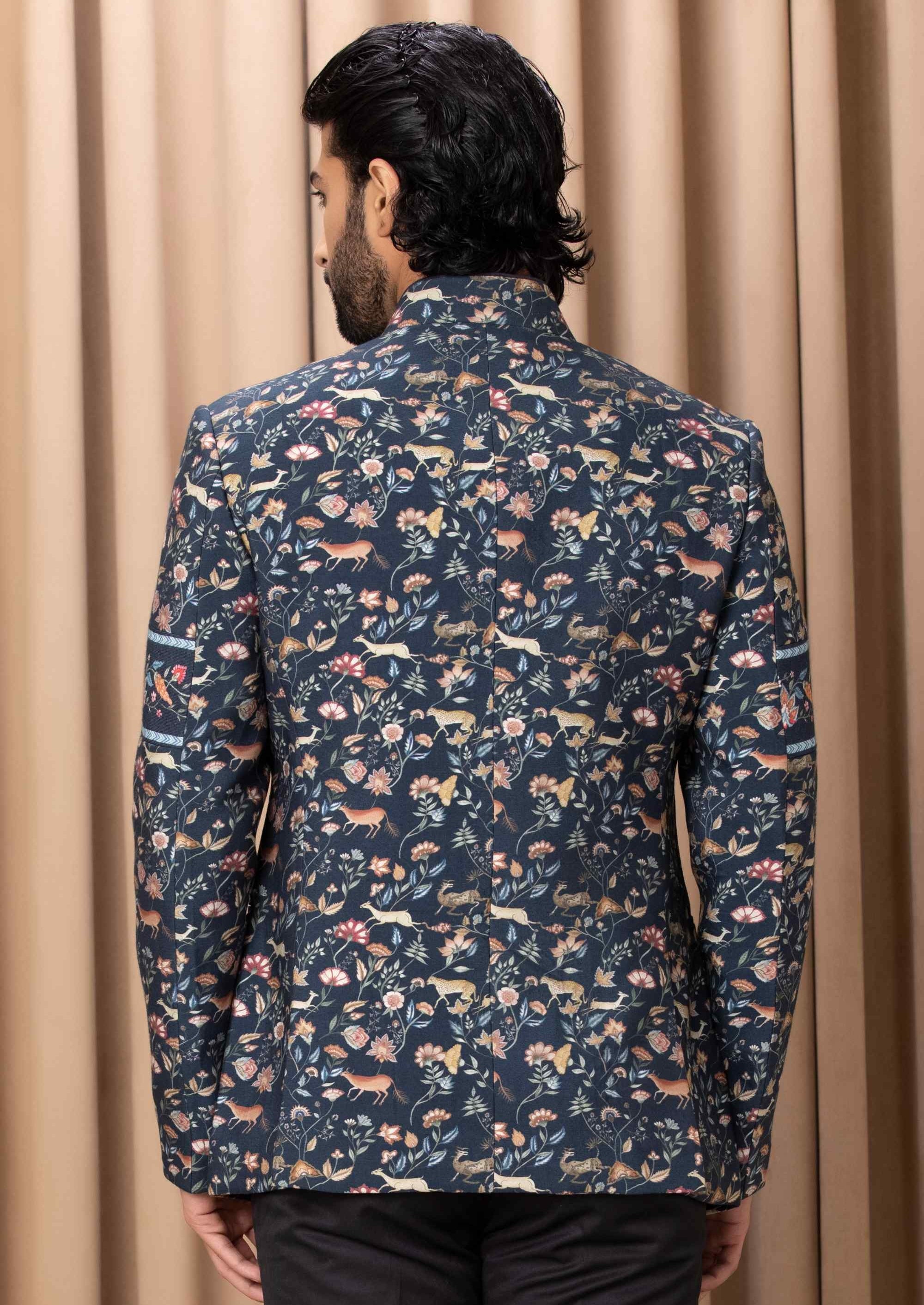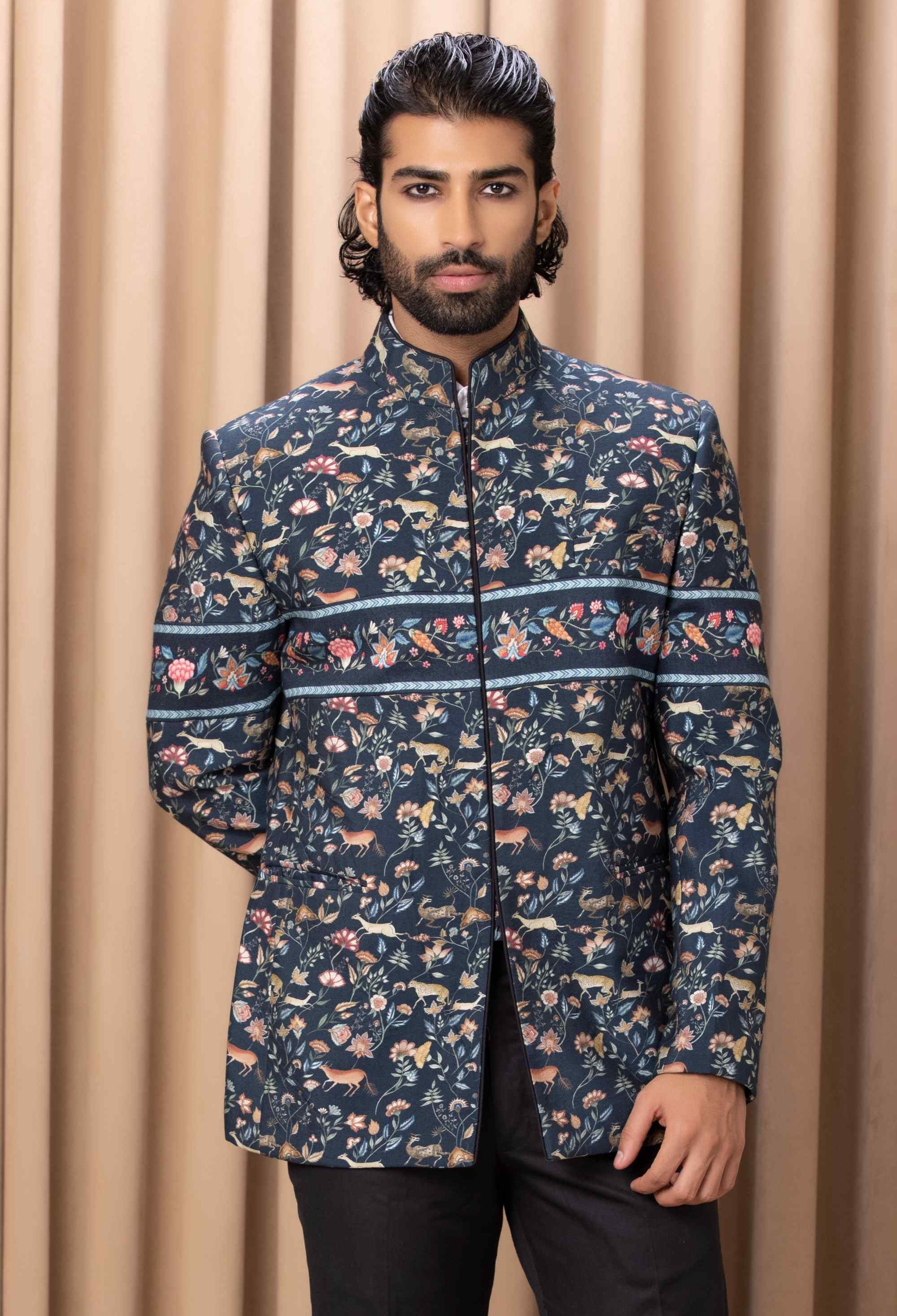 Discover the unique charm of our contemporary digital-printed hand-painted navy blue bandhgala set, designed to make a statement at sagan or cocktail occasions. This ensemble features a strikingly printed jacket with artistic hand-painted elements, complemented by a sleek black Chinese collar shirt and classic black suiting trousers. Perfectly merging modern aesthetics with traditional sophistication, this bandhgala set ensures you stand out with exceptional style and flair at your next distinguished event.