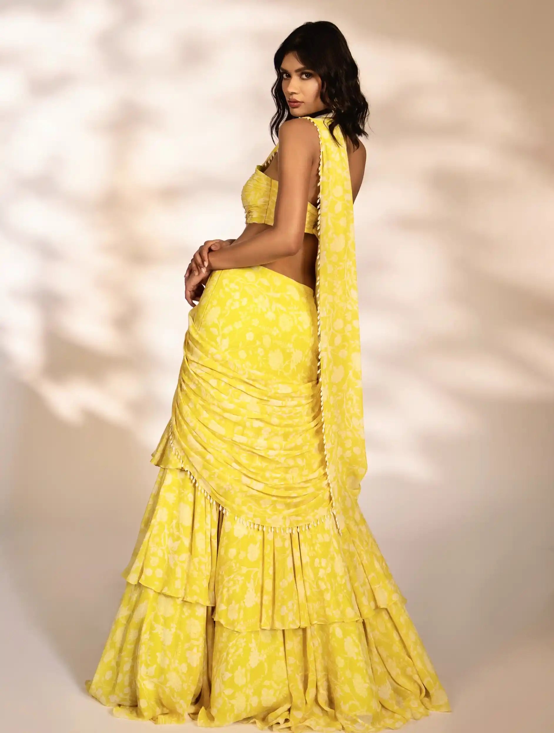 Illuminate your wardrobe with our yellow printed pre-draped saree designed for effortless elegance and modern charm. This vibrant piece showcases a beautiful yellow print while the luxurious pearl embellishments on the pallu add a touch of sophistication and sparkle. The innovative pre-draped style ensures easy wear allowing you to shine with confidence. Complemented by a knot-style ruched blouse this ensemble accentuates your curves and offe a chic contemporary twist. Perfect for weddings celebrations or special events this saree is a stunning choice for making a lasting impression!