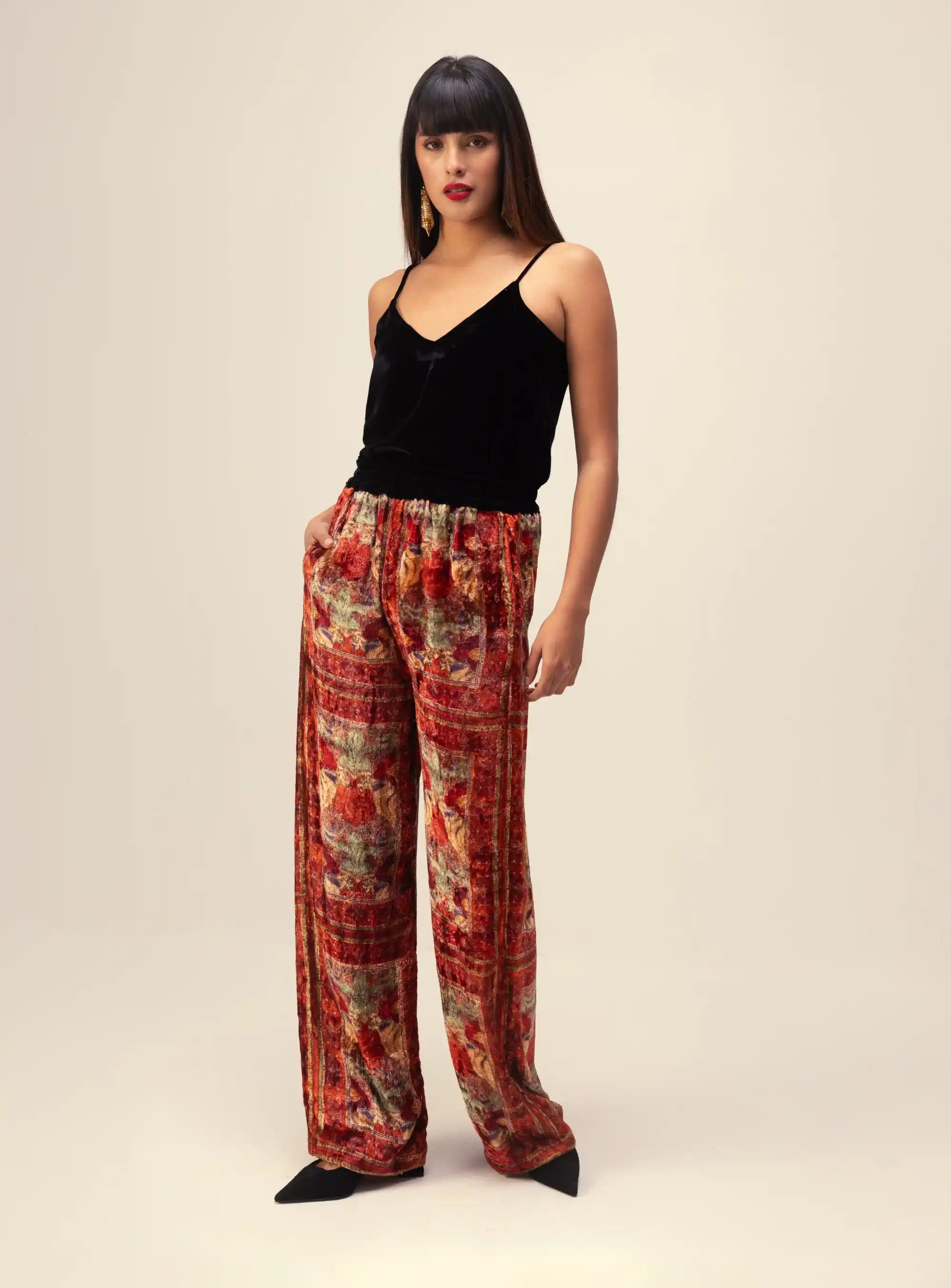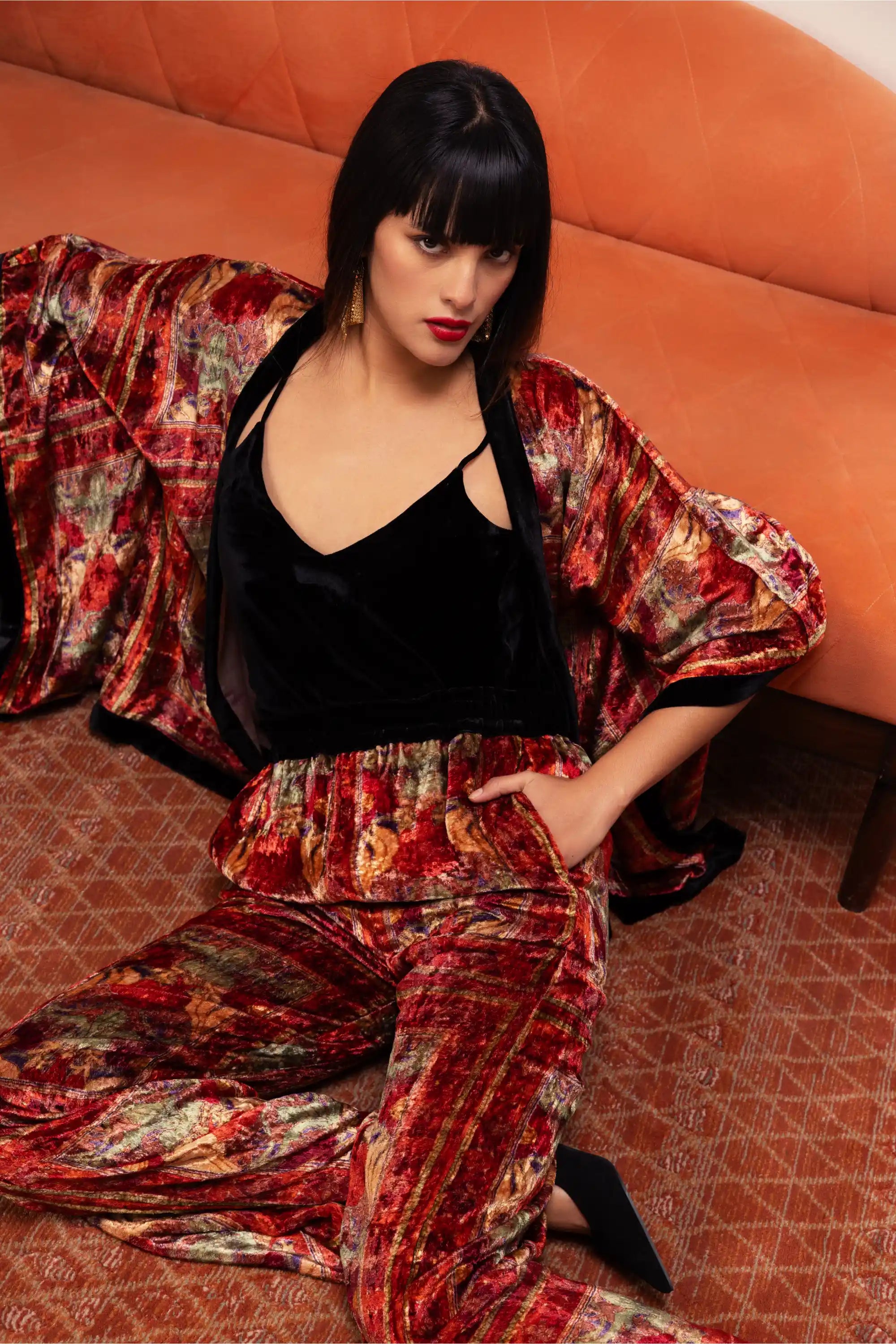 Make a bold statement with our kimono top and pants co-ord set, featuring a vibrant floral placement print accented by a striking contrast border. Crafted from soft red multi-colored viscose velvet, this ensemble combines luxurious comfort with eye-catching style. The flowing kimono top pairs elegantly with the tailored pants, creating a harmonious look that's perfect for both casual outings and special occasions. Embrace chic sophistication and elevate your wardrobe with this stunning set!