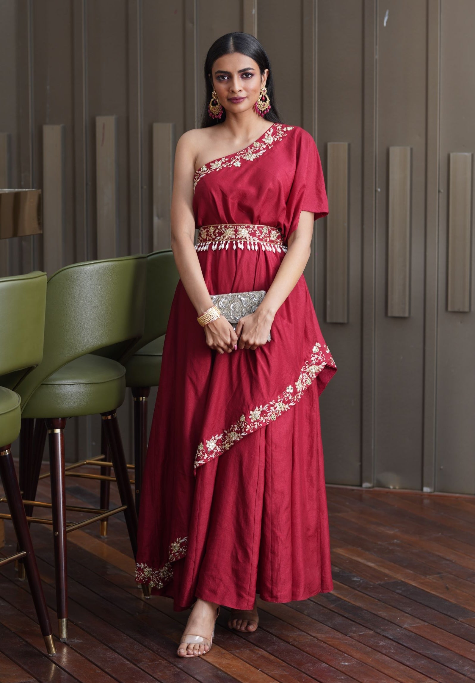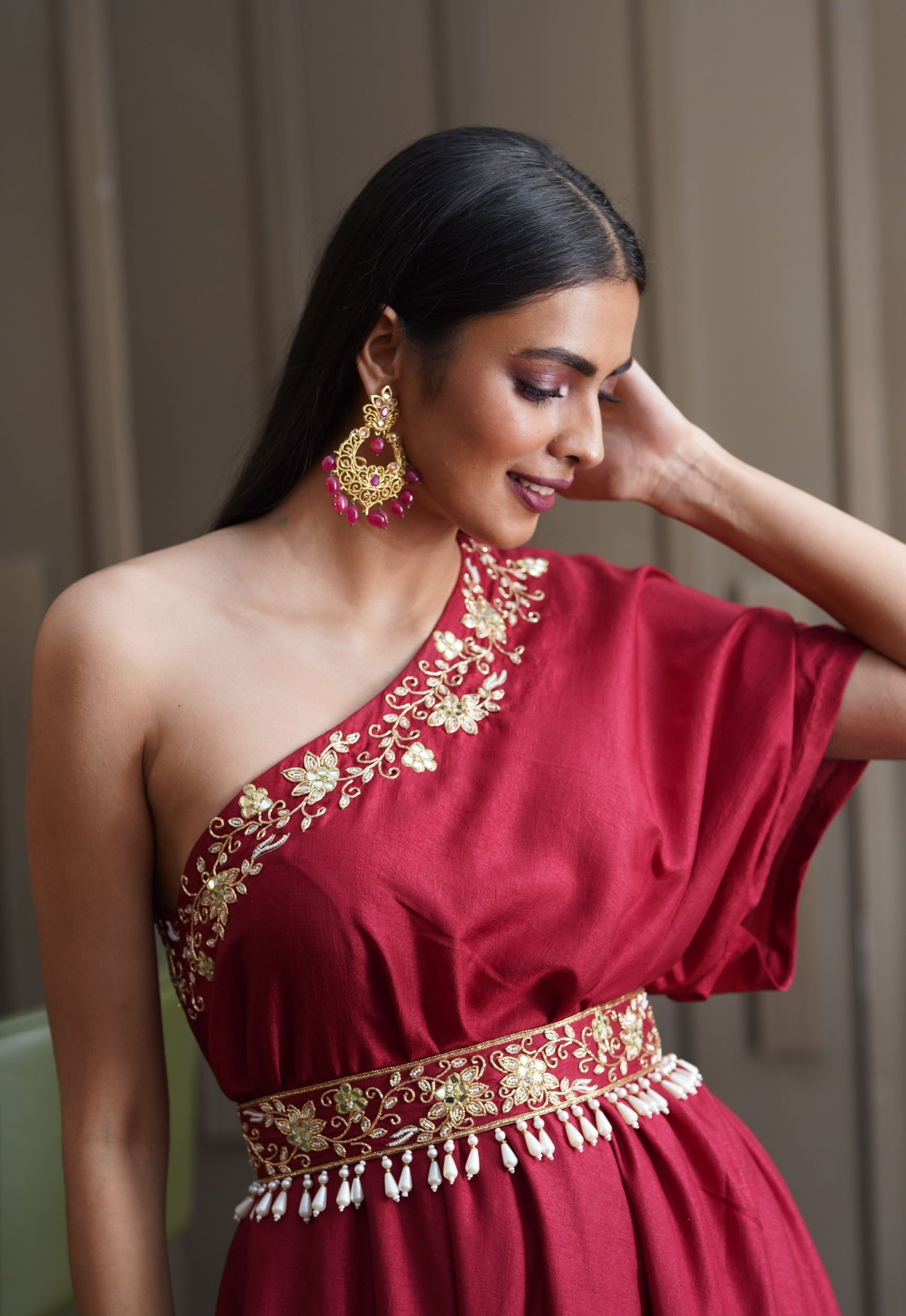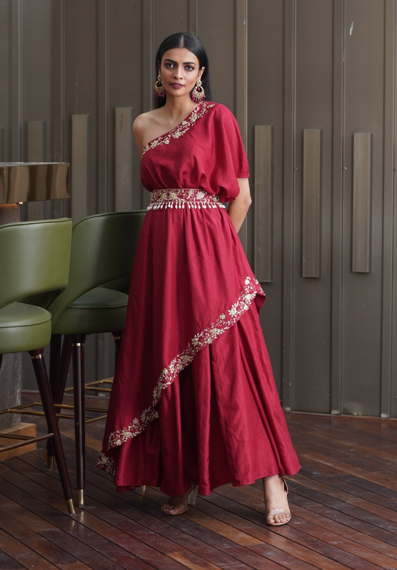 Step into elegance with the maroon hand-embroidered croma silk one-shoulder gown adorned with a hand-embroidered belt. This gown exudes sophistication and charm with its intricate embroidery and luxurious croma silk fabric. The one-shoulder design adds a modern twist to the classic silhouette, ensuring you stand out at any formal event or special occasion. Complete your ensemble with the hand-embroidered belt, enhancing the waistline with its detailed craftsmanship and adding a touch of opulence. Perfect for evening affairs, this gown combines traditional artistry with contemporary elegance, making it a statement piece in your wardrobe.
