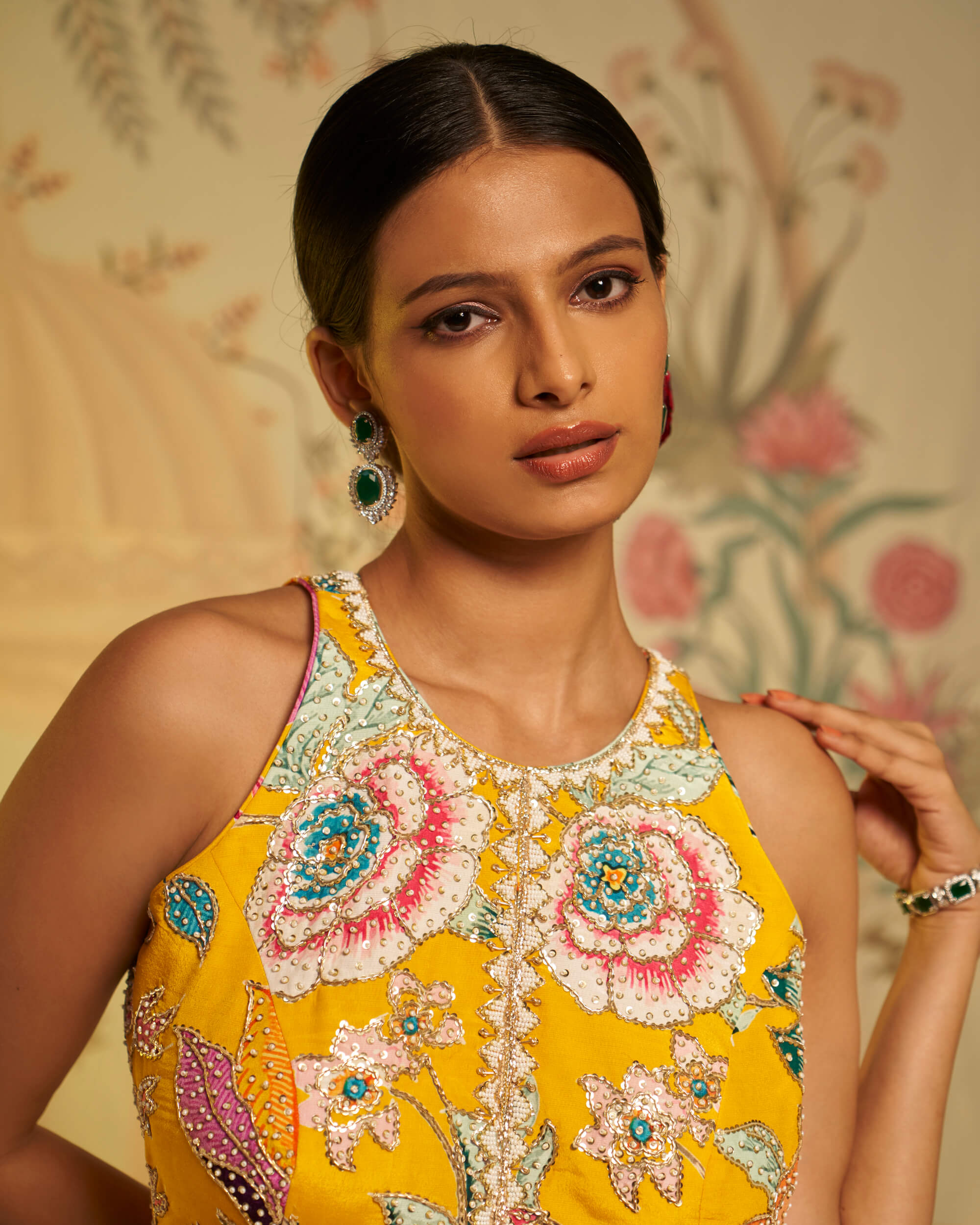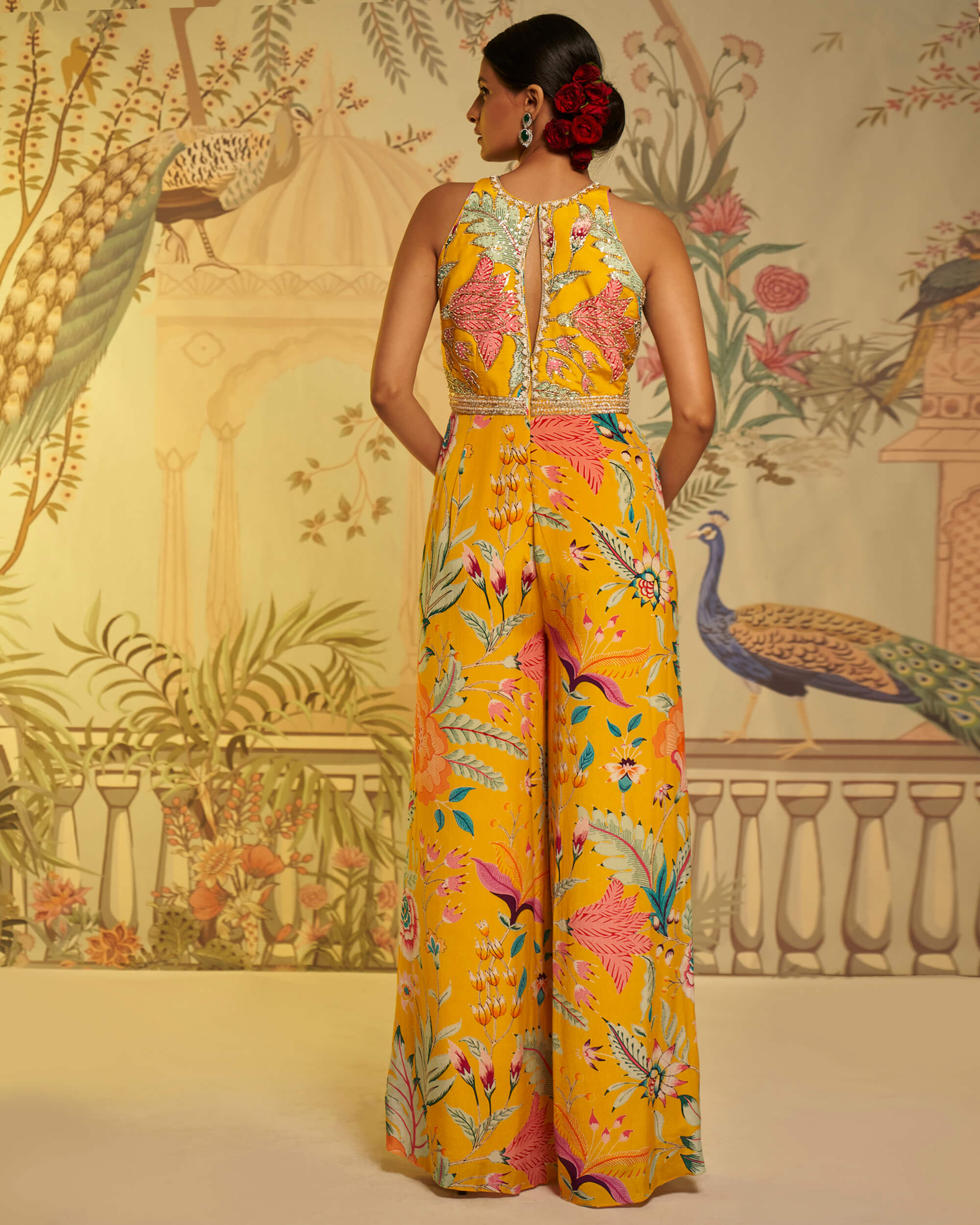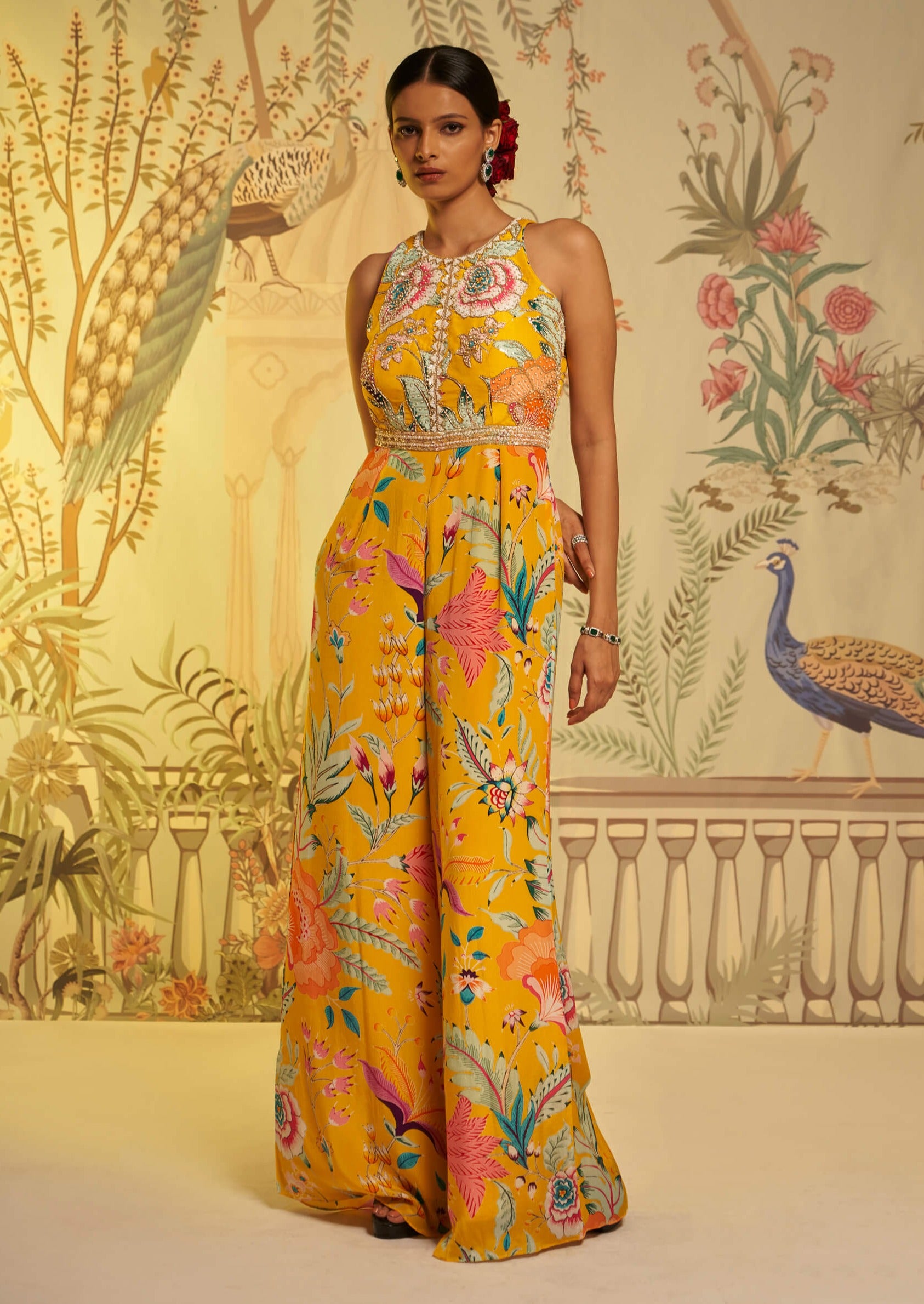 Step into contemporary elegance with the yellow amber floral jumpsuit, crafted from luxurious crepe silk. This sophisticated ensemble features a floral pattern that adds a touch of charm and uniqueness. Perfect for both formal events and casual gatherings, the yellow amber floral jumpsuit offers comfort and style in equal measure, ensuring you stand out with effortless grace and modern flair. Ideal for the fashion-forward woman looking to make a statement, this jumpsuit promises to be a versatile addition to your wardrobe.
