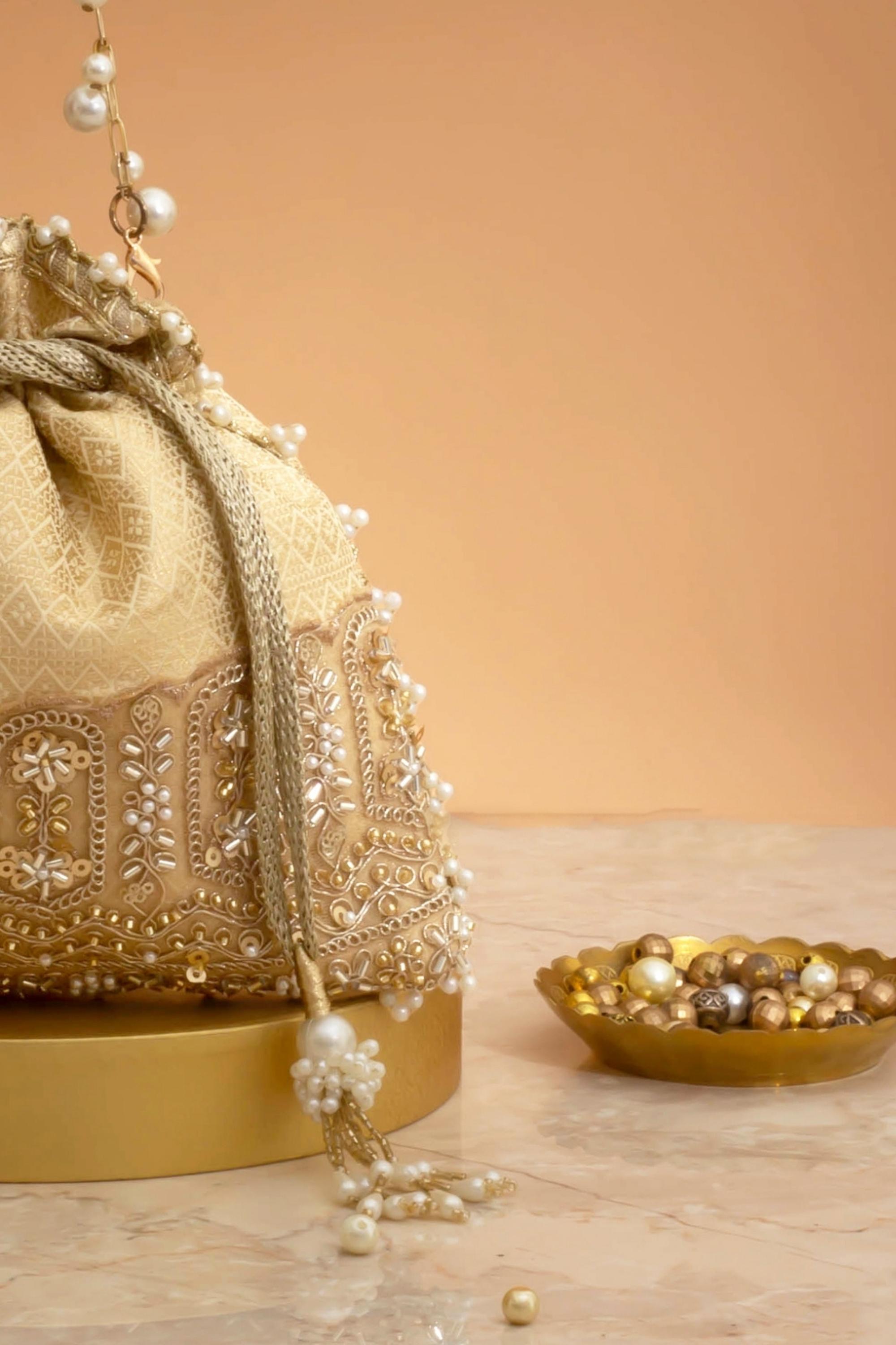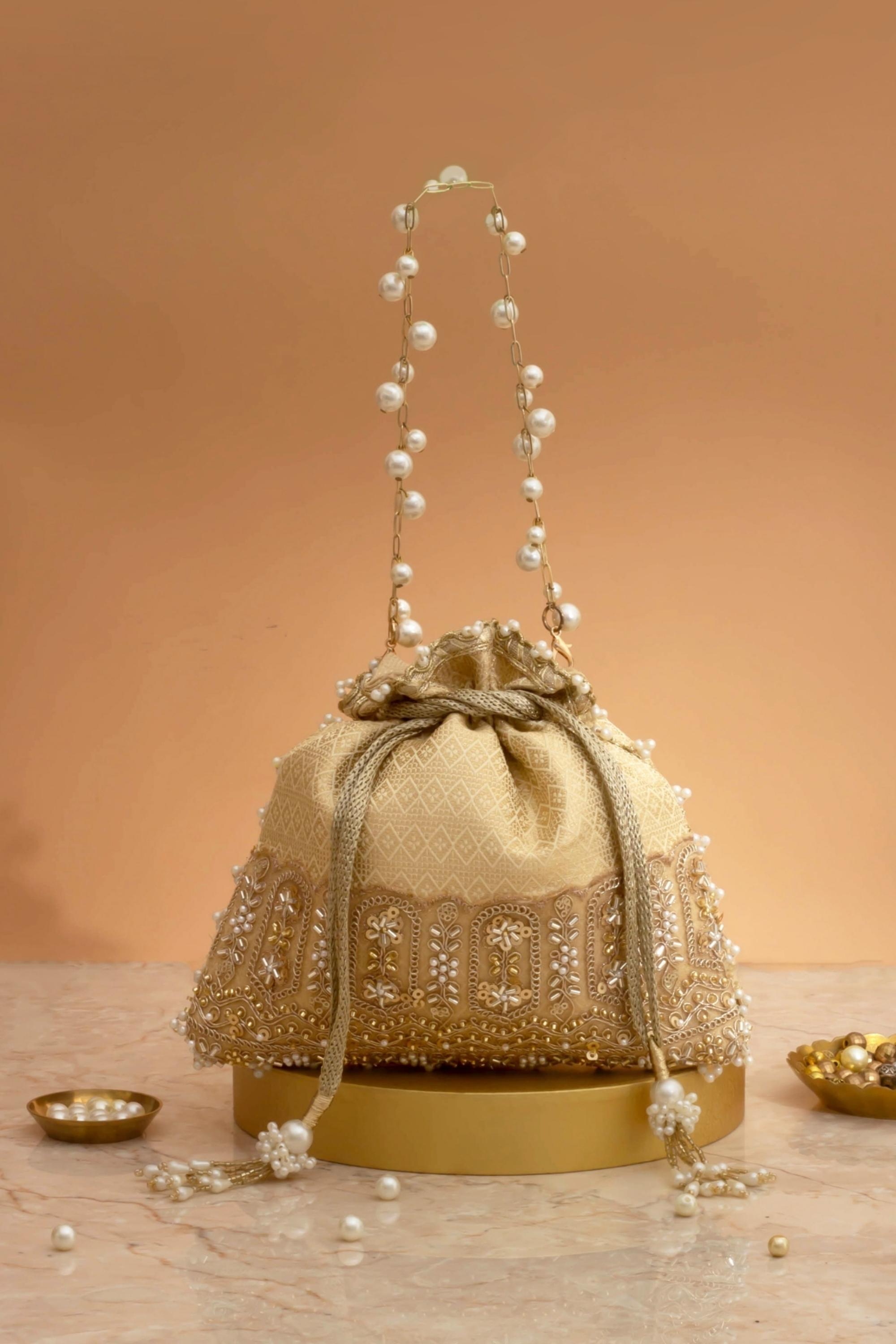 Fabric: Poly silk, woven light gold drawstring, cutdana lace, pearl tassels, pearl embellished metal sling handle