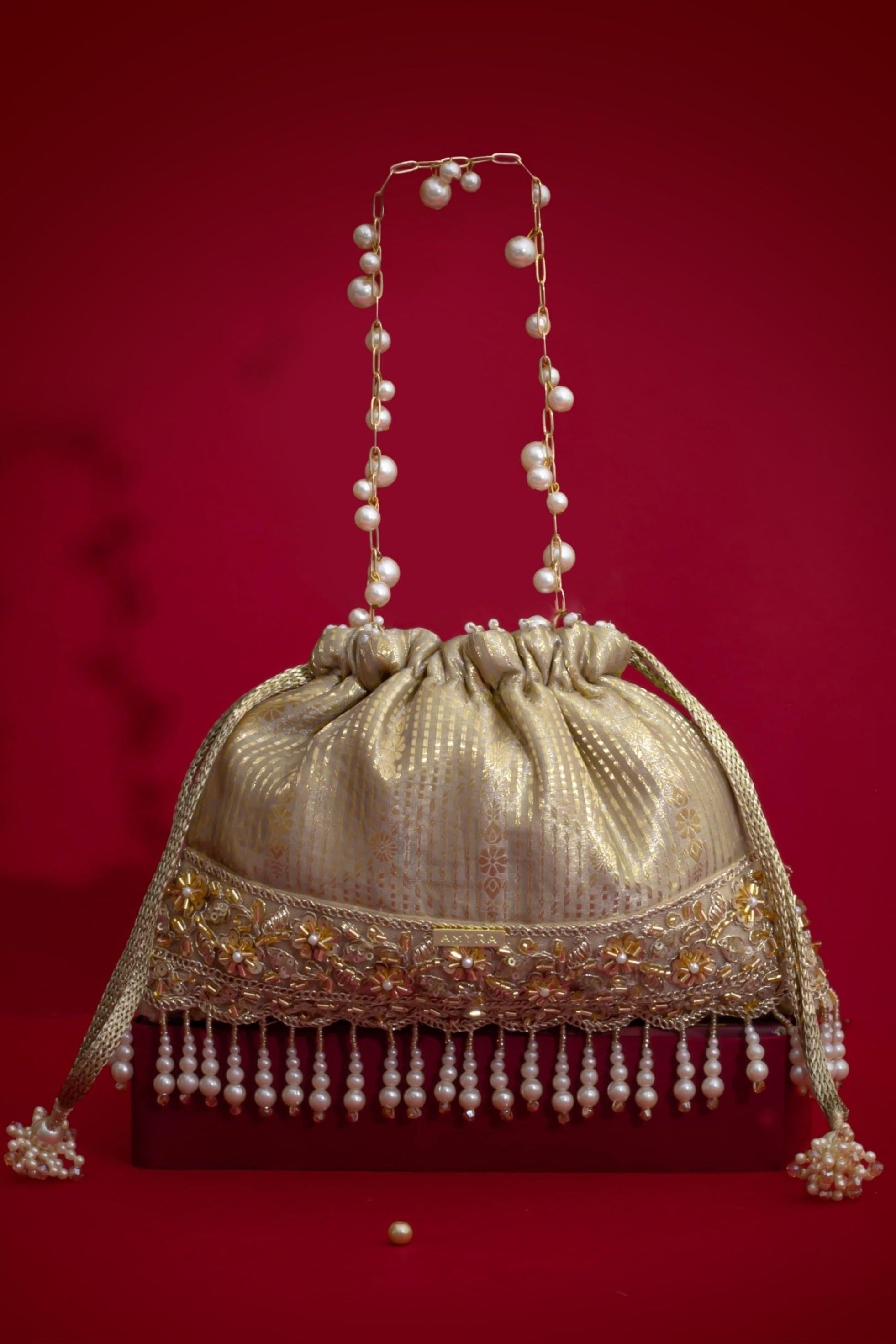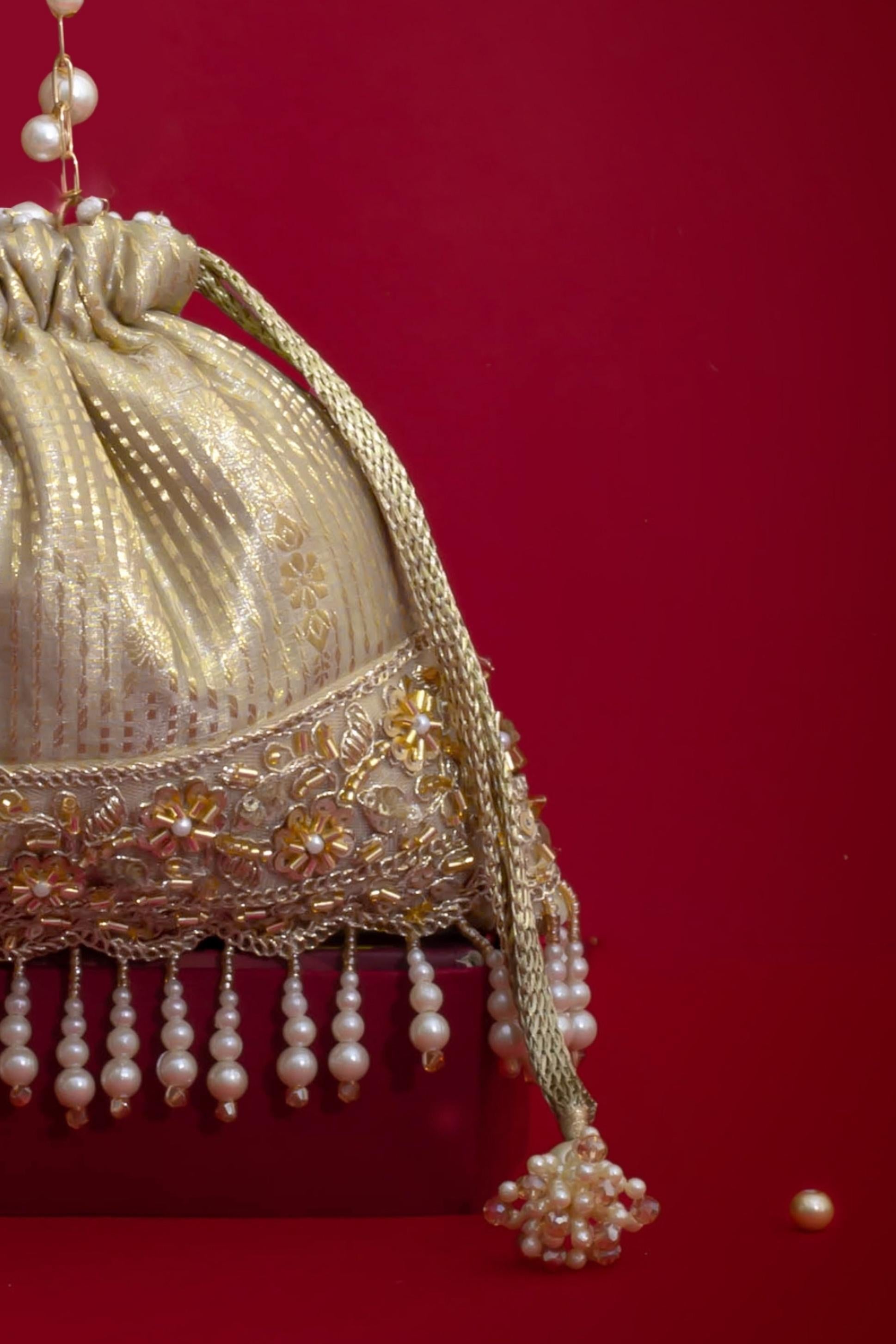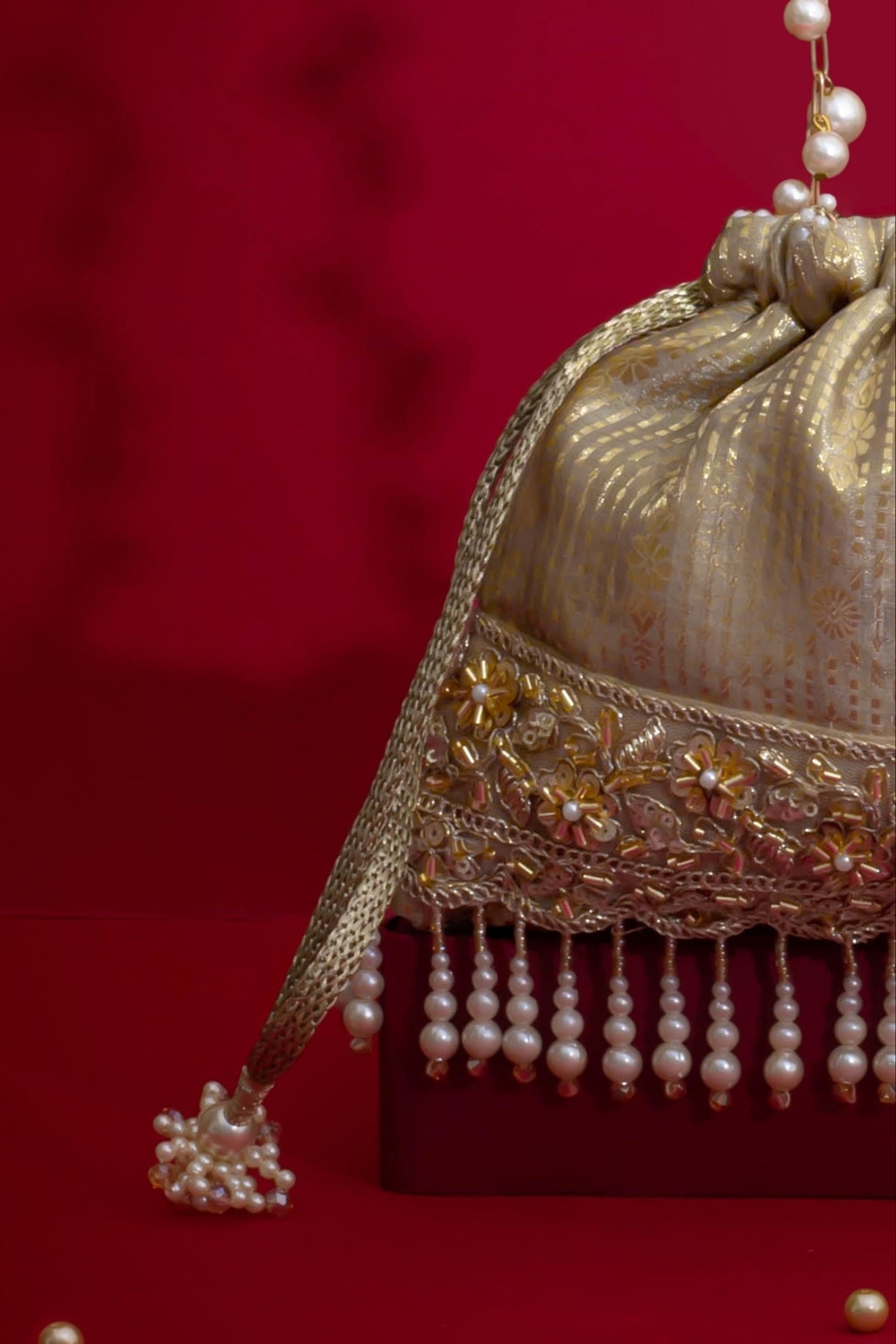 Material: Silk Organza, woven light gold drawstring, gold embroidered lace, pearl fringes, pearl tassels, pearl embellished metal sling handle