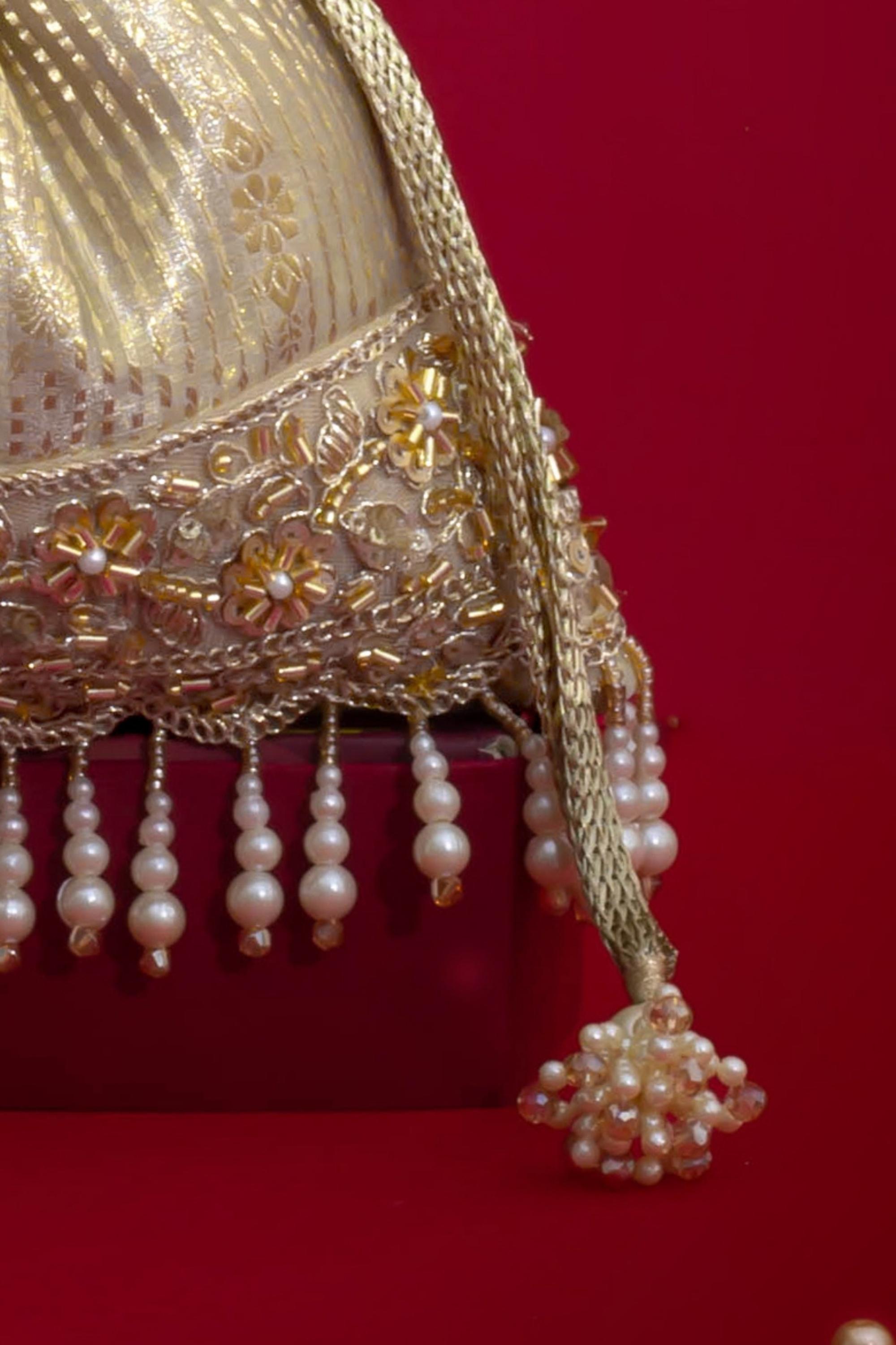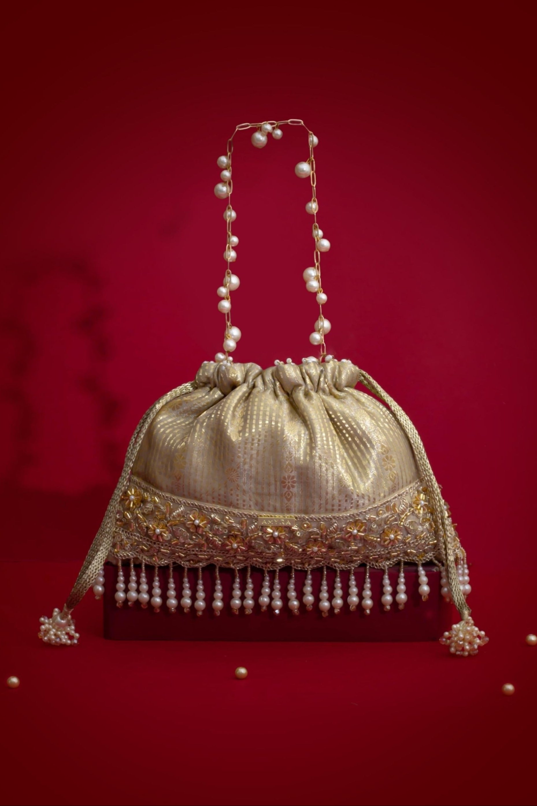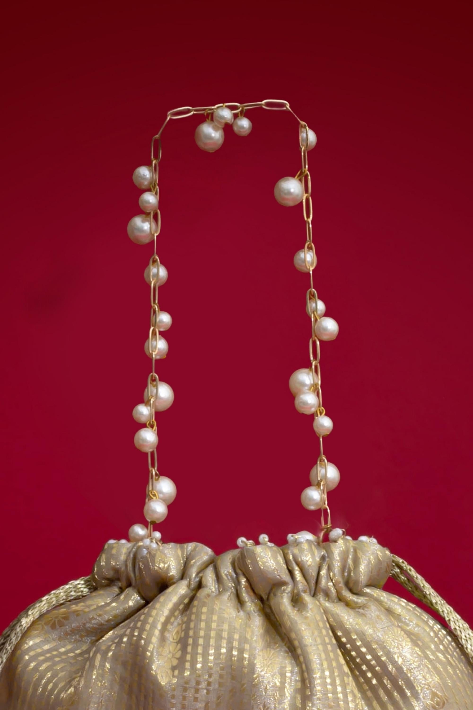 Material: Silk Organza, woven light gold drawstring, gold embroidered lace, pearl fringes, pearl tassels, pearl embellished metal sling handle