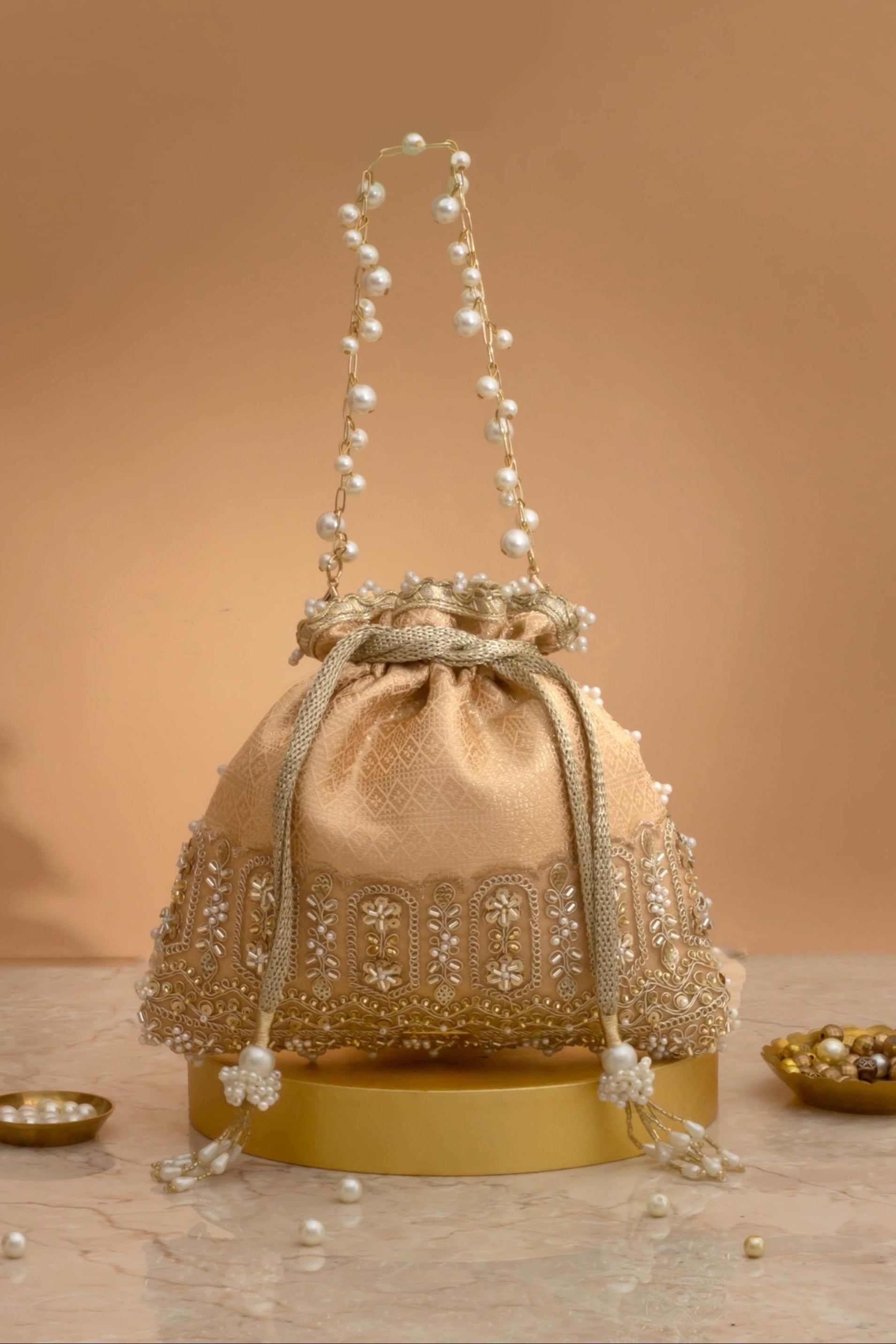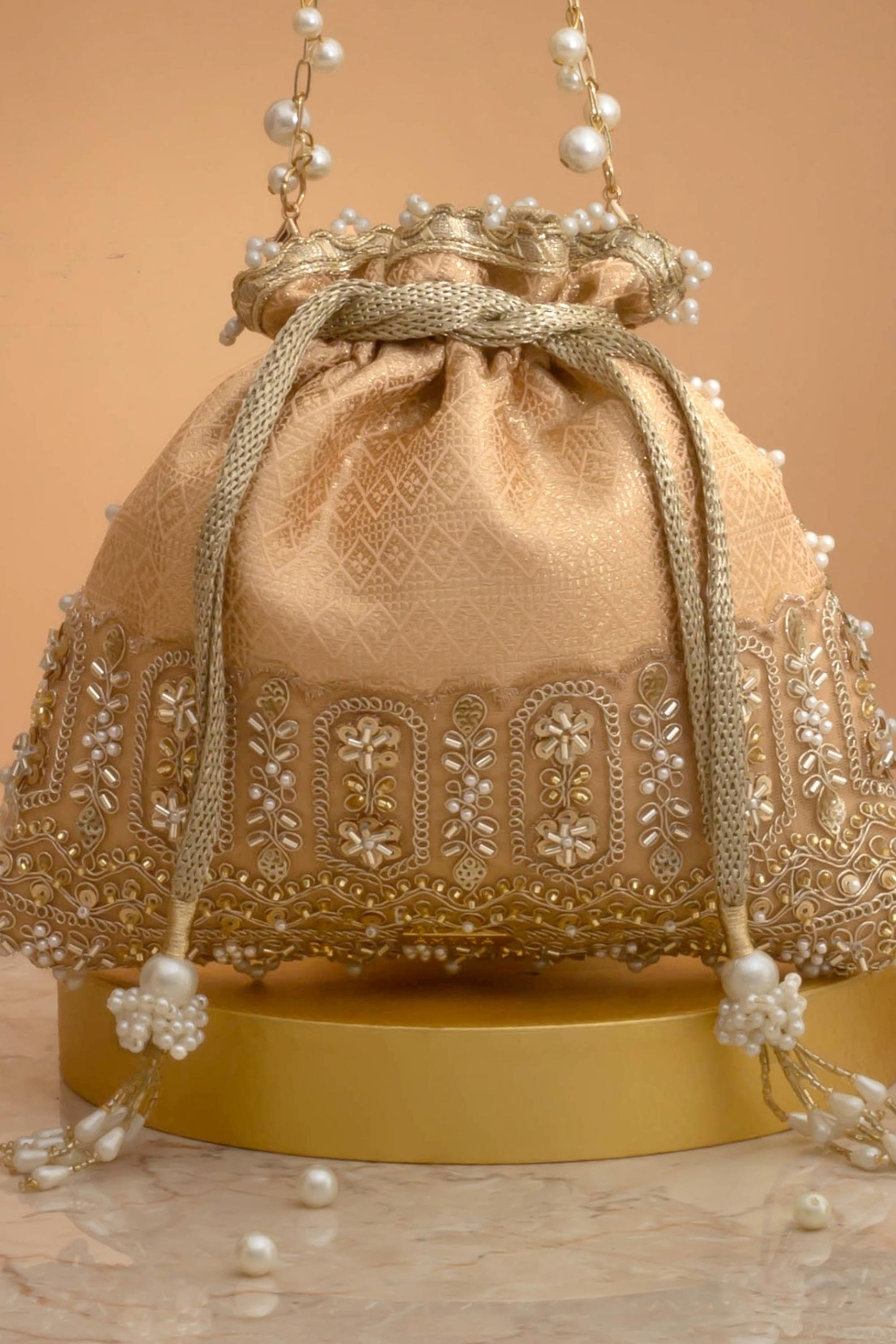 Fabric: Poly silk, woven light gold drawstring, cutdana lace, pearl tassels, pearl embellished metal sling handle