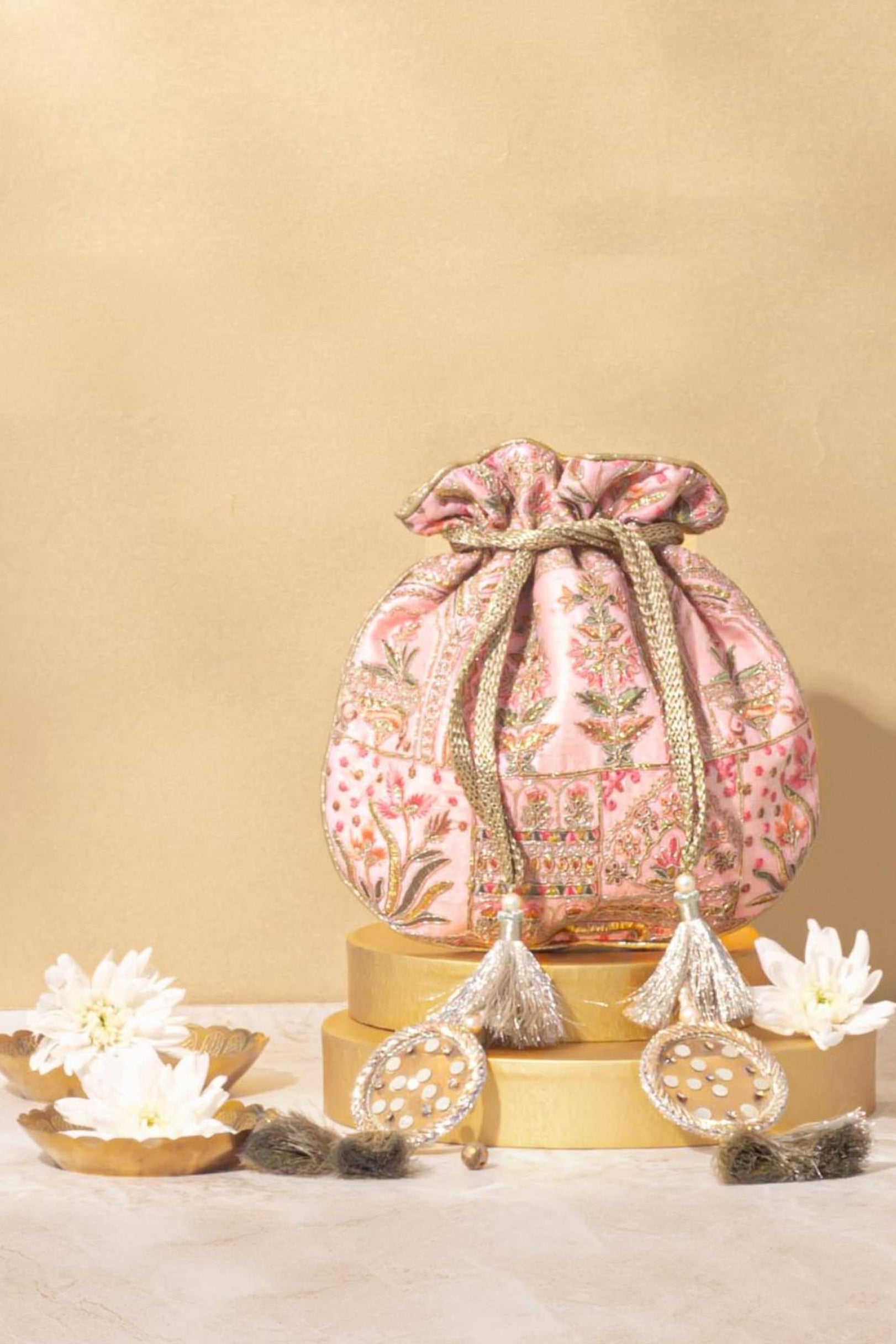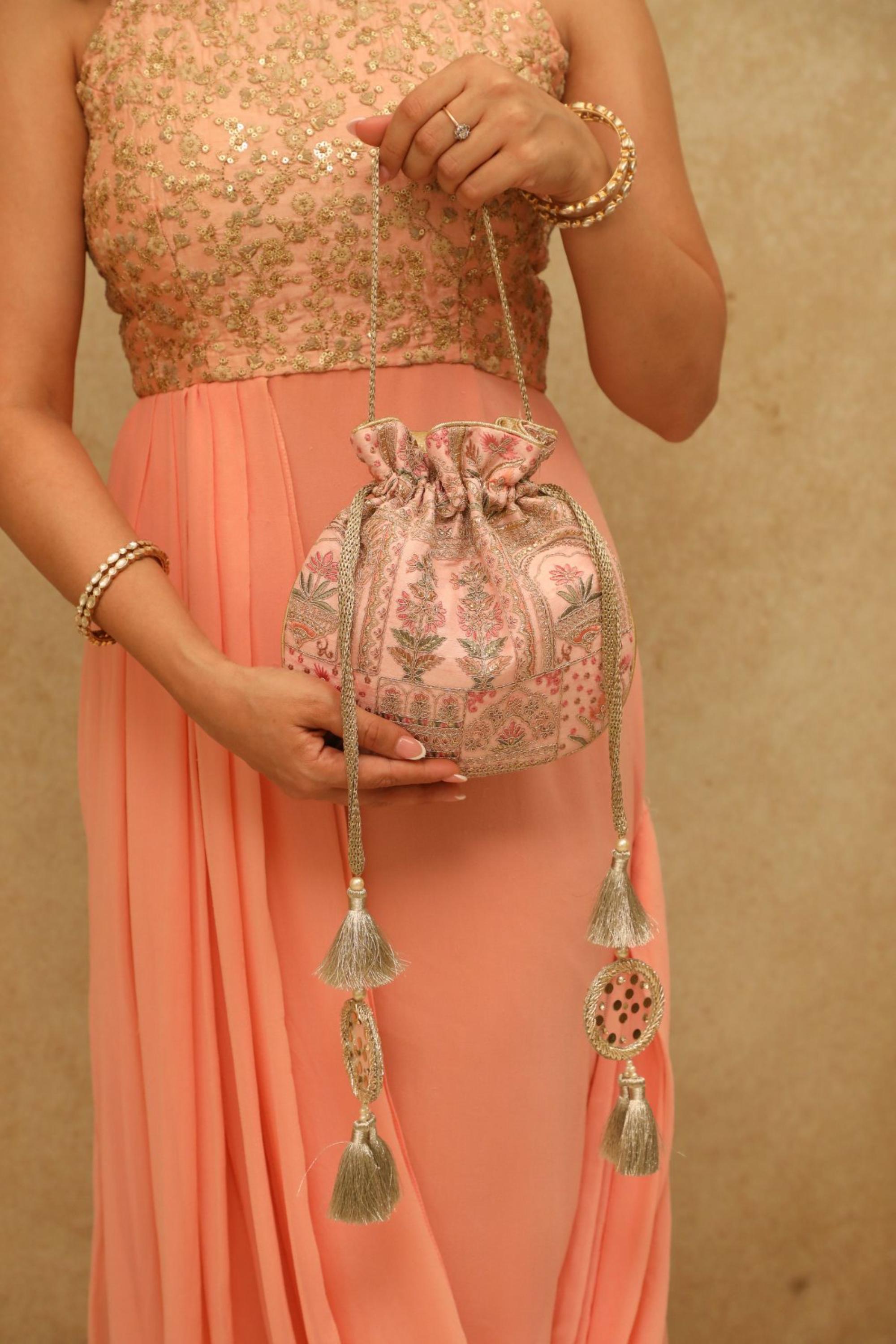 This pink amer potli bag by Amyra blends elegance with utility, making it a perfect accessory for festive and wedding occasions. Crafted with refined detailing, it adds a pop of color while maintaining sophistication. Compact yet spacious, this potli bag is ideal for carrying essentials like phones, lipsticks, and cards while complementing both traditional and modern outfits. The vibrant pink hue symbolizes festivity and joy, making it an excellent pick for sangeet nights, mehendi ceremonies, or as a statement piece at a wedding reception. A timeless accessory, this potli bag effortlessly enhances any celebratory look.