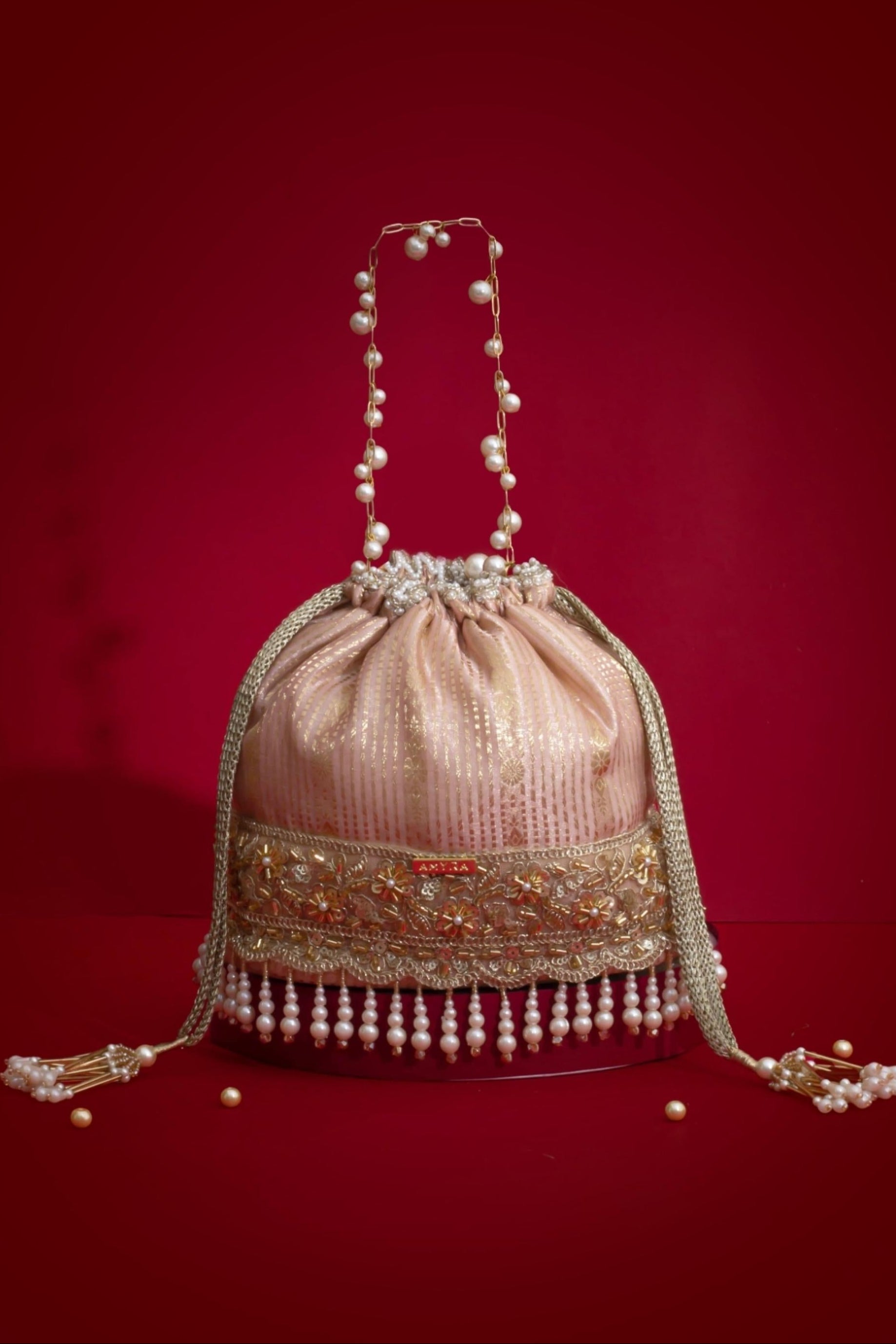 Material: Silk Organza, woven light gold drawstring, floral embroidered lace, pearl fringes, beaded tassels, pearl embellished metal handle