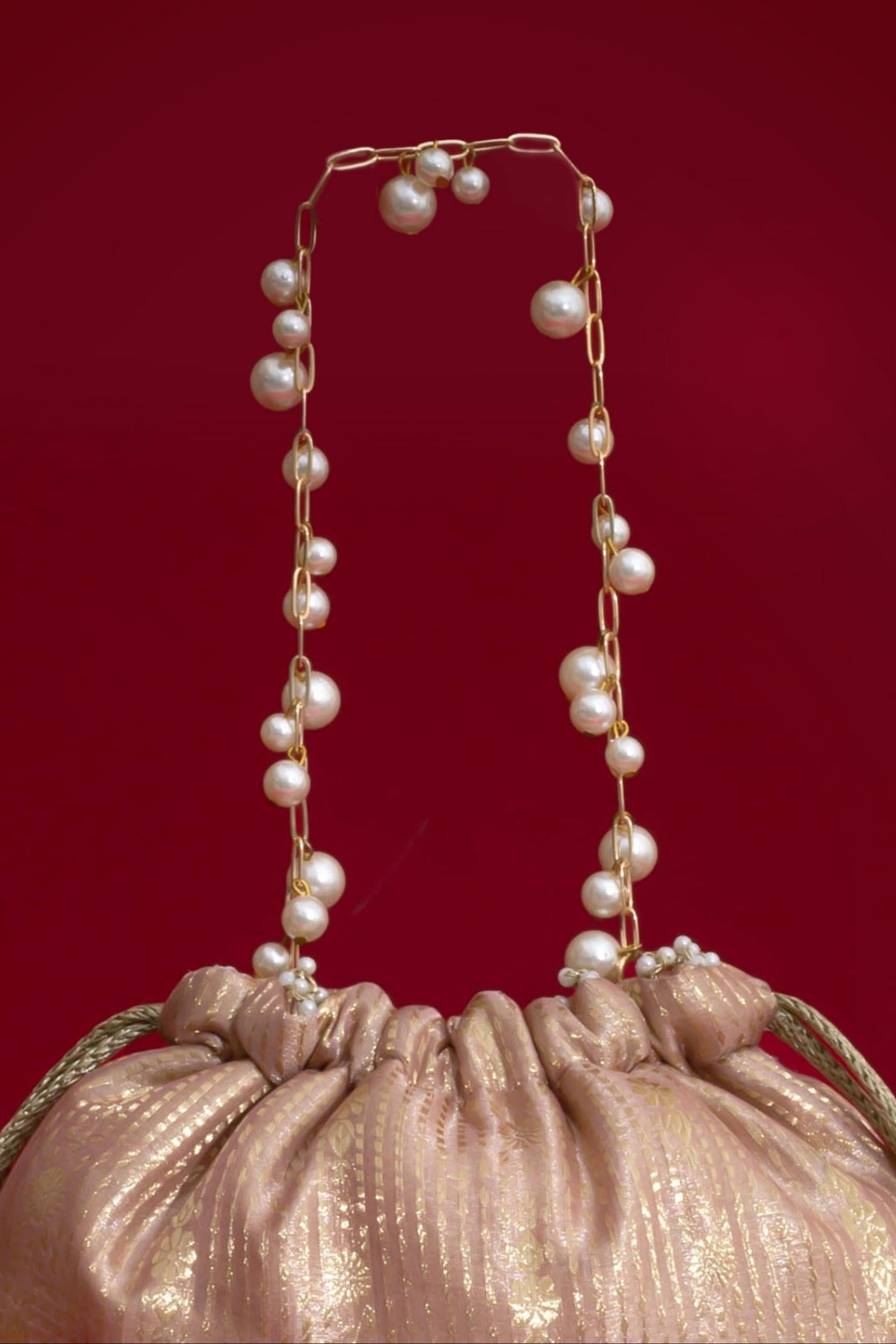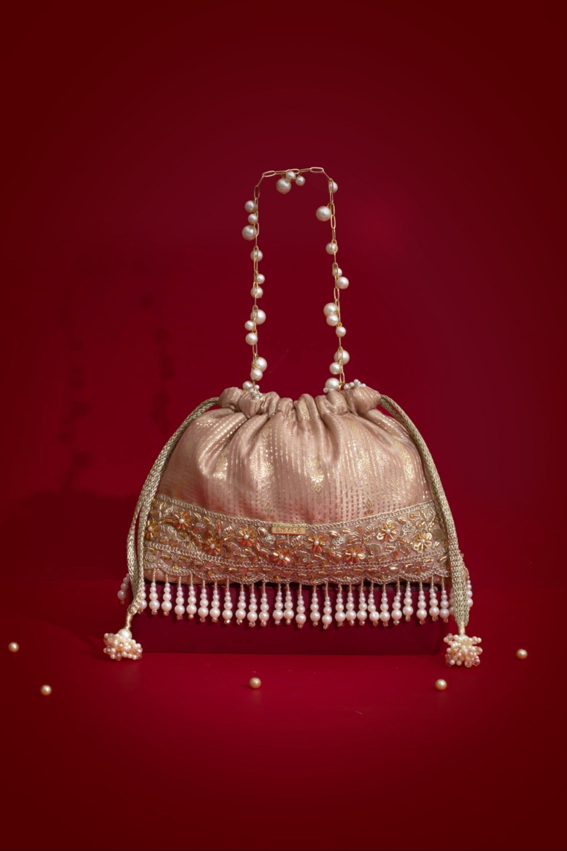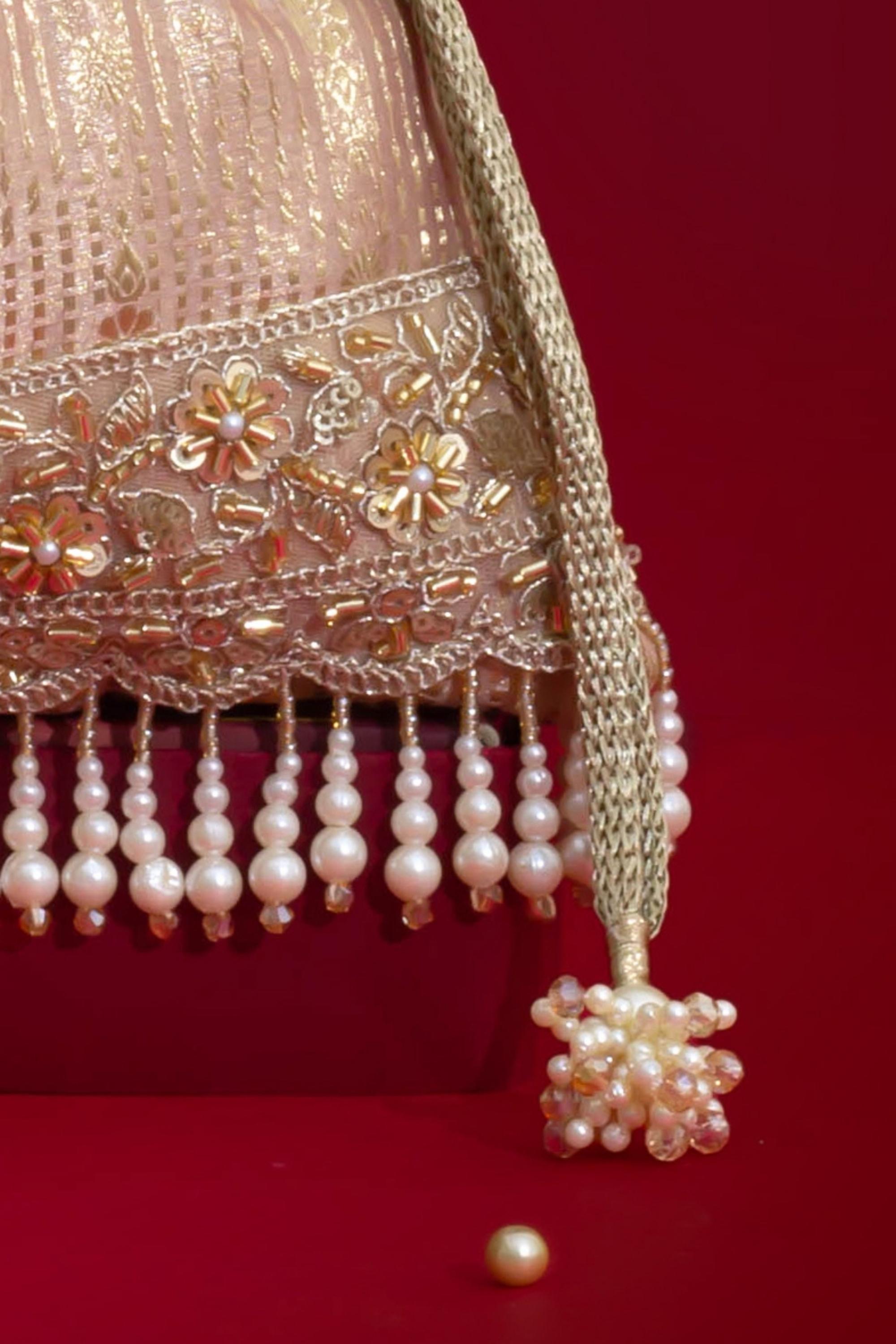 Material: Silk Organza, woven light gold drawstring, gold embroidered lace, pearl fringes, pearl tassels, pearl embellished metal sling handle