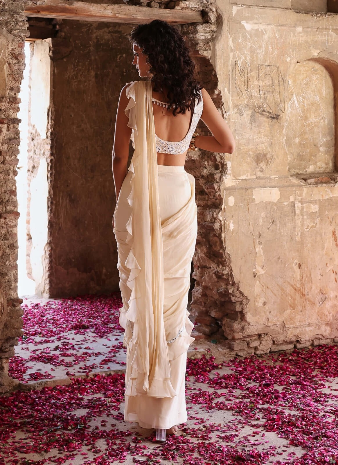 The Anima ivory embellished choli is exquisitely paired with a pre-stitched ruffle saree, featuring a richly embellished pallu. This captivating ensemble seamlessly blends traditional elegance with contemporary flair, highlighting intricate detailing and a graceful silhouette. Perfect for festive occasions, it offers a sophisticated look that guarantees a stunning impression. Embrace the allure of timeless beauty and make a memorable statement with this exquisite combination, designed to elevate your style with effortless grace.