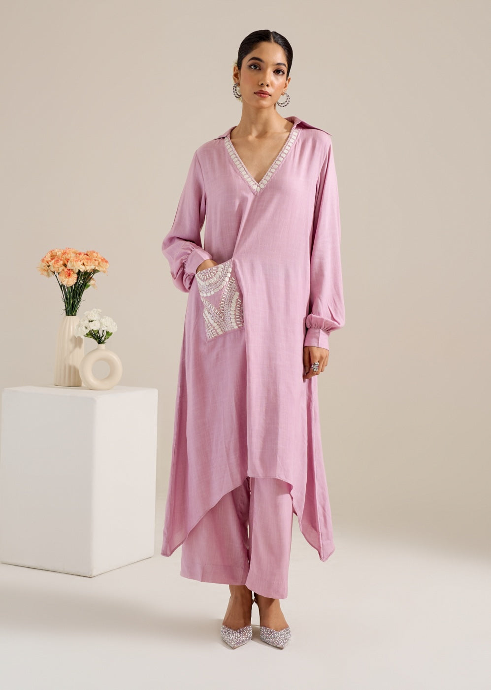 Elevate your wardrobe with our Asymmetric Kurta Set, showcasing a distinctive hand-embellished pocket design that adds a touch of intricate artistry and sophistication. The kurta’s asymmetrical cut offers a modern, avant-garde silhouette, while the meticulously adorned pockets provide a unique blend of functionality and elegance. Paired with matching pants, this set seamlessly integrates contemporary style with classic craftsmanship, making it ideal for both upscale events and stylish daywear. Embrace a look that effortlessly combines innovation with traditional charm.