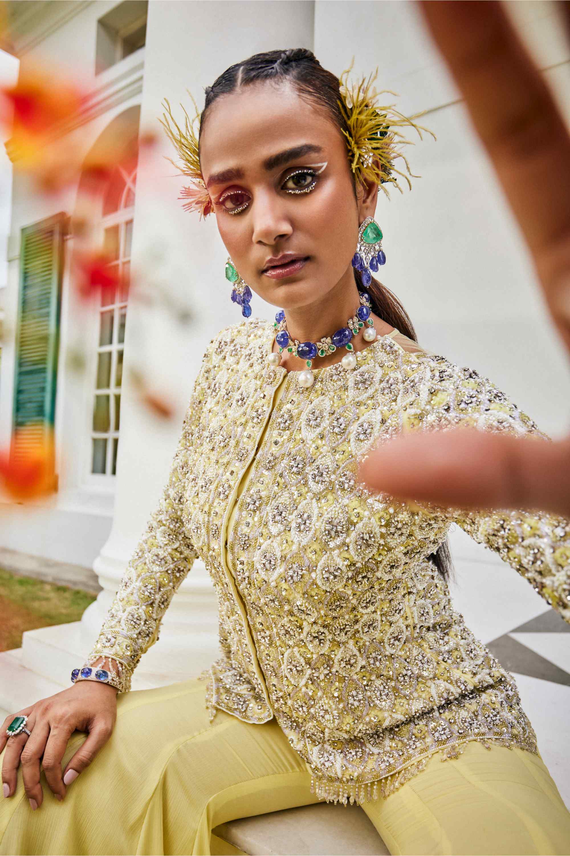 Illuminate any event with this stunning ensemble, featuring a jacket that beautifully blends yellow and lilac hues. The jacket is adorned with meticulous cutdana, pearl, and sequins embroidery, adding a touch of shimmer and sophistication. Handmade buttons and playful tassels enhance its intricate design, creating a unique and eye-catching detail.