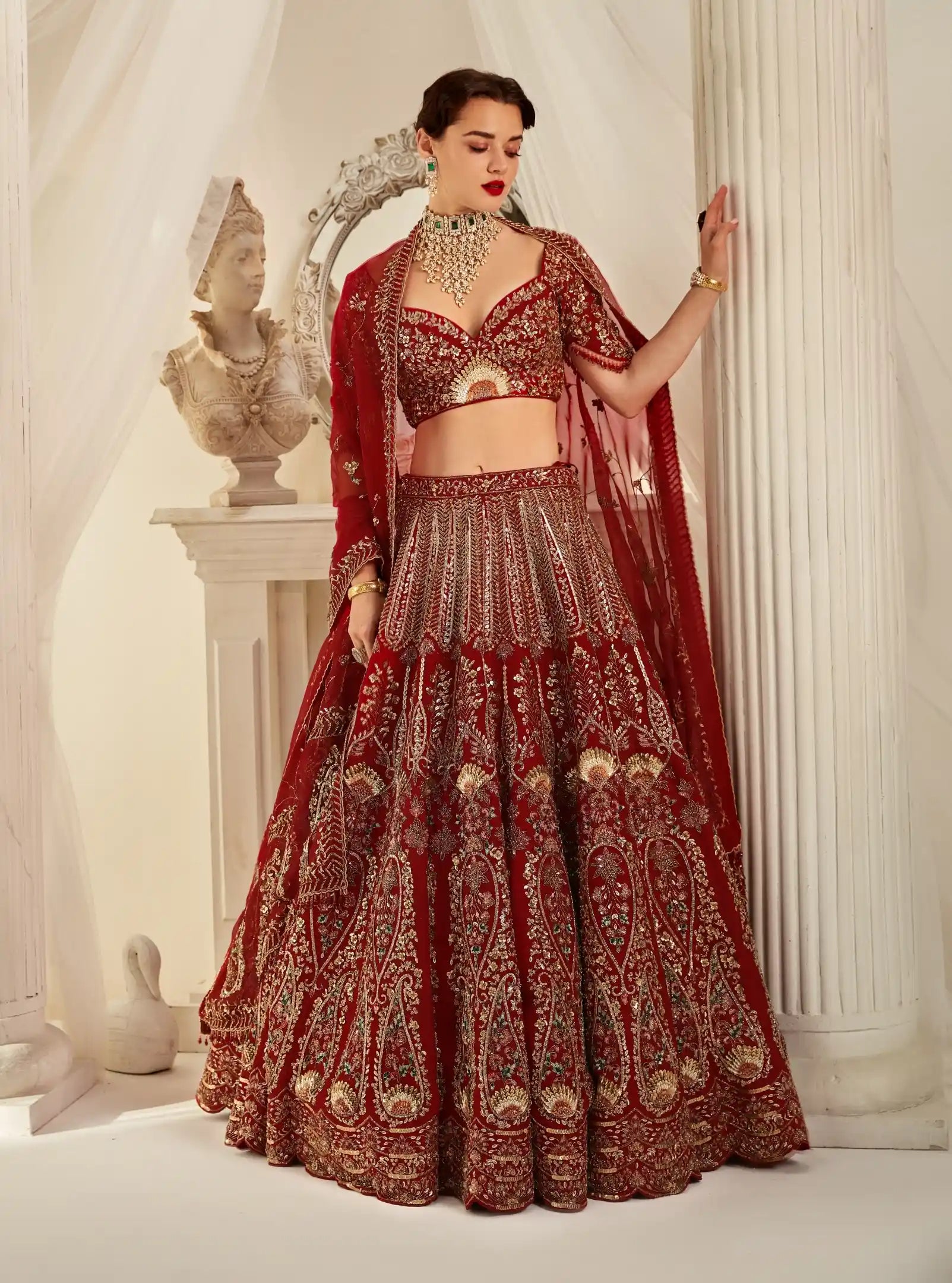 This antique barn red bridal lehenga choli set, crafted from luxurious raw silk, features intricate glass beads, artful sequin, nakshi, and dabka work. Accompanied by two elegantly draped dupattas, this ensemble combines opulent detailing with timeless sophistication, perfect for a memorable bridal look.
