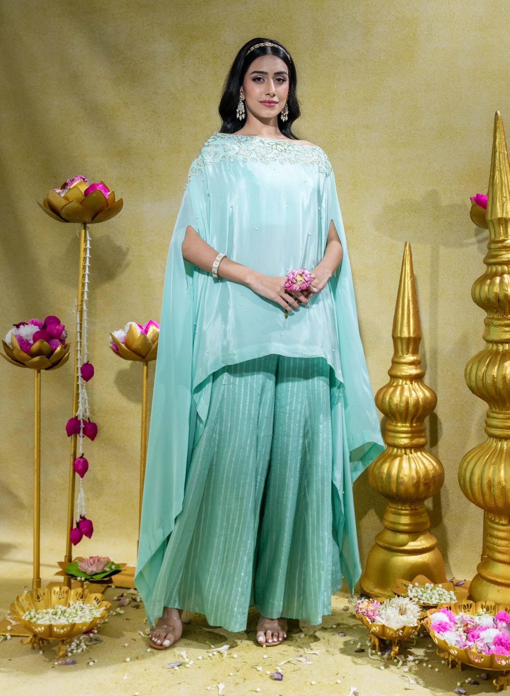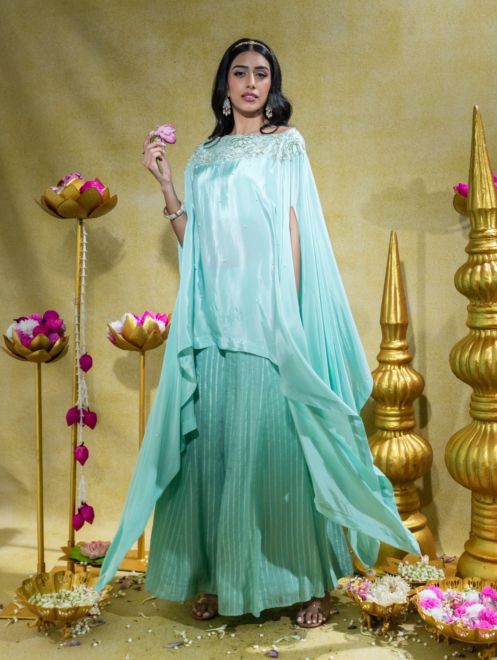 Elevate your style with our captivating aqua asymmetric embroidered top, paired with a matching bralet and flared pants. The top, featuring a unique asymmetric design and intricate embroidery, offers a contemporary take on classic elegance. Its refreshing aqua hue is complemented by the tailored bralet, which provides a chic, structured look. The ensemble is completed with flared pants that add a graceful, flowing silhouette to the outfit. Perfect for both special occasions and stylish events, this set seamlessly blends modern sophistication with timeless charm, ensuring you make a statement with every wear.