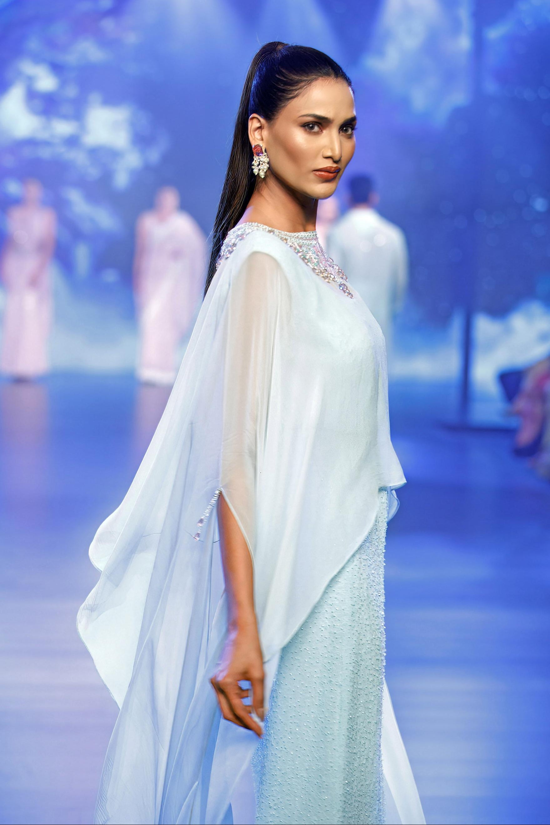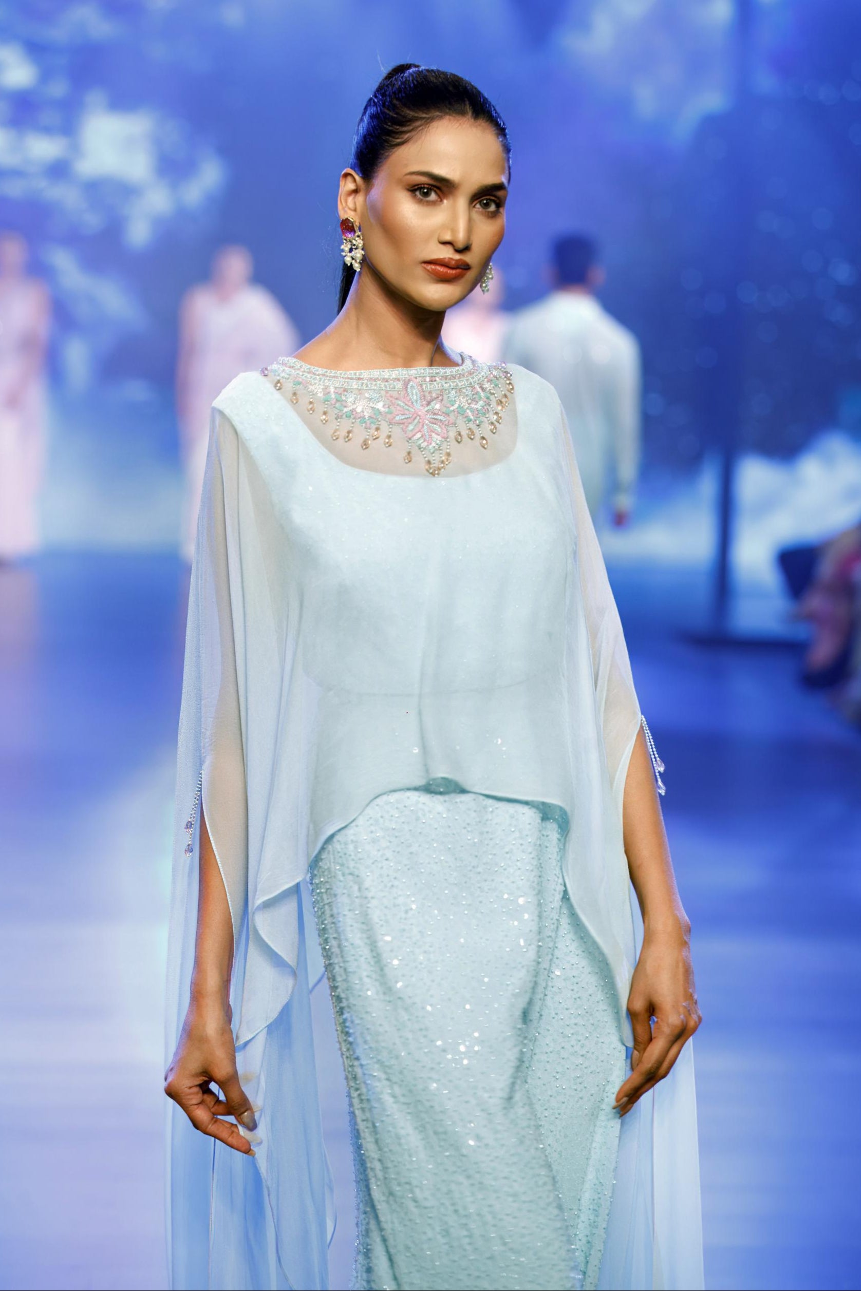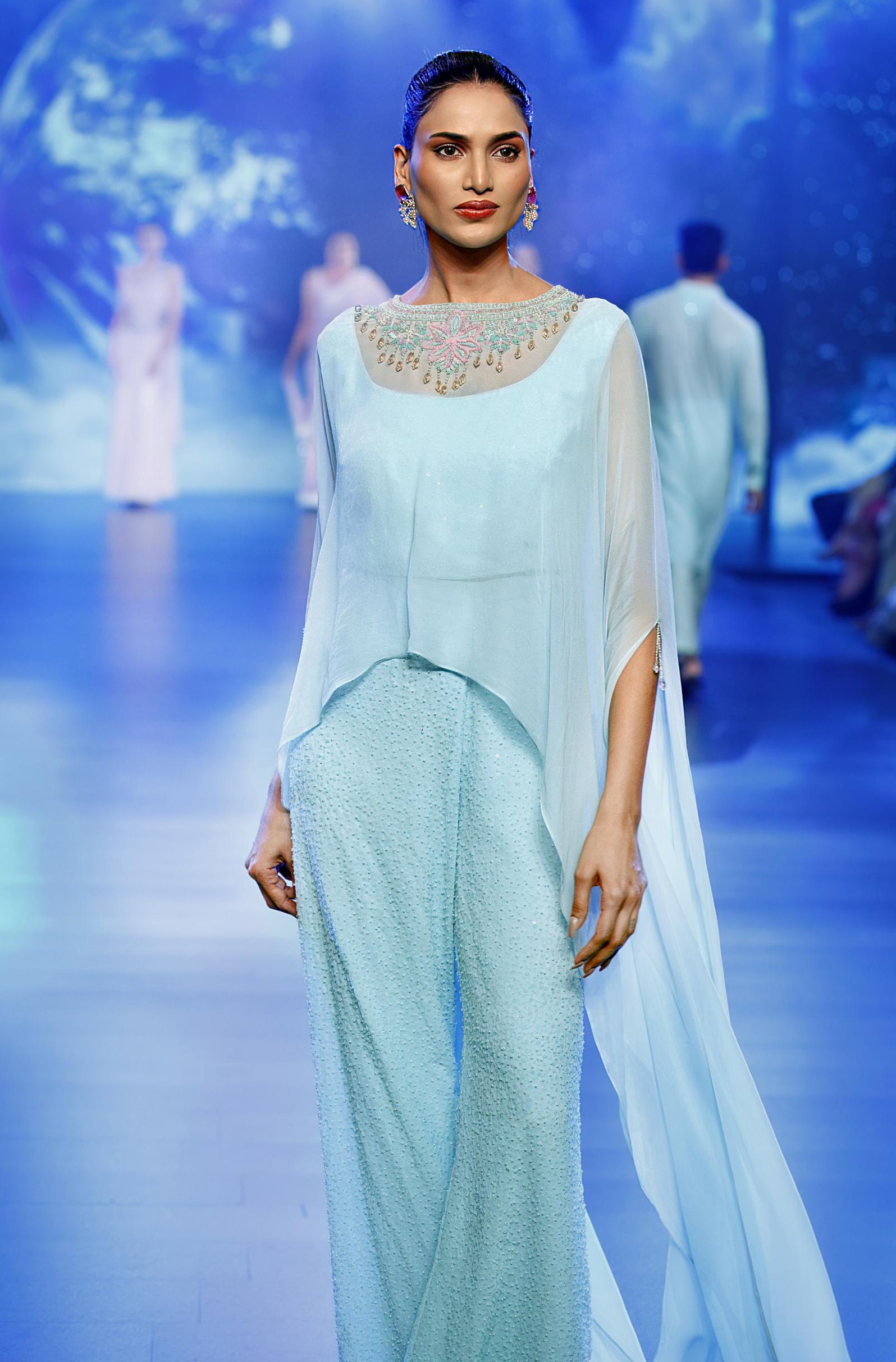 The Aqua Georgette Cape with tonal embroidery, hand embroidery, and beaded work is a statement piece that blends modern sophistication with intricate craftsmanship. The flowing cape adds a dramatic flair, while the blouse and palazzo pants feature delicate hand-embroidered details and shimmering beaded accents for a touch of luxury. This elegant ensemble is perfect for upscale events, offering a stylish and comfortable fit that exudes grace and timeless appeal. Ideal for making a standout impression at any celebration.