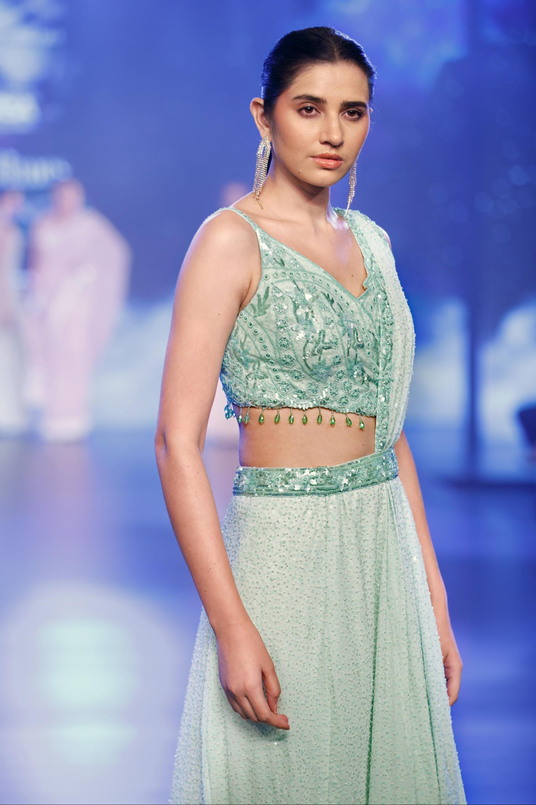 This Aqua Georgette Tonal Embroidered Sari is a stunning fusion of elegance and craftsmanship. The sari features delicate tonal embroidery with intricate hand embroidery and beaded work, adding a rich texture and sophistication. Paired with a matching blouse and a stylish belt, this ensemble is perfect for formal events or celebrations. The lightweight georgette fabric drapes beautifully, ensuring comfort and grace, while the hand-embellished details elevate its luxurious appeal.