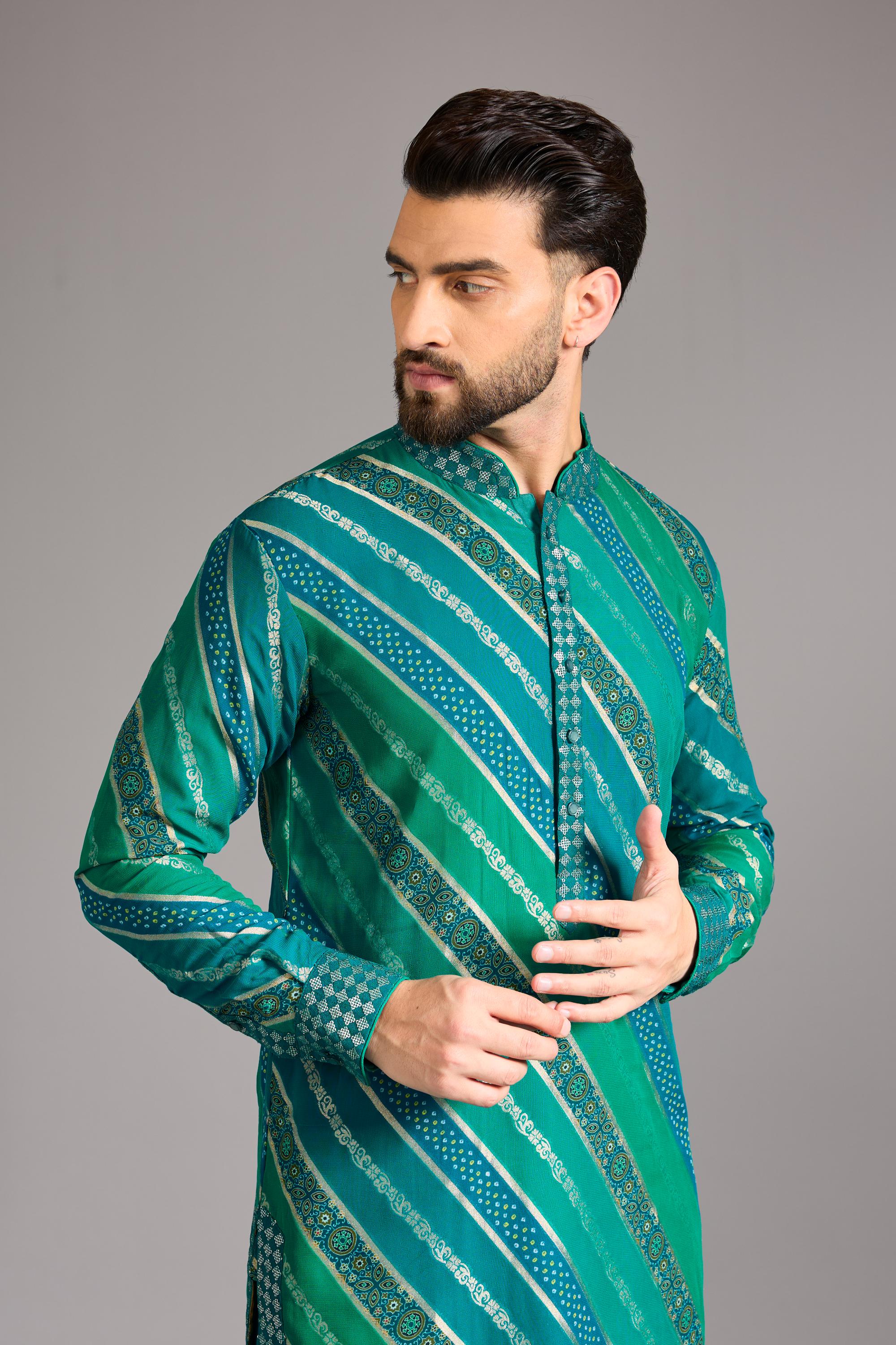 The Aqua Blue Leheriya Bandhini Kurta Set is a stunning fusion of vibrant colors and traditional craftsmanship. The leheriya and bandhini techniques create a beautiful, flowing pattern that brings a sense of movement and elegance to the piece. The cool aqua blue hue offers a refreshing, serene vibe, making it a perfect choice for summer events and celebrations. The set design reflects the beauty of Indian heritage while offering modern sophistication, ideal for pairing with delicate jewelry and stylish footwear.