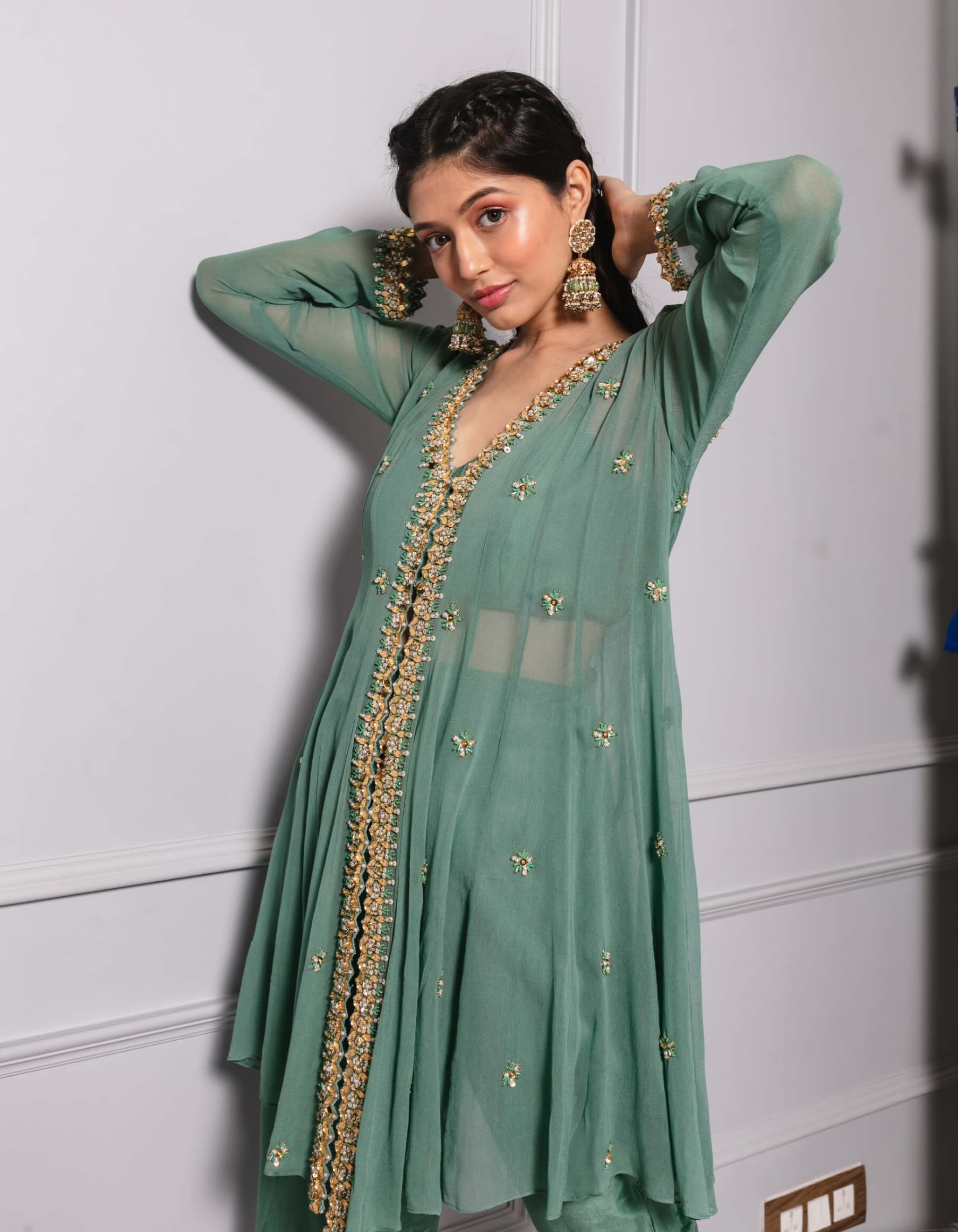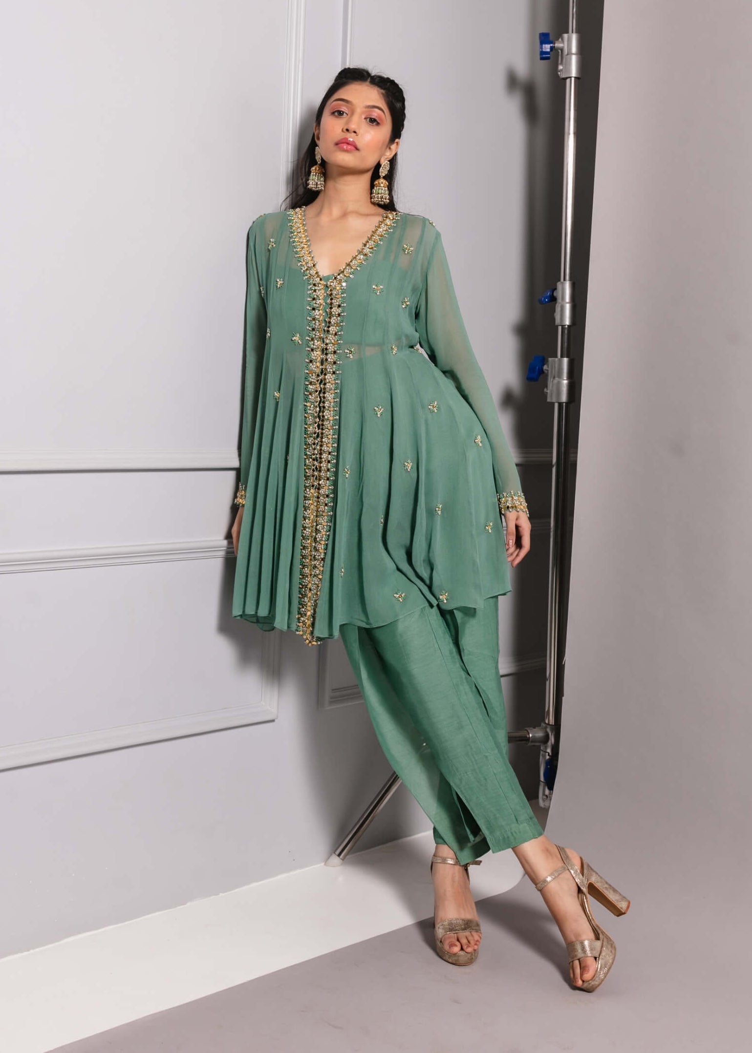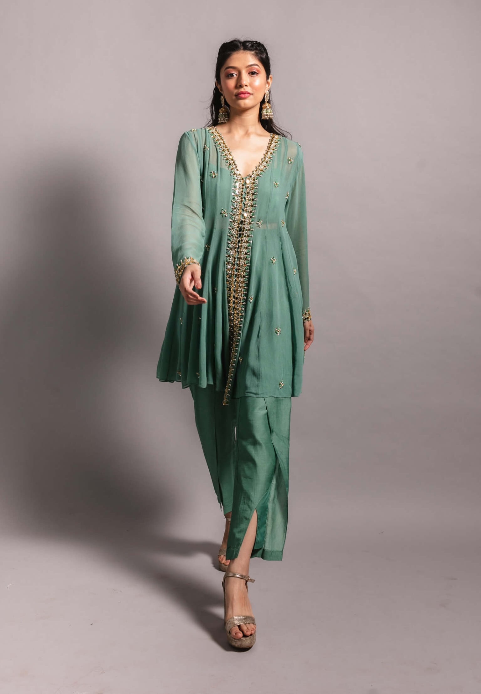 Introducing our sophisticated aqua panelled embroidered short top in georgette, paired elegantly with cotton silk flap pants and a coordinating bustier. This ensemble blends modern design with traditional craftsmanship, offering a chic and stylish look ideal for upscale events and special occasions.