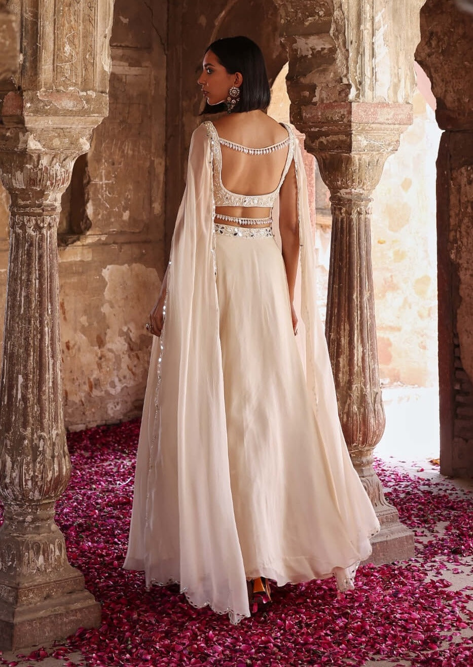 Discover timeless elegance with the Areen Ivory Embellished Choli, featuring elegant attached flared sleeves. This refined choli is beautifully paired with a circular skirt that boasts an embellished belt and a stylish can-can underskirt for added volume. Merging traditional sophistication with modern flair, this exquisite ensemble creates a striking silhouette, ideal for festive celebrations and special occasions. Crafted with attention to detail and luxurious materials, it promises a stunning, graceful look that ensures you stand out. Elevate your wardrobe with this perfect blend of classic and contemporary style.