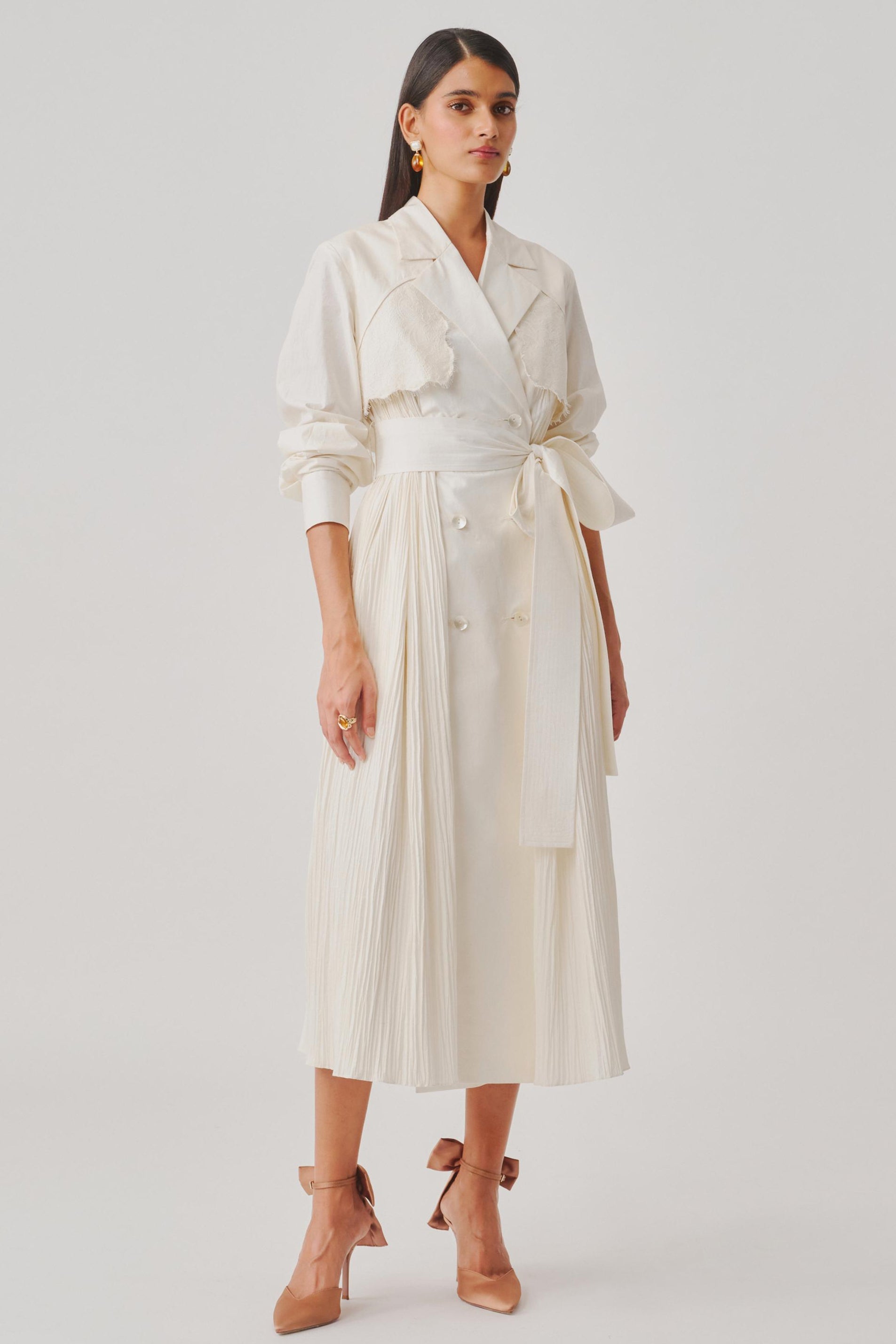 Minimal yet impactful, the ivory atelier trench dress blends tailoring with contemporary elegance. Ideal for evening events, gallery nights, or fashion-forward gatherings, it offers a refined silhouette with modern appeal. The structured form makes it a versatile choice for statement dressing without excess.