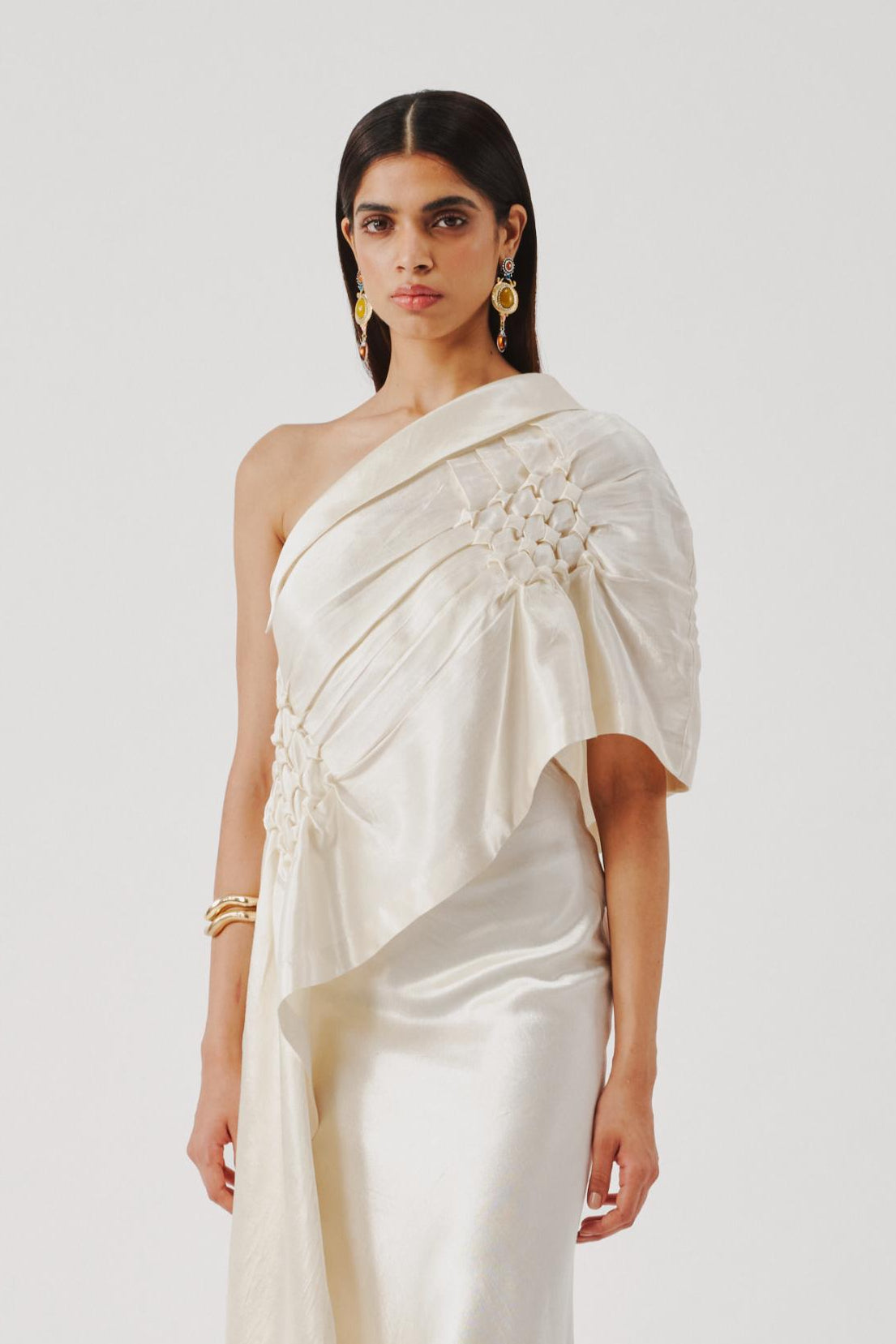 ĀROKA, founded by Shweta Agarwal in 2019, reflects the Sanskrit idea of “light shining through woven cloth.” The label merges contemporary design with India’s artisanal heritage, defined by sculpted silhouettes and thoughtful detailing. Each piece is ethically handcrafted by skilled artisans, translating precision and purpose into effortlessly refined occasionwear.