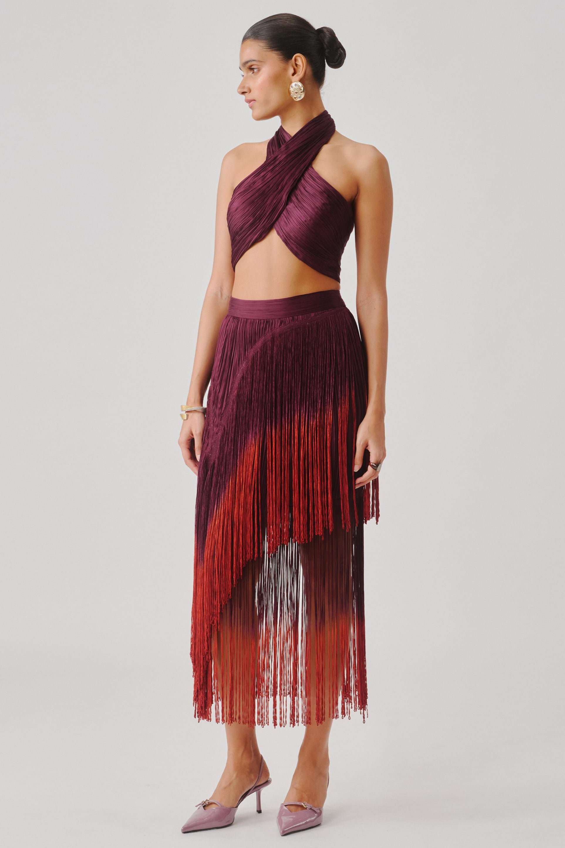 The maroon fringe skirt by Aroka is curated for bold contemporary styling with a playful edge. Designed with dynamic fringe detailing, this skirt adds movement and texture to festive and evening ensembles. The deep maroon shade offers versatility while maintaining a statement aesthetic. Ideal for pairing with fitted tops or halter blouses, this skirt reflects modern craftsmanship and fashion-forward sensibility.