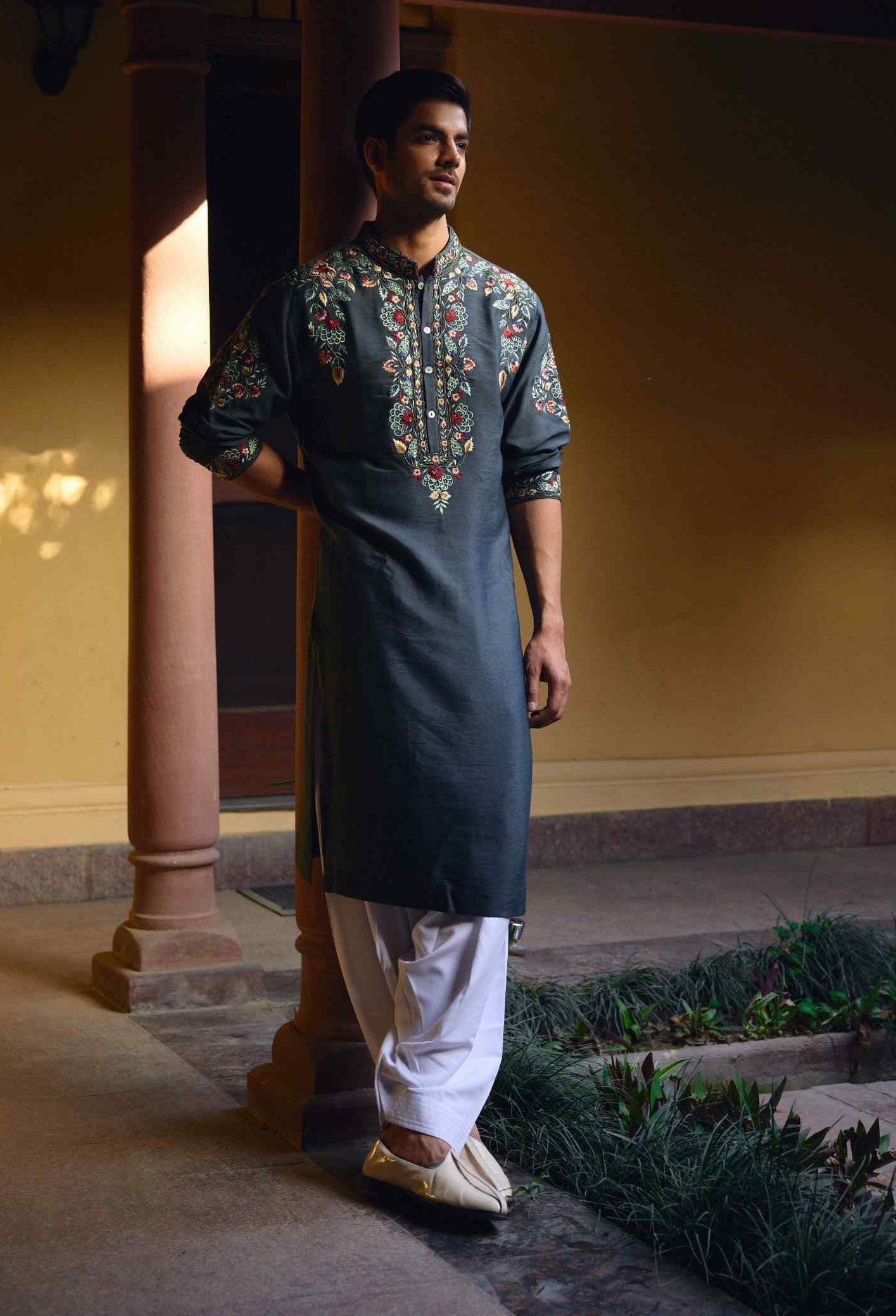 Elevate your festive look with the Asirgarh Kurta in Gray Slate. Crafted from a luxurious cotton silk blend, this kurta combines comfort and sophistication, making it perfect for Haldi, Mehndi, or Sangeet ceremonies. Featuring intricate hand embroidery on the neck and a versatile gray slate color, it offers subtle elegance and traditional craftsmanship. Paired with an off-white salwar, this outfit ensures a sleek, polished appearance. Ideal for grooms seeking a refined and stylish look, it complements both traditional and modern footwear.