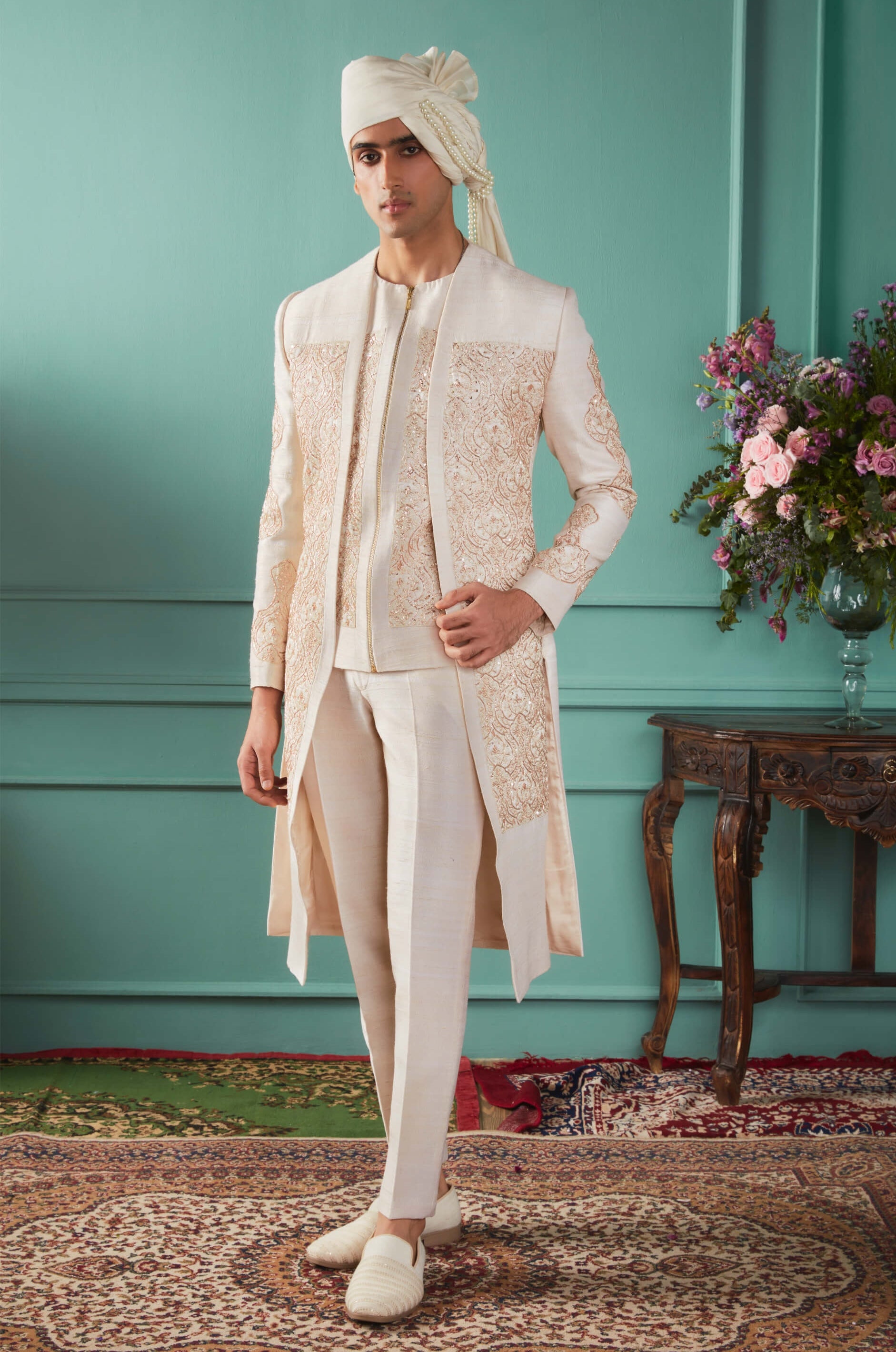 An elegant sherwani set crafted from raw silk, featuring exquisite zardosi patchwork and intricate zardosi and sequins detailing. This refined sherwani is complemented by matching raw silk pants, making it the perfect choice for an engagement ceremony, where sophistication meets timeless style.