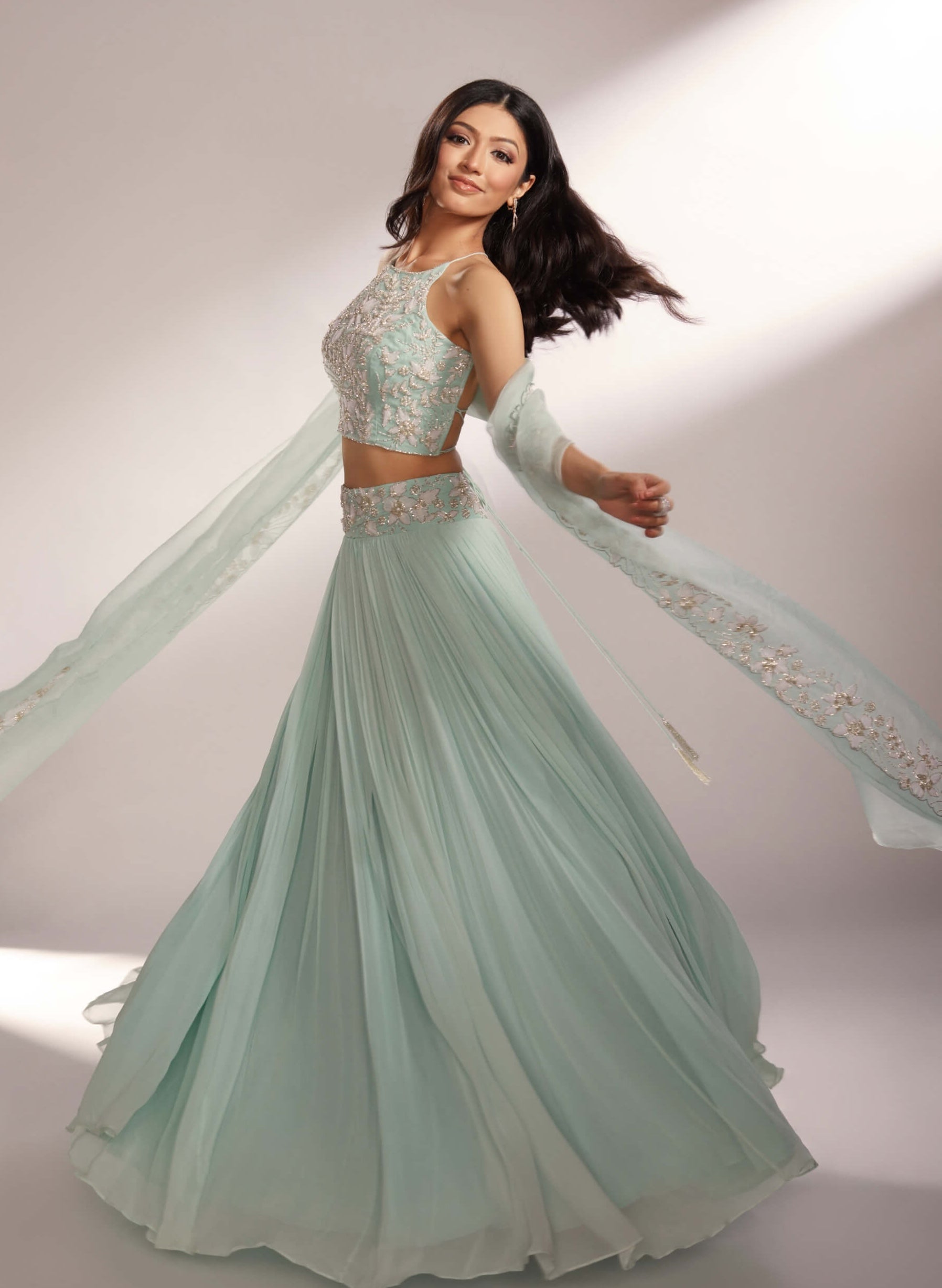 Elevate your wardrobe with this exquisite light aqua lehenga set, a testament to refined elegance and intricate craftsmanship. Adorned with delicate organza floral details and shimmering silver glass beads interspersed with lustrous pearls, this ensemble captures a serene yet sophisticated charm. The blouse features a stunning criss-cross open back design, merging modern allure with timeless grace. Complementing the lehenga is a one-sided embroidered dupatta that adds a touch of intricate artistry, making this set a perfect choice for those seeking a blend of contemporary style and traditional opulence.