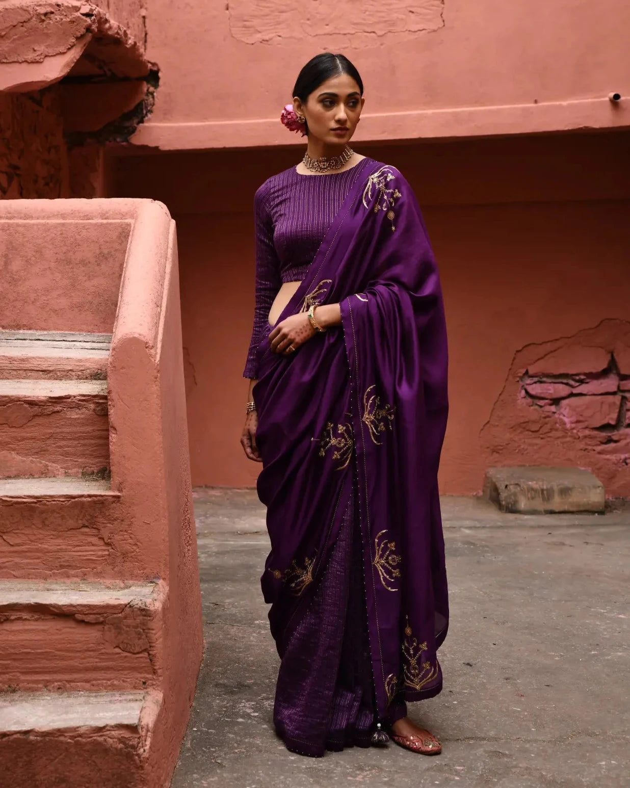 This luxurious aubergine saree features large Kalyani boota embroidery in radiant zari and zardosi, beautifully crafted on a design that combines half silk and half silk striped fabric. The rich color and intricate embroidery create a stunning visual appeal, perfect for festive occasions and celebrations. Paired with a matching striped full-sleeves blouse, this ensemble offers a sophisticated and elegant look. The lightweight silk drapes gracefully, ensuring comfort while exuding opulence, making this saree a timeless addition to your wardrobe.