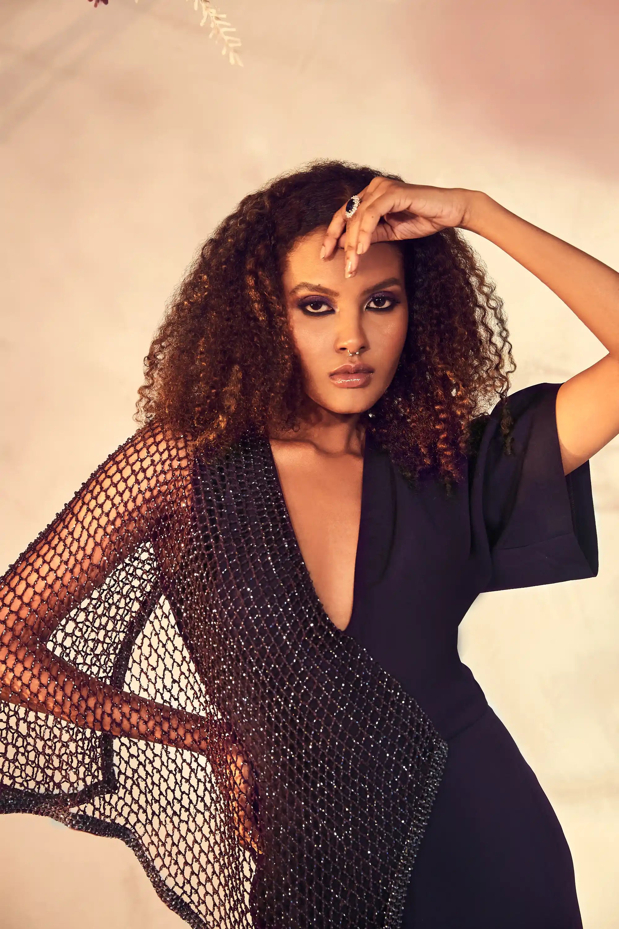 Make a statement in this classy aubergine-hued Italian crepe jumpsuit, designed to impress with its exquisite handmade geometric latticework adorned with shimmering beads and crystals. The sleek silhouette flatters your figure while offering a modern, sophisticated look. Perfect for upscale events or evening outings, this jumpsuit combines elegance with a touch of artistic flair, ensuring you stand out in style.
