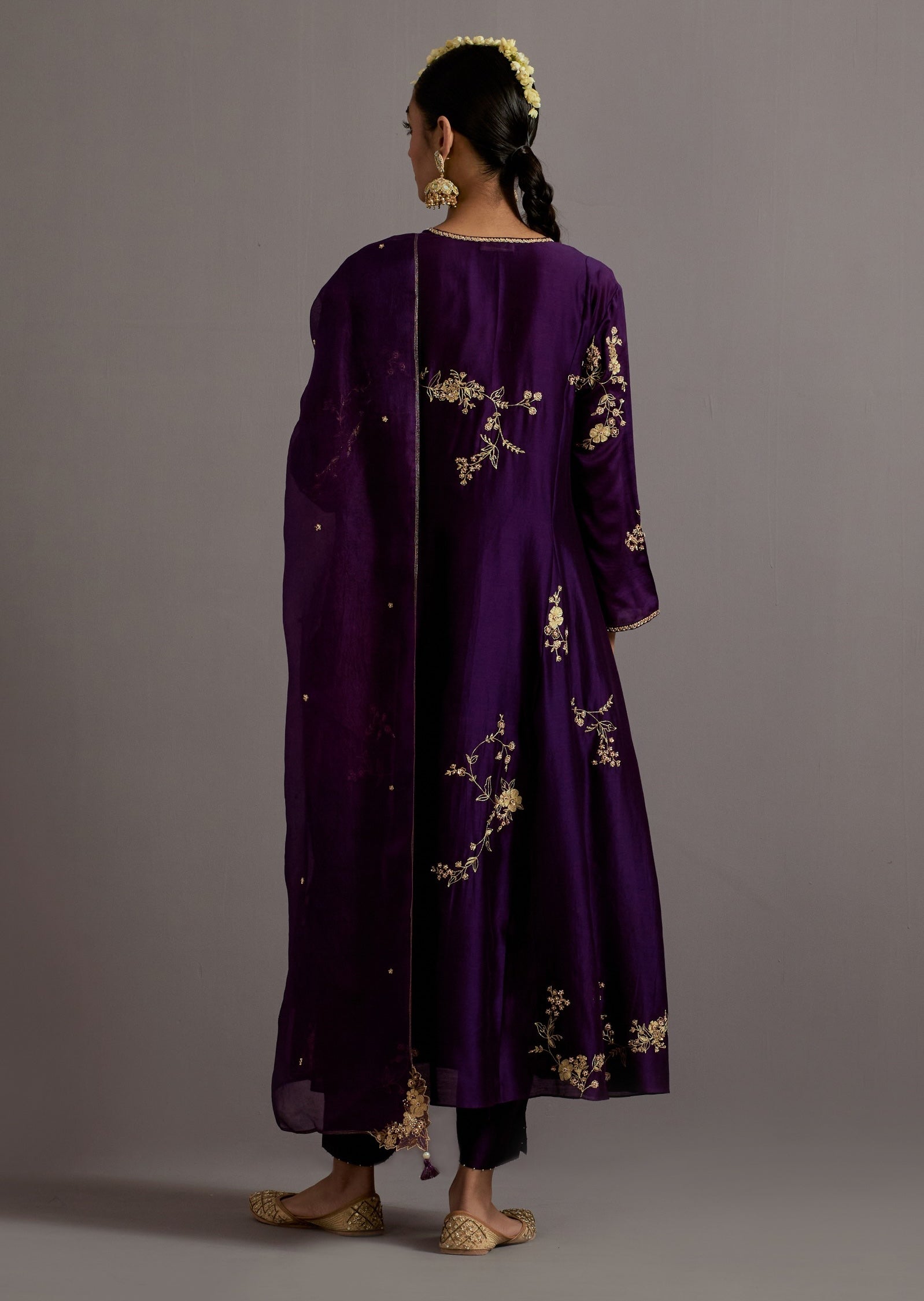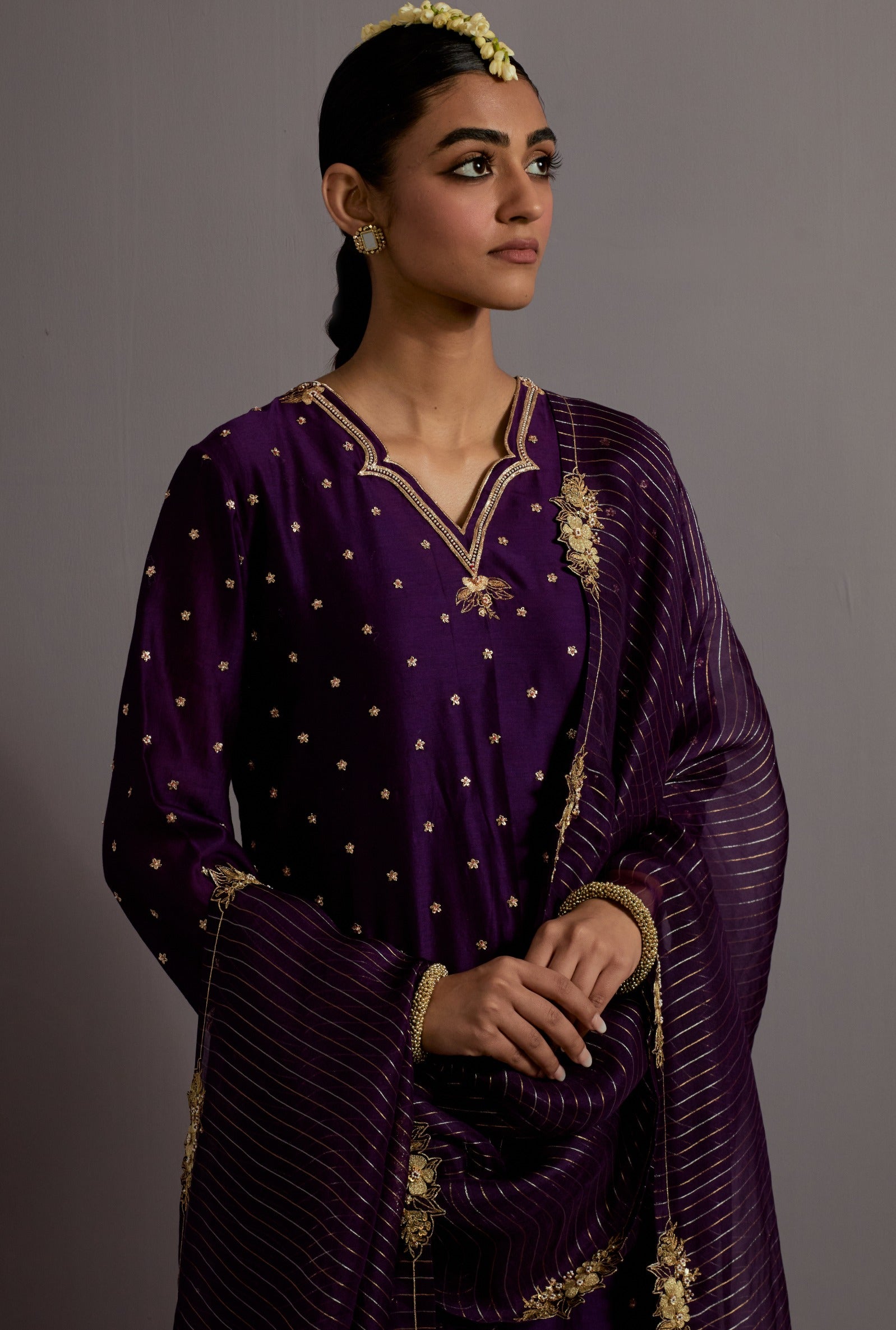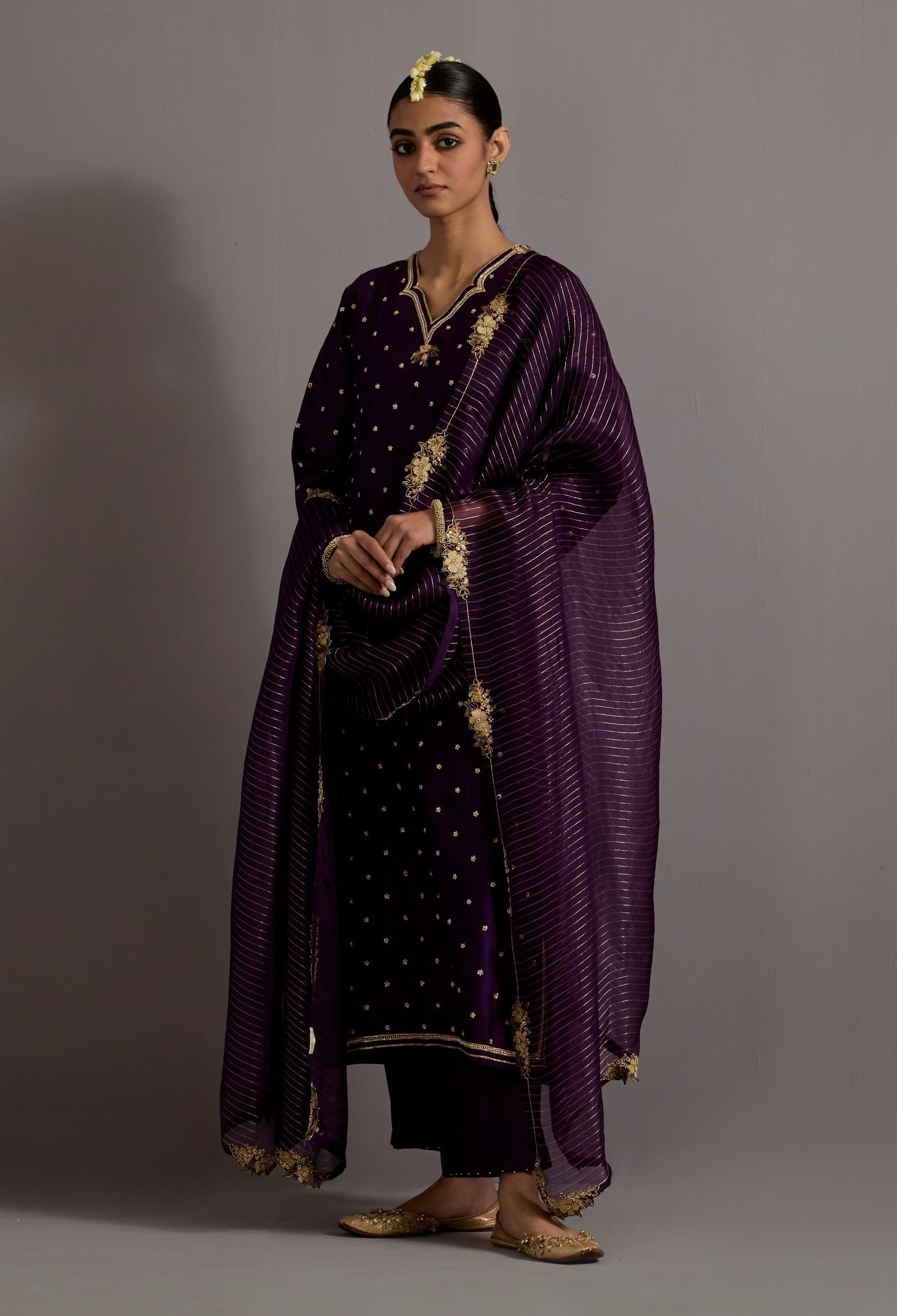 Discover timeless elegance with our aubergine straight kurta, beautifully adorned with all-over zardosi phool booti and moti line embroidery on the neckline and hem. Paired with matching straight pants, this ensemble is complemented by a zari-woven organza dupatta featuring intervally embroidered guccha borders. Perfect for any special occasion, it combines intricate detailing with sophisticated design for a truly refined look.